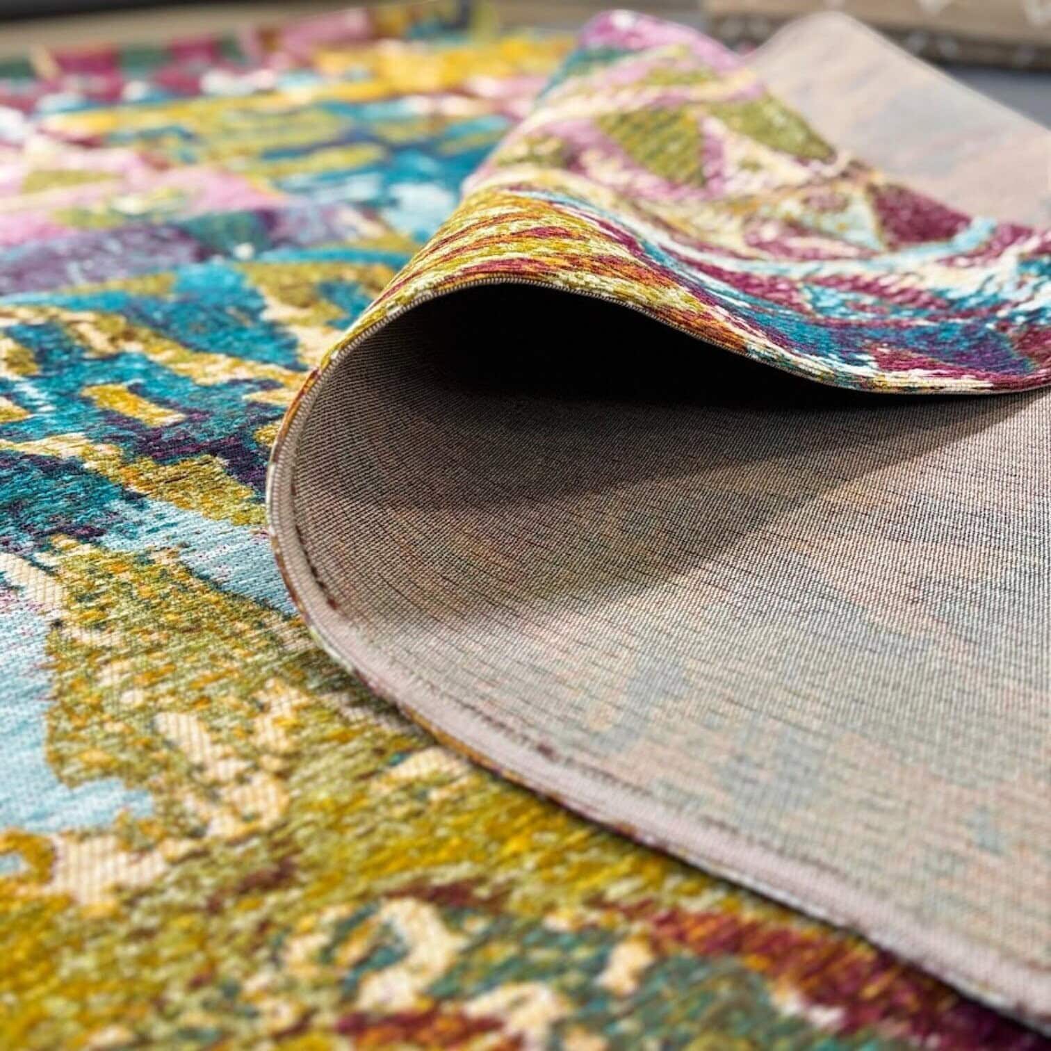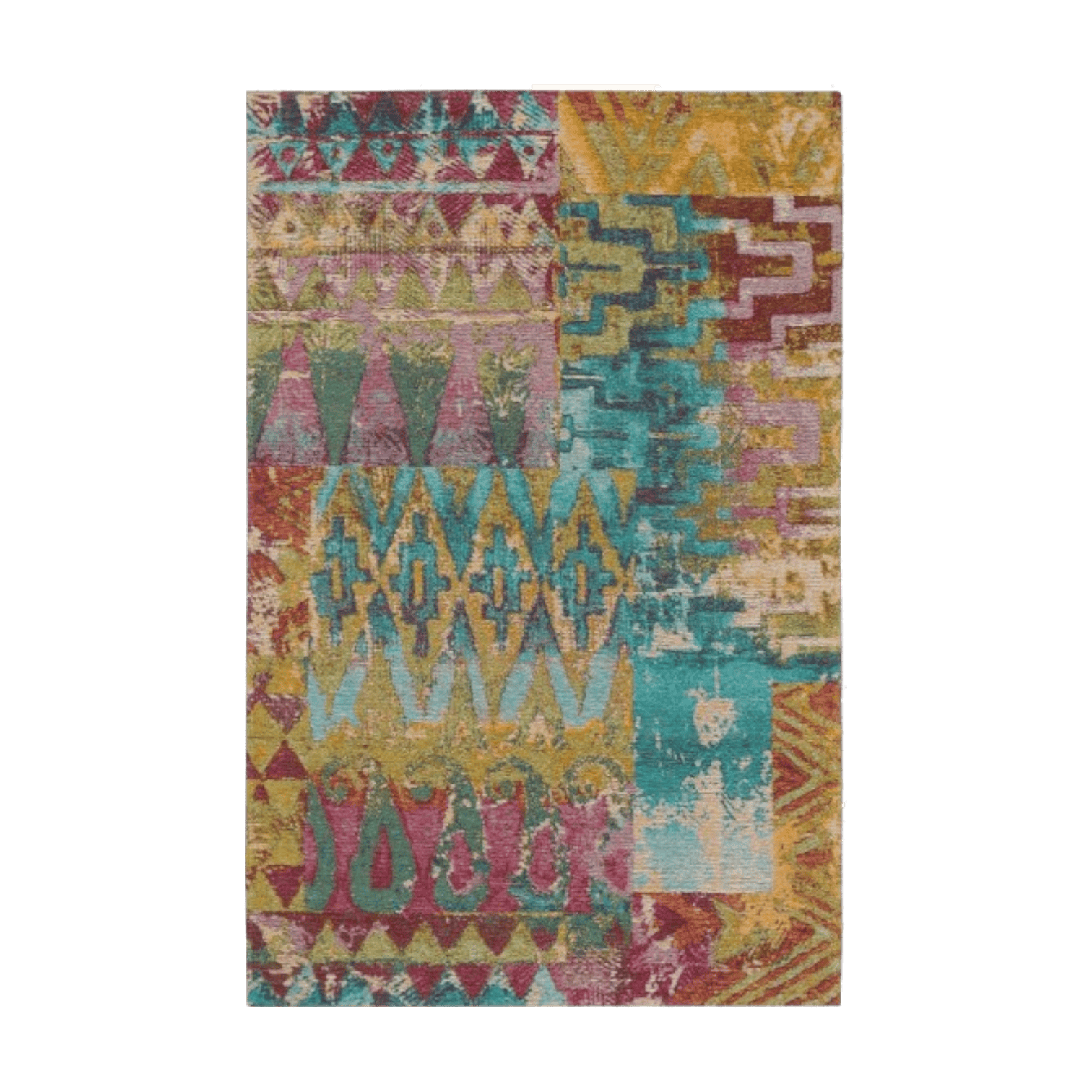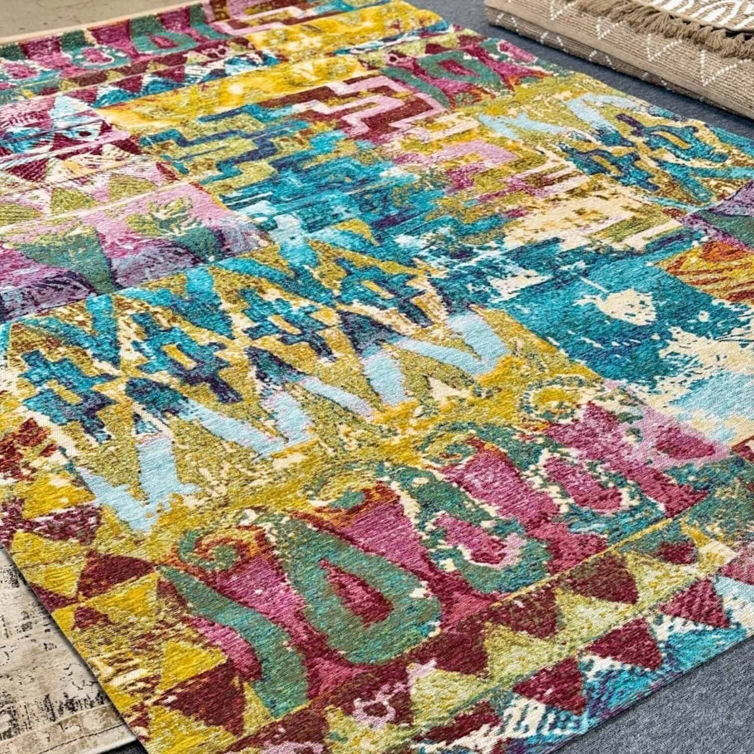 Paklājs Frencie ir košs, rakstains paklājs, kas kļūs par īstu interjera akcentu. Ar savu izteiksmīgo krāsu paleti un ģeometriskiem rakstiem tas piešķir telpai dinamiku un mājīgumu, vienlaikus saglabājot modernu boho noskaņu.