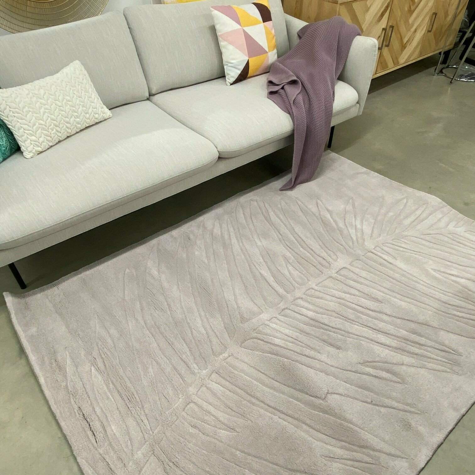 Pelēkais akrila paklājs, ar palmas lapas rakstu, interjerā ienesīs interesantu, maigu akcentu. Pelēkas krāsas paklājs iederēsies jebkurā dzīvojamā istabā.