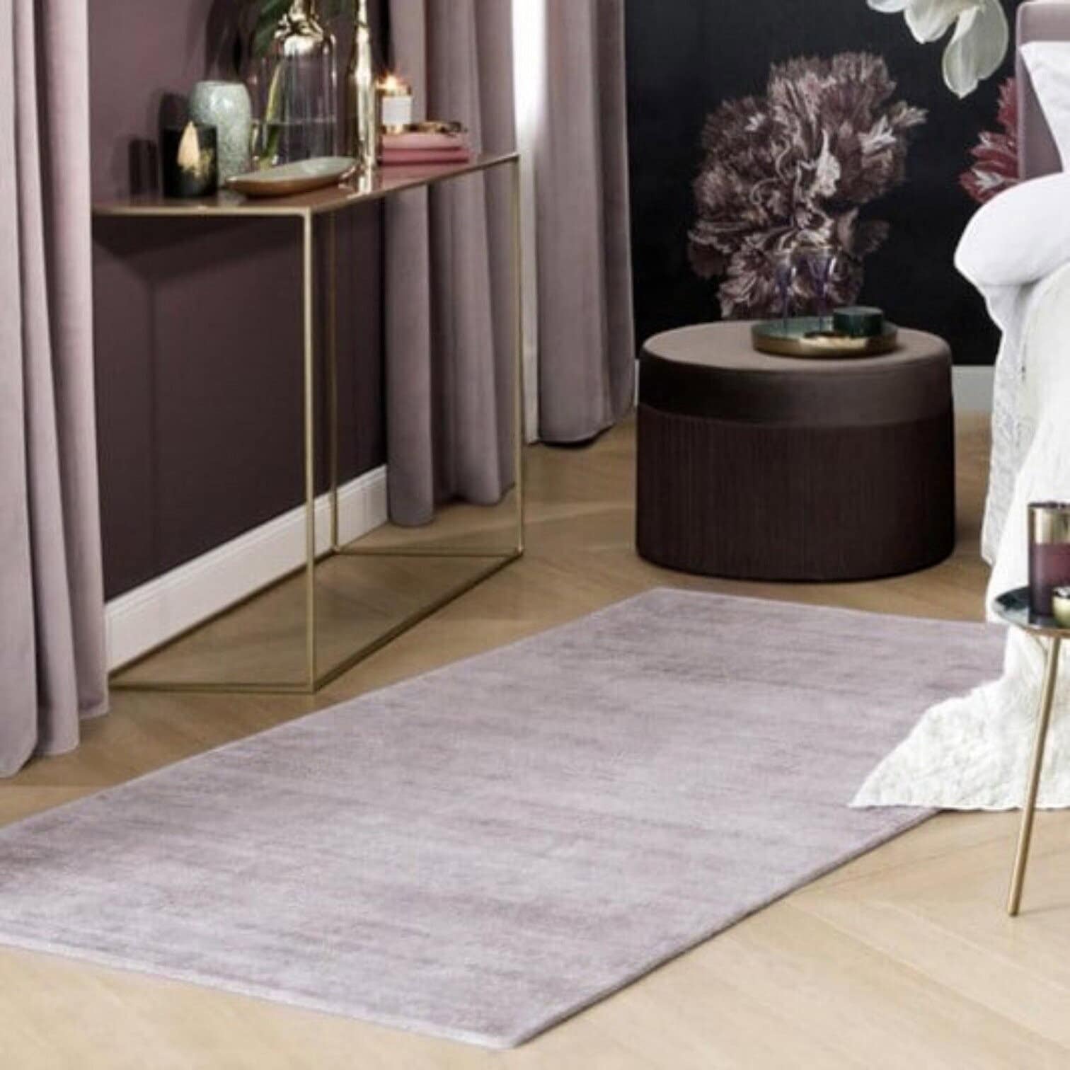 Paklāja zemais, neregulāri strukturētais augstums nodrošina vieglu kopšanu, bet viskozes materiāls piešķir izsmalcinātu eleganci un krāsu nianses. Krāsa maigi mauve tonī ar gaisīgi bēšiem atspīdumiem padara to par harmonisku akcentu jebkurā telpā – viesistabā, guļamistabā vai hallē.