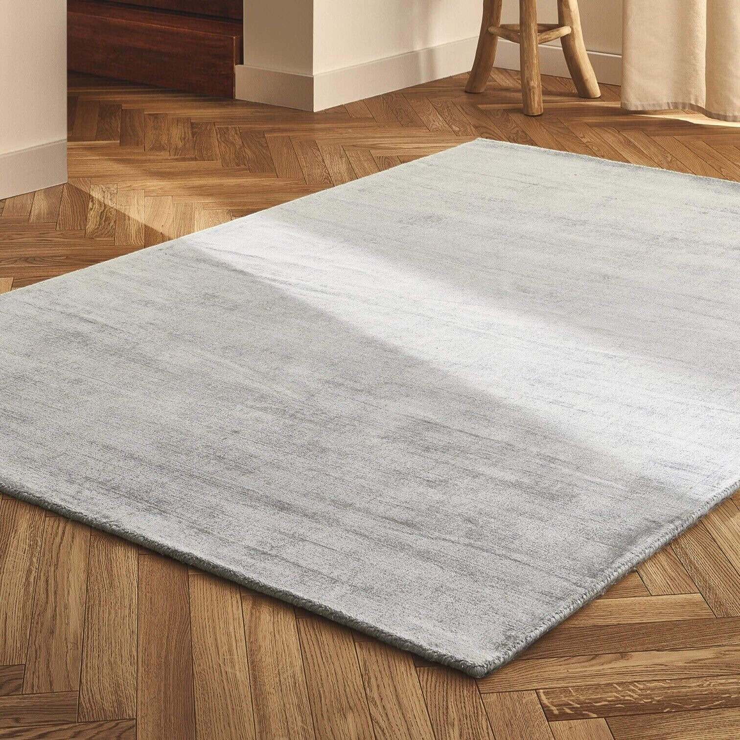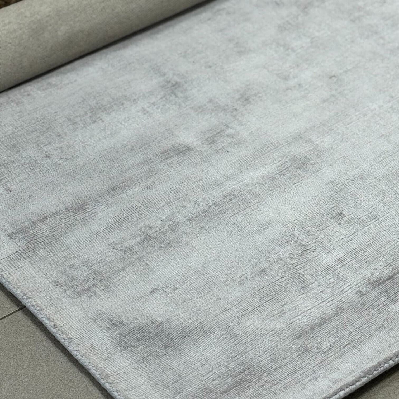 Paklājam ir zems, roku austs viskozes plūksnojums, kas gaismā spīd dažādos toņos, radot niansētu, viegli mainīgu efektu. Viskoze izceļas ar īpašu krāsu intensitāti un elegantu mirdzumu, kas lieliski papildina paklāja light grey krāsu.