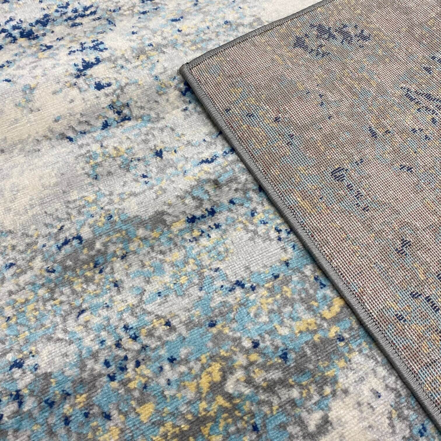Šis stilīgais iekštelpu paklājs Jassi piedāvā mūsdienīgu abstraktu pelēku-zilu rakstu, kas piešķir telpai gan modernu, gan siltu noskaņu.