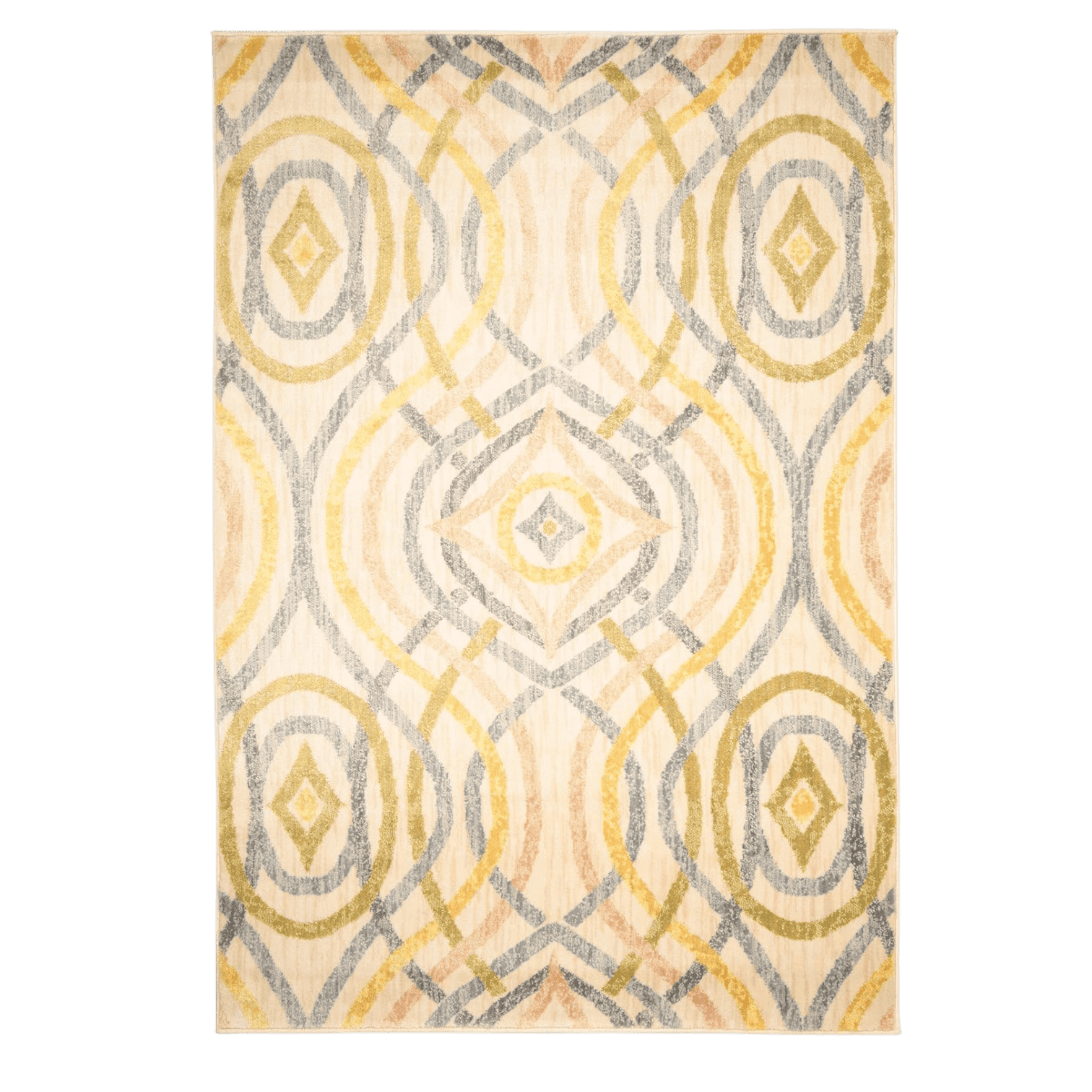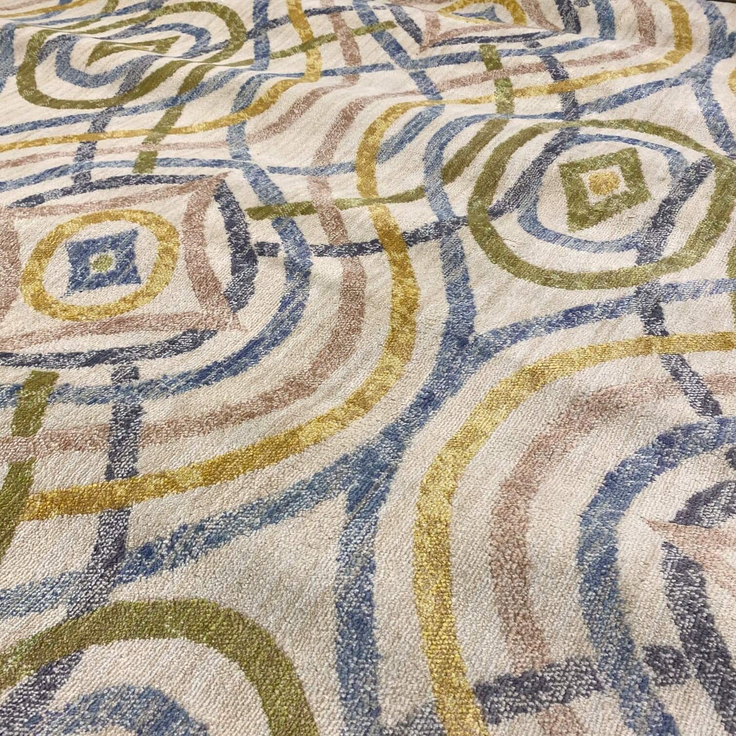 Piešķiriet savam interjeram eleganci un mājīgumu ar šo stilīgo poliestera paklāju. Tā modernajā dizainā apvienoti ģeometriski raksti siltos bēšos, zelta, zilajos un olīvzaļajos toņos, kas lieliski papildinās gan klasisku, gan mūsdienīgu interjeru.