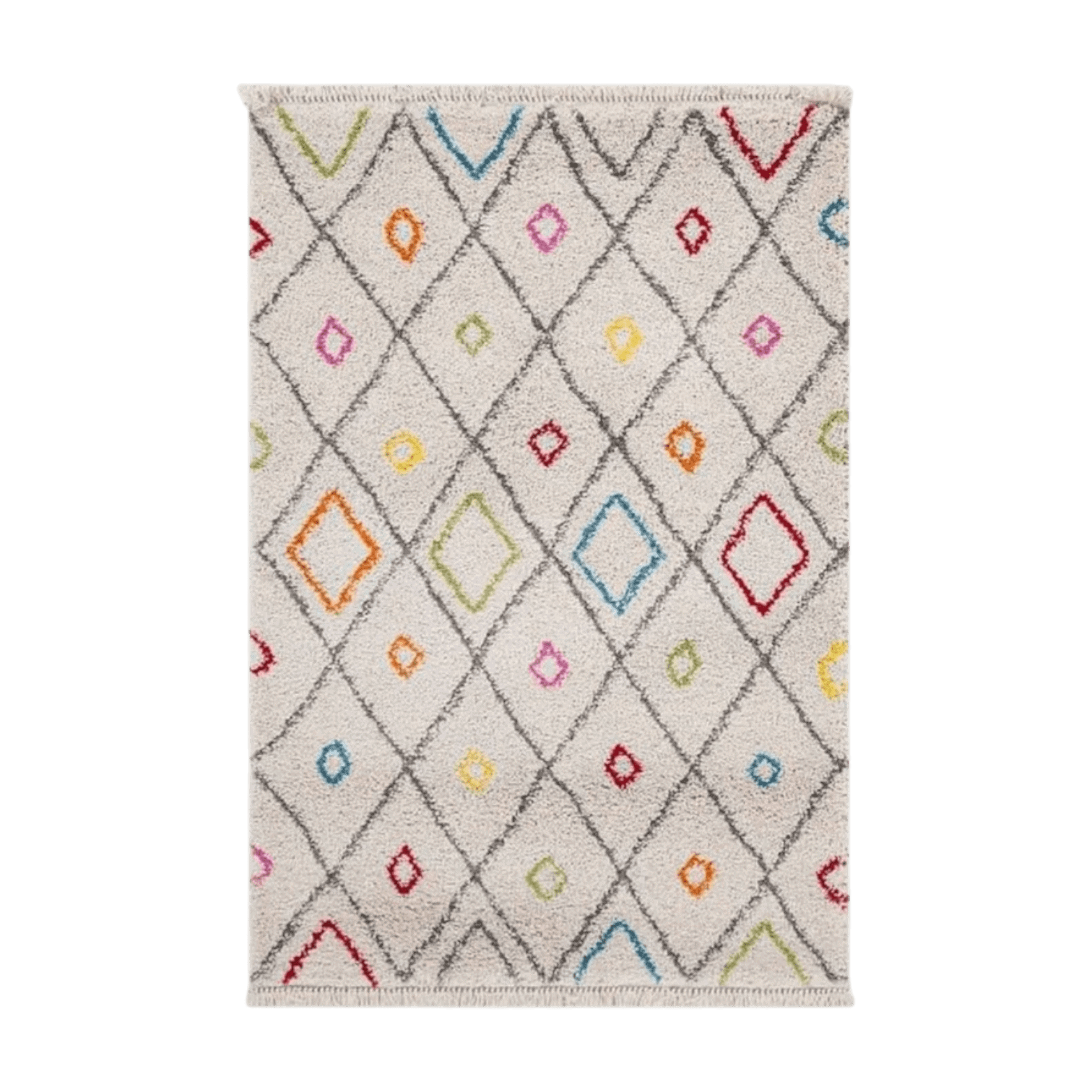 Mūsdienīgs un mājīgs paklājs ar gaišu pamattoni un dekoratīvu ģeometrisku rakstu. Smalks režģa dizains ir papildināts ar krāsainiem akcentiem, kas piešķir interjeram dzīvīgumu un rotaļīgumu, vienlaikus saglabājot gaumīgu līdzsvaru. Paklājs lieliski iederēsies viesistabā, guļamistabā vai bērnu istabā.