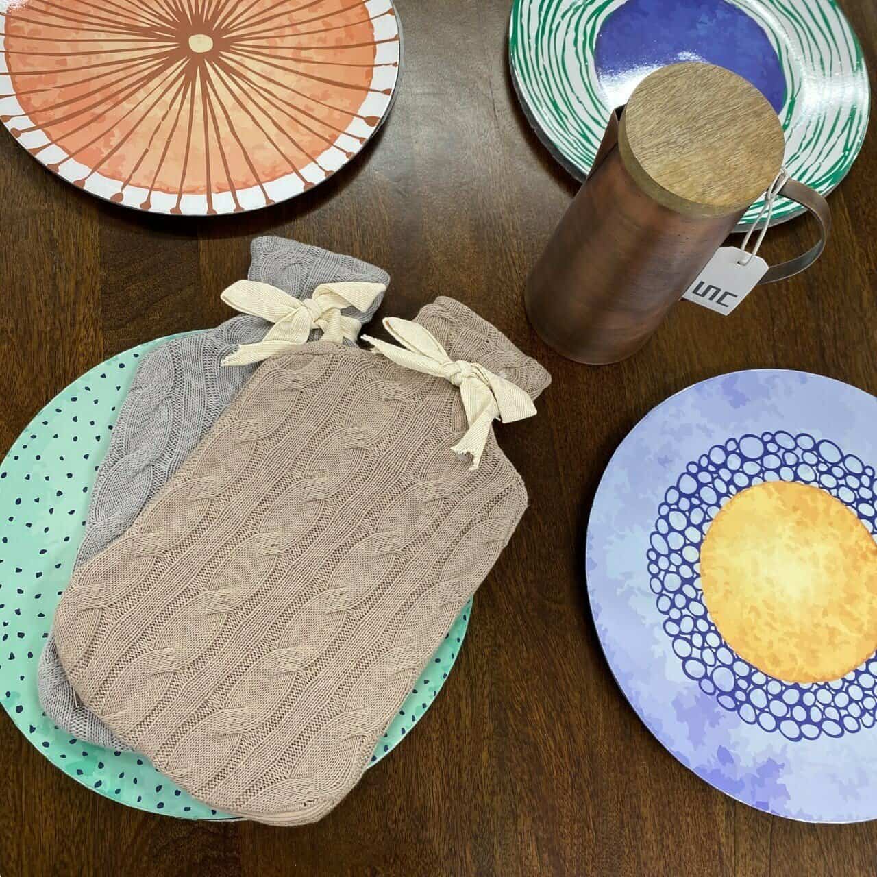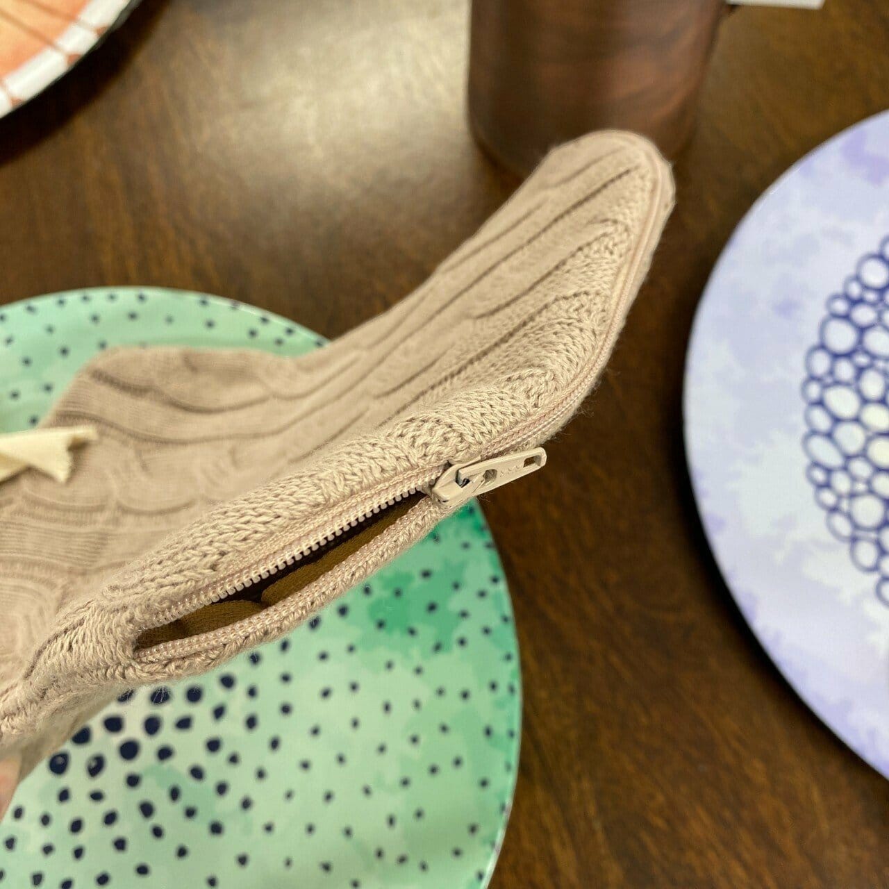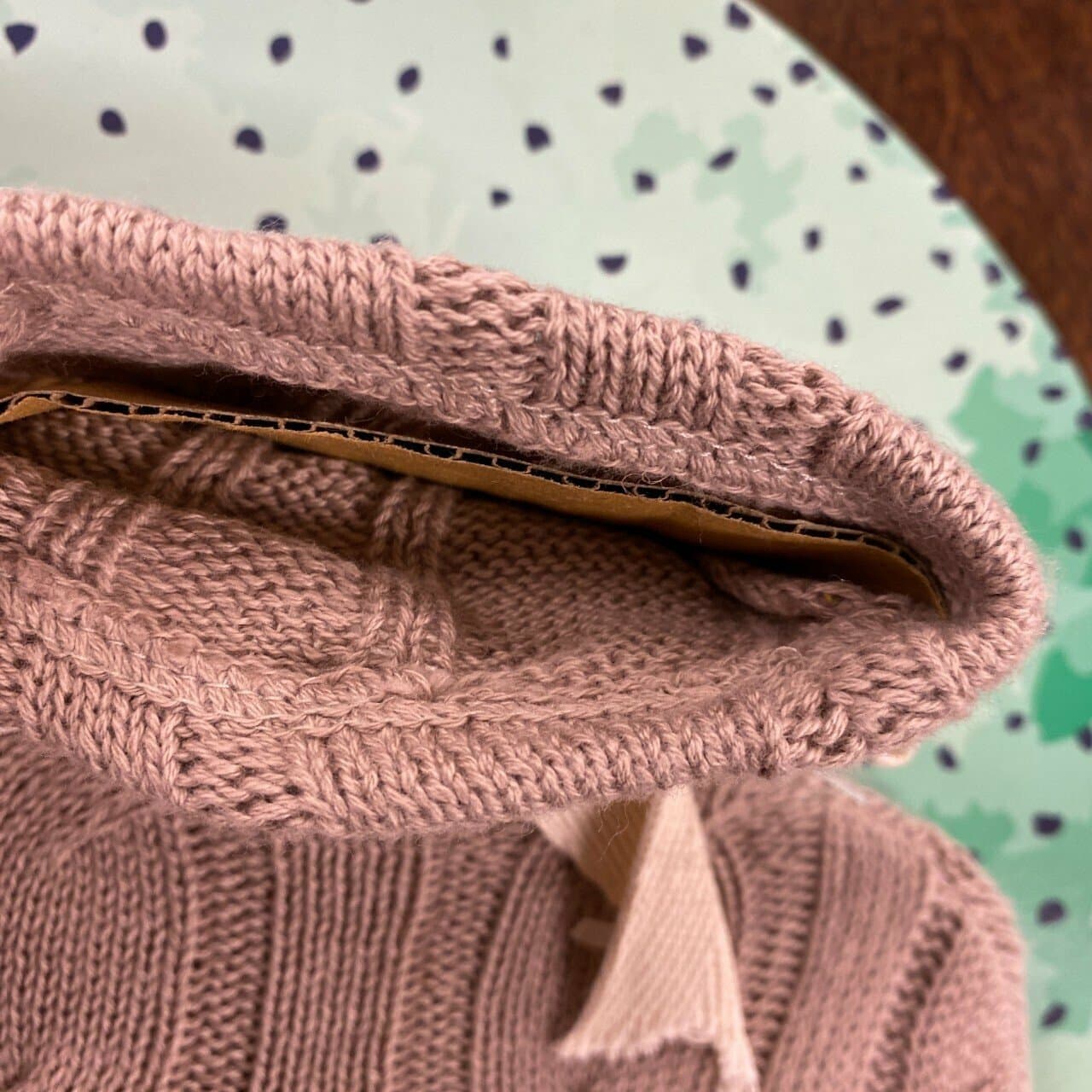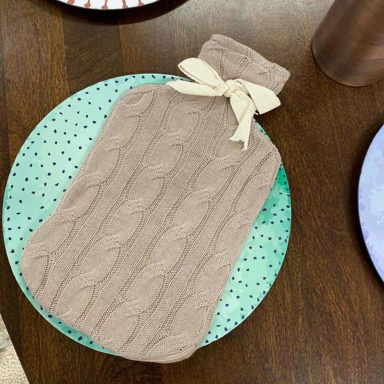 Kokvilnas adījuma pārvalks ar bizes pīnītes rakstu. Platākajā pusē ir iestrādāts rāvējslēdzējs, lai var ievietot sildošo pudeles termosu.