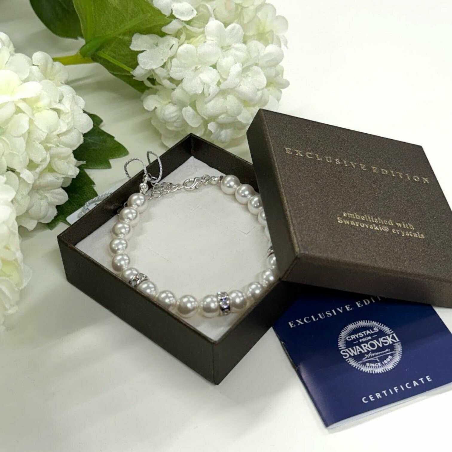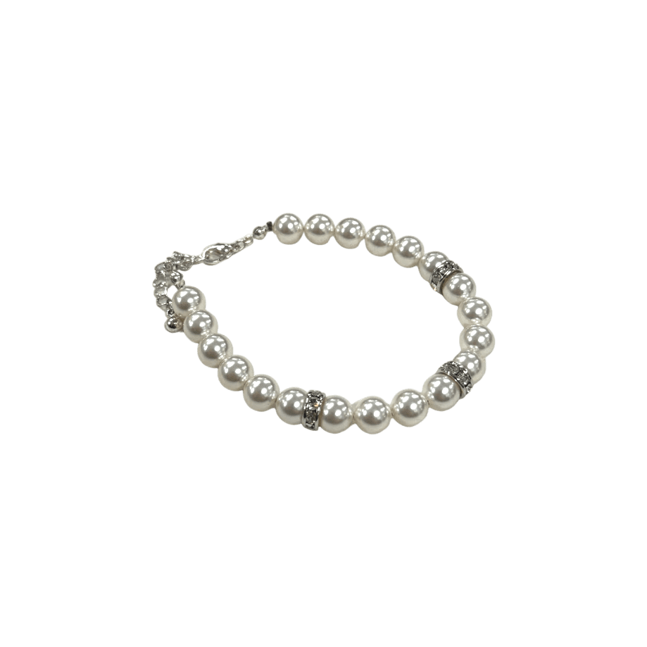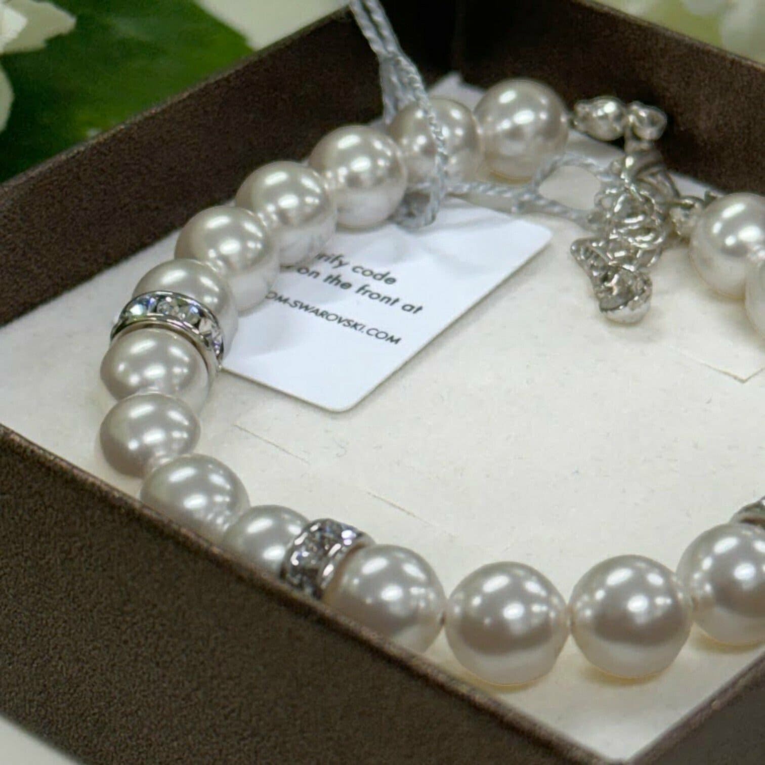 Šī elegantā pērļu rokassprādze ar Swarovski kristāliņiem ir no ekluzīvas kolekcijas. Ar savu eleganto materiālu sajaukumu šī izsmalcinātā rokassprādze ir tāda, ko jūs vienmēr cienīsit. Baltās pērles, ko ieskauj dzidri kristāli. Ap plaukstas locītavu smalka 925 sudraba ķēdīte kalpo kā aizdare, kam viegli pielāgot vēlamo rokassprādzes garumu. Šī aproce ir graciozākais un izsmalcinātākais veids, kā svinēt savu mīlestību pret pērlēm.