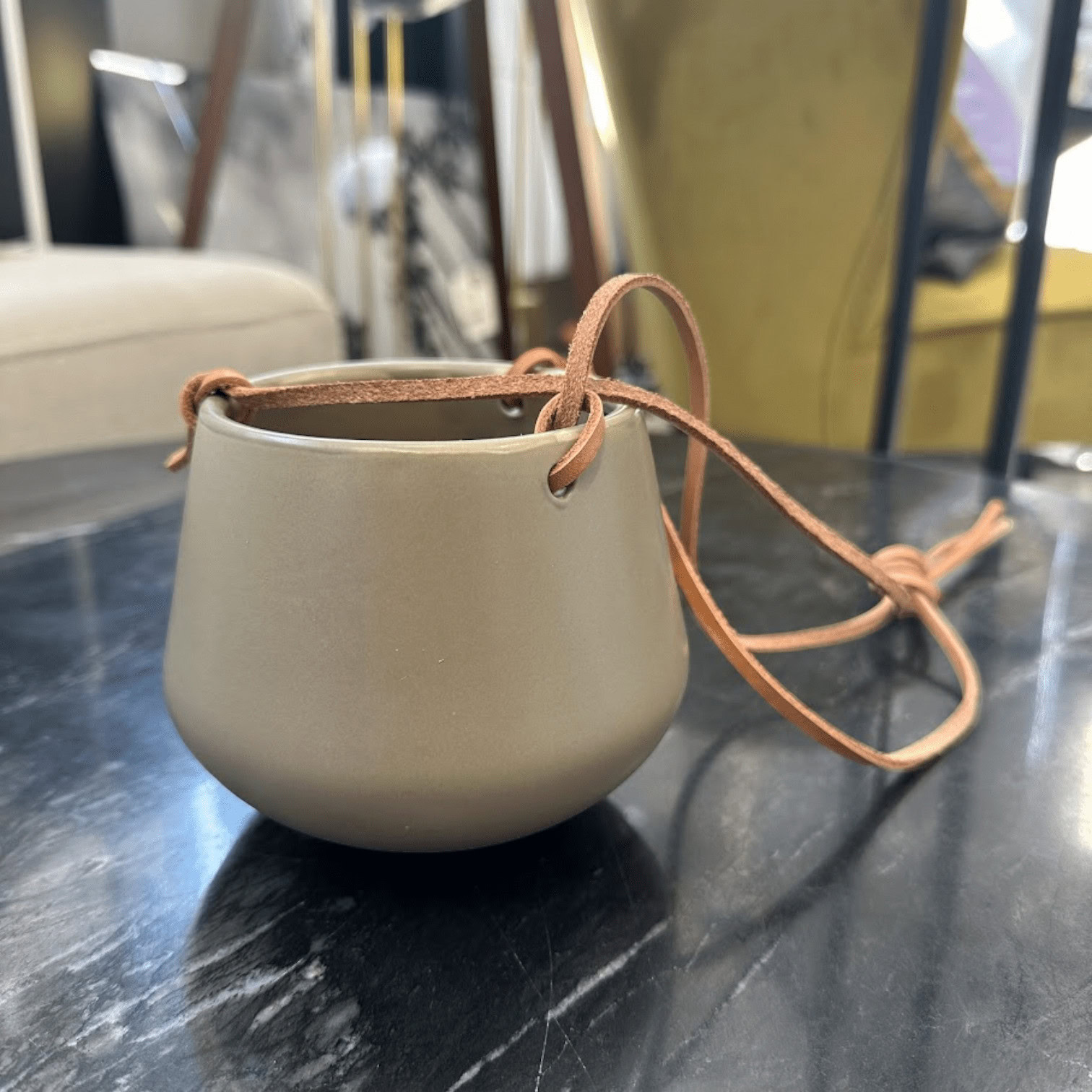 Šis piekarināmais pods ir ideāli piemērots sukulentu un piekaramo augu demonstrēšanai. Šis skaistais puķu pods izskatīsies labi dažāda izmēra kompozīcijas vai arī viens pats, tas būs īsts acu piesaistītājs. Ādas stiprinājumi ir 66cm gari.