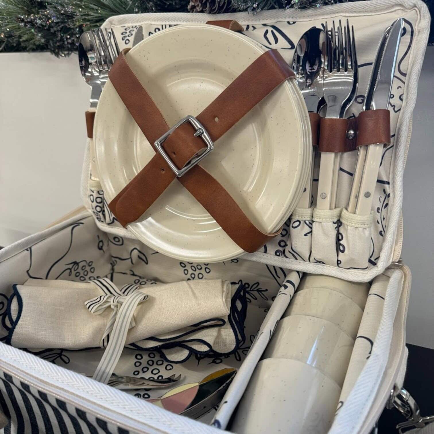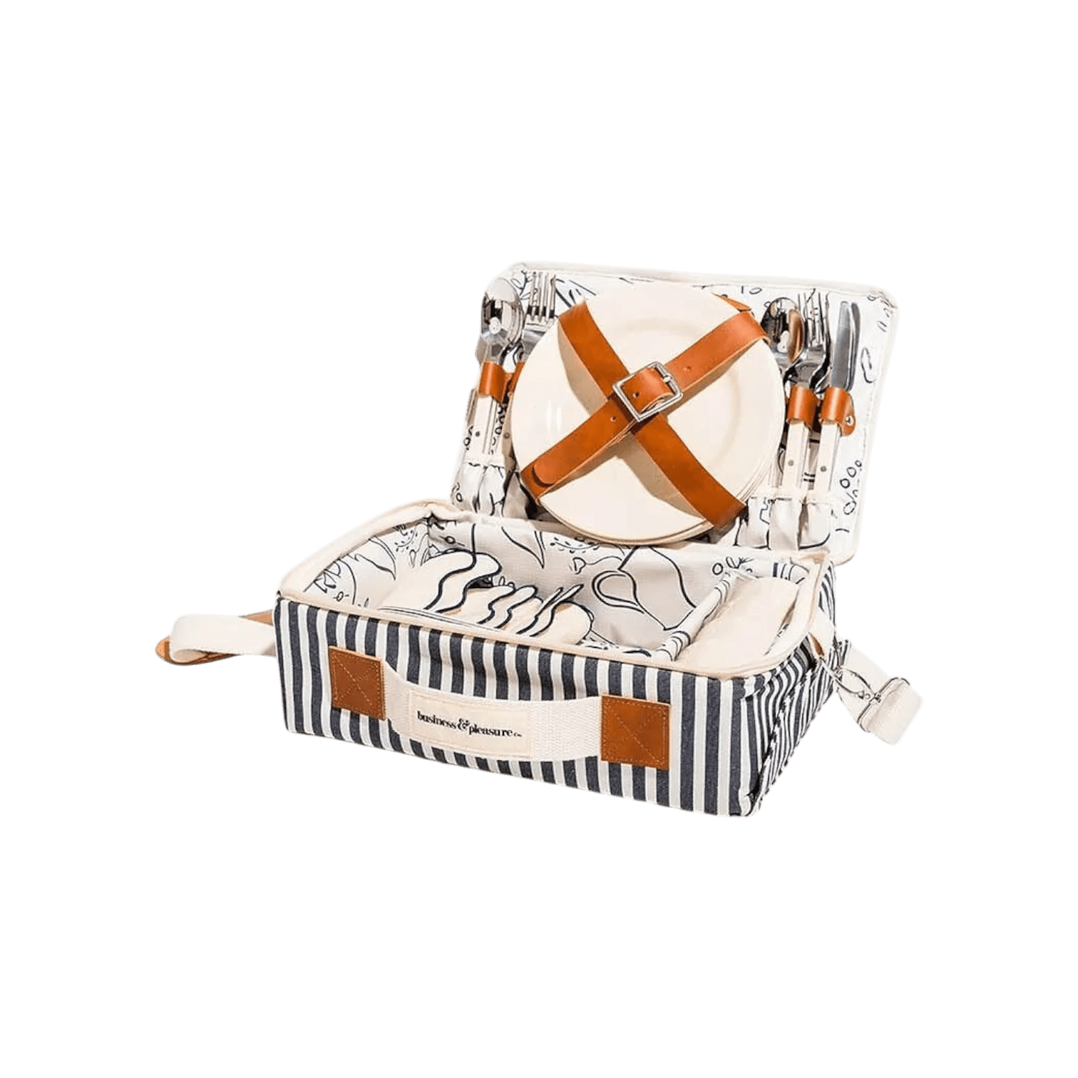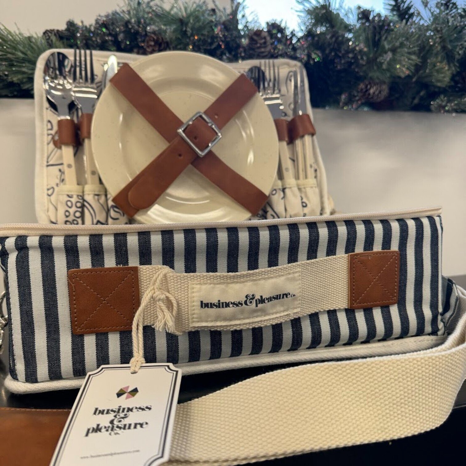 Šis elegantais un praktiskais piknika komplekts, ko izveidojis uzņēmums Business & Happy Co., liks vēl vairāk izbaudīt skaistu dienu brīvā dabā. Svītrainā audekla un mākslīgās ādas somā ar rāvējslēdzēju ir viss nepieciešamais, lai baudītu uzkodas četrām personām. Komplektam piemīt vintage izskats.