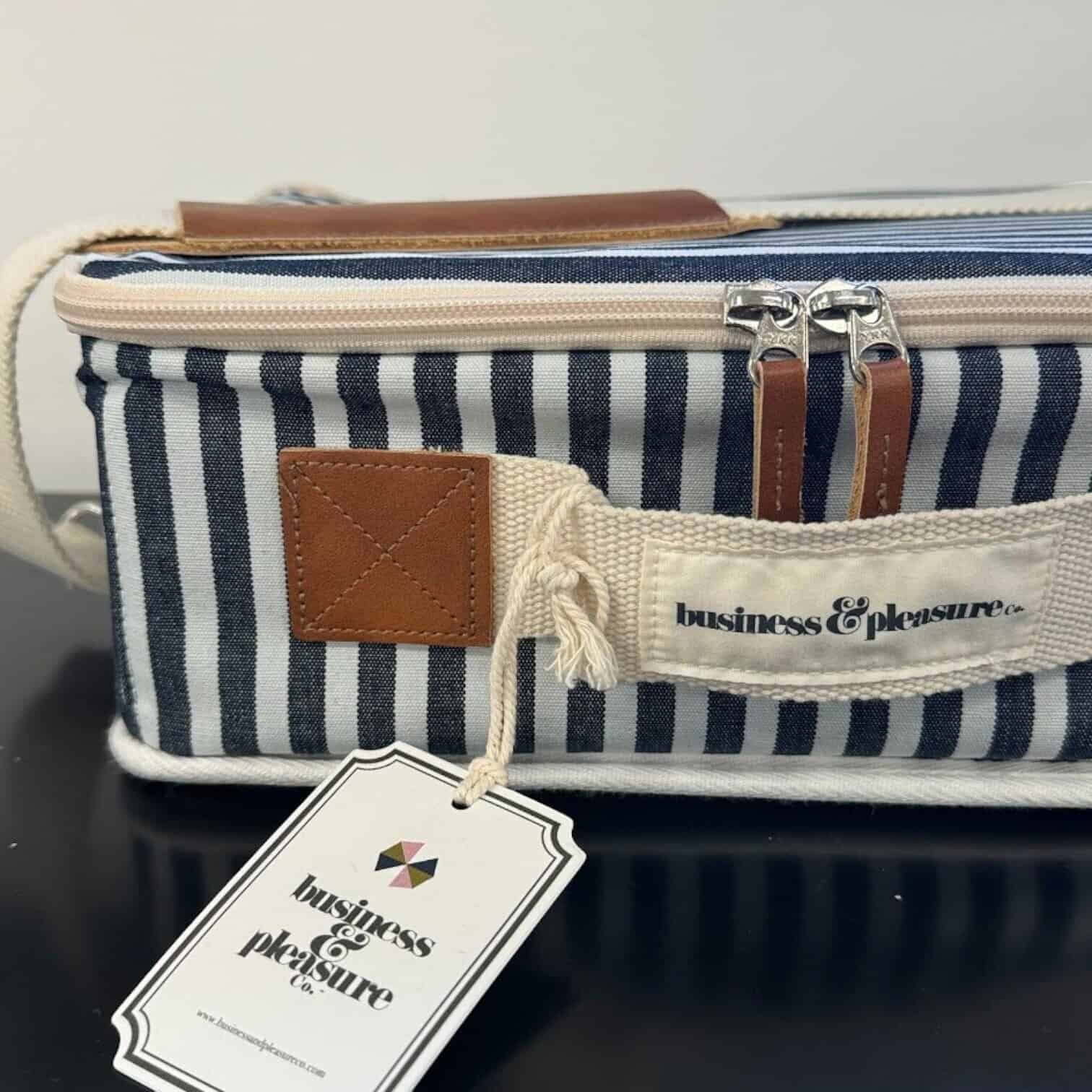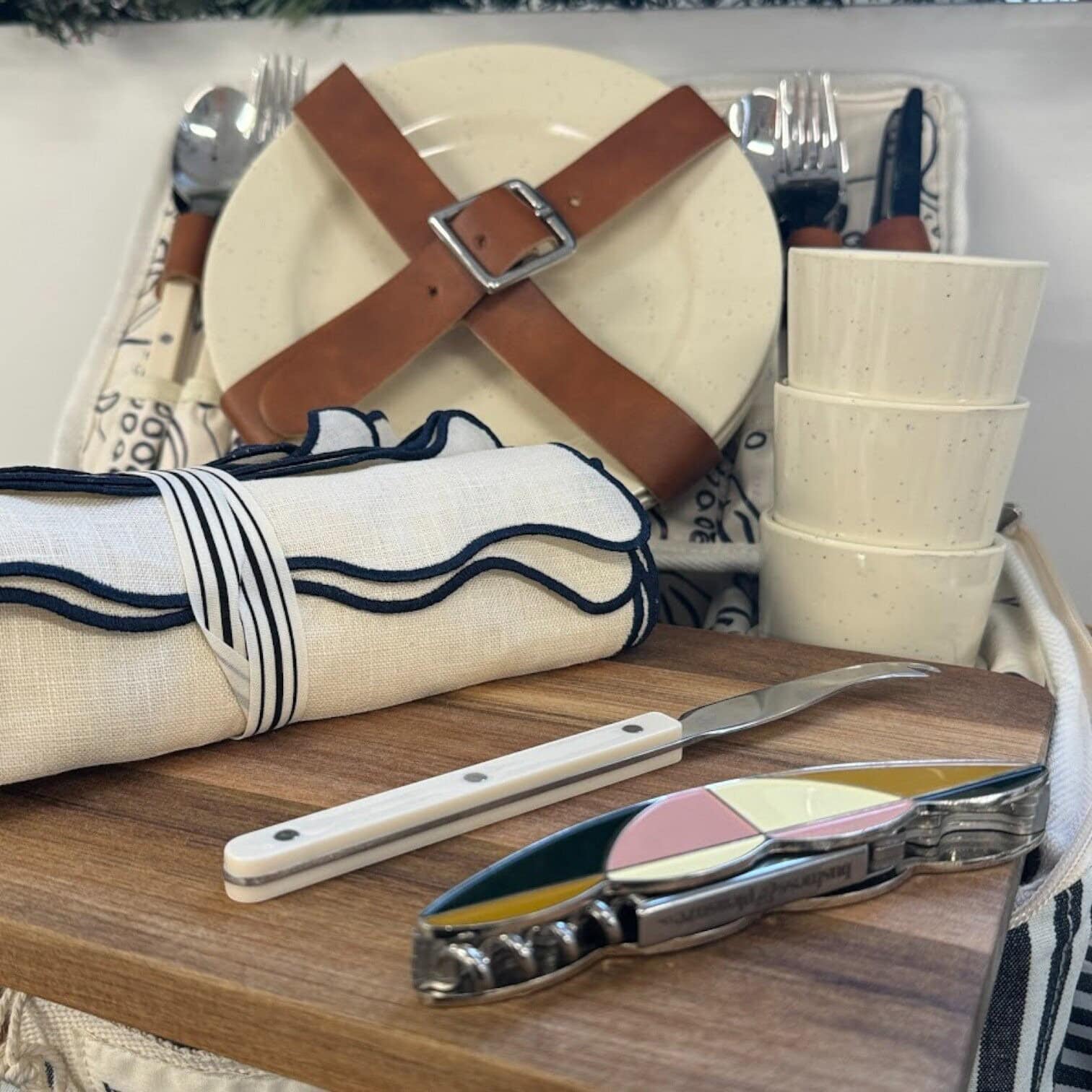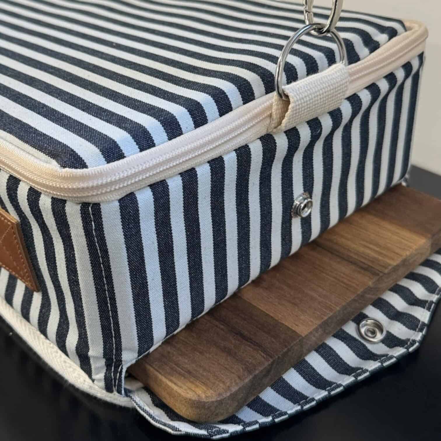 Šis elegantais un praktiskais piknika komplekts, ko izveidojis uzņēmums Business & Happy Co., liks vēl vairāk izbaudīt skaistu dienu brīvā dabā. Svītrainā audekla un mākslīgās ādas somā ar rāvējslēdzēju ir viss nepieciešamais, lai baudītu uzkodas četrām personām. Komplektam piemīt vintage izskats.