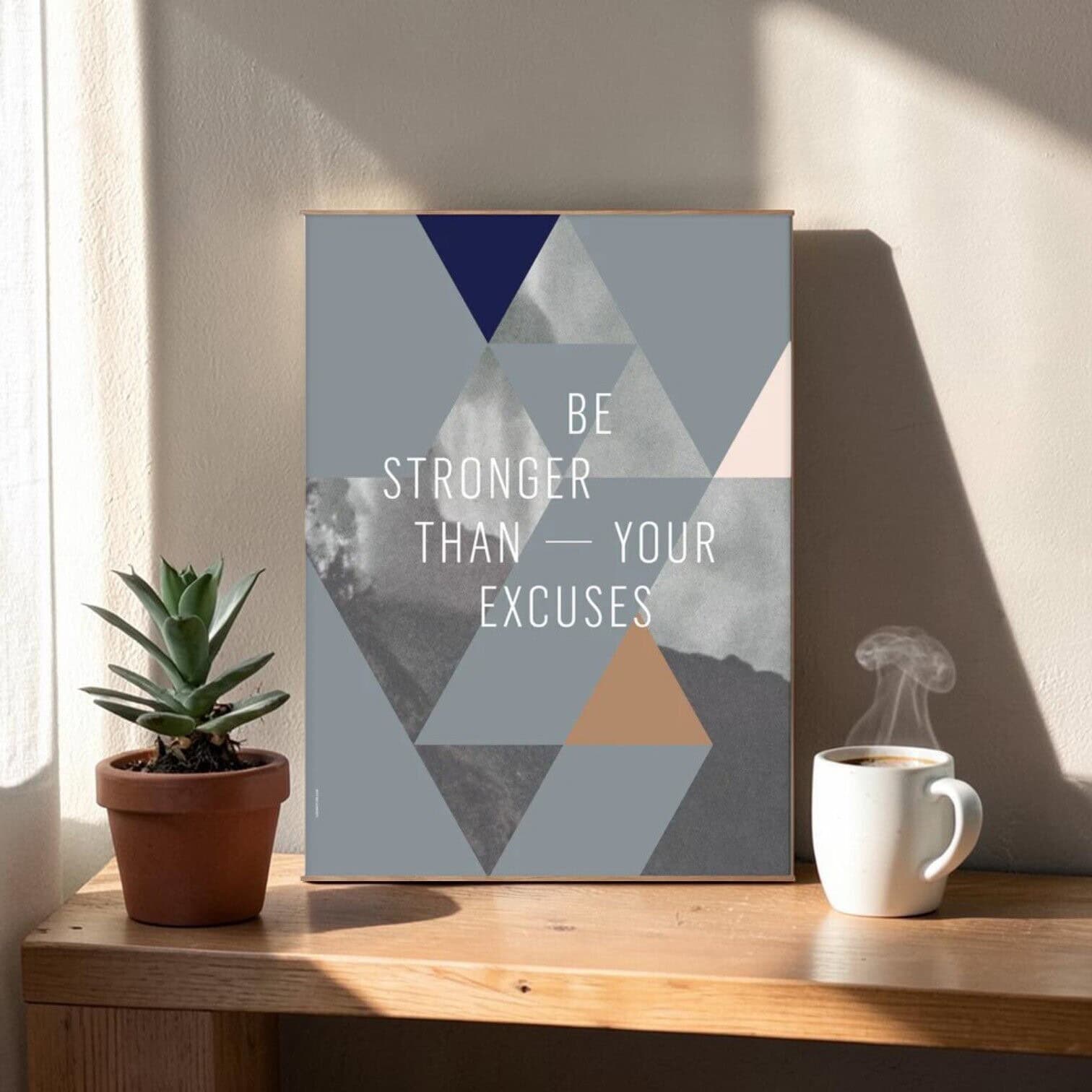 Tipogrāfisks plakāts ar tekstu- Be stronger than your excuses (esi stiprāks par saviem attaisnojumiem)