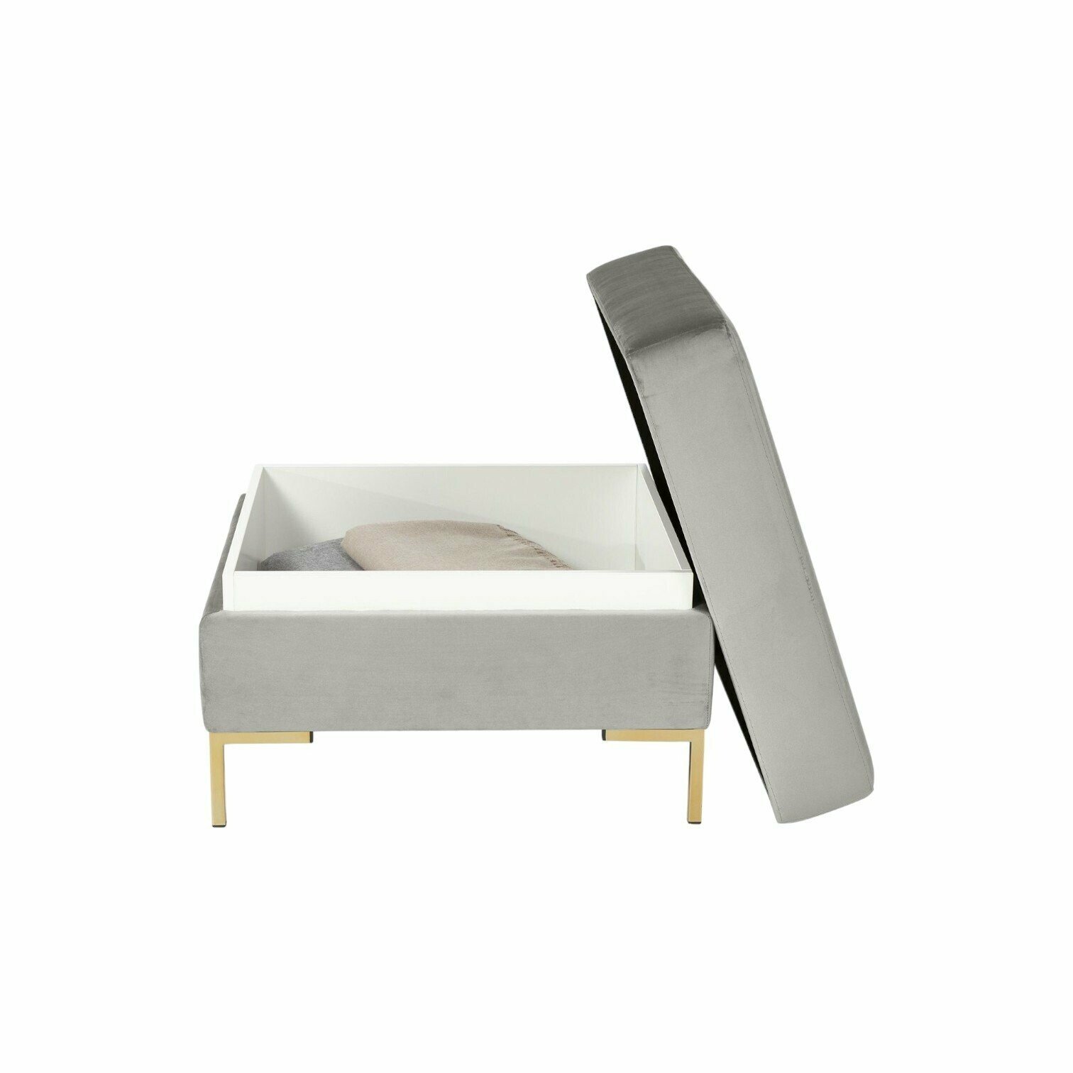 Šis pelēkais samta pufs ir gan skaists interjera elements, gan praktiska mēbele. Tā dizains apvieno mīkstu samta audumu, glabāšanas kasti un izsmalcinātas zelta kājas, radot stilīgu un funkcionālu mēbeli jebkuram mājoklim.