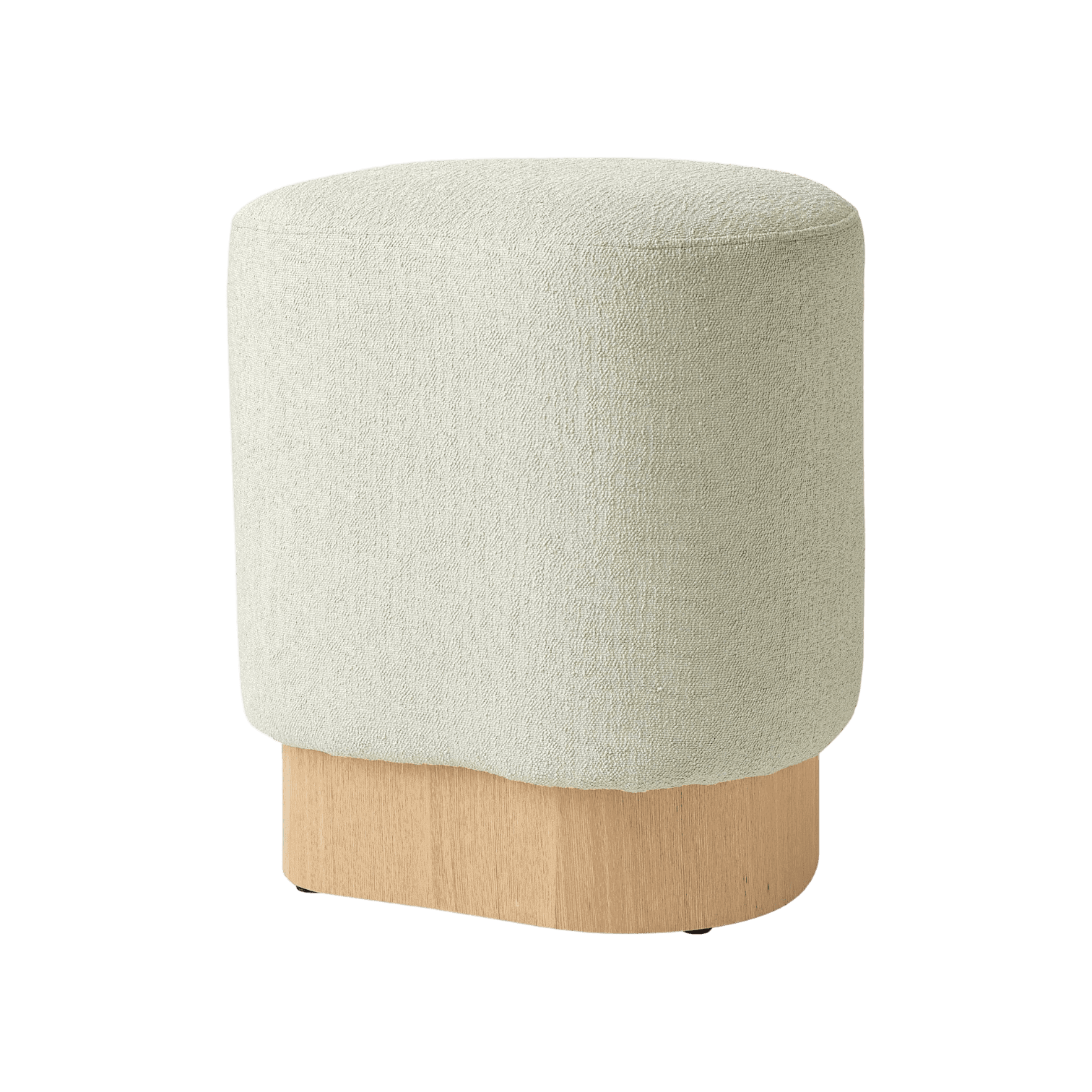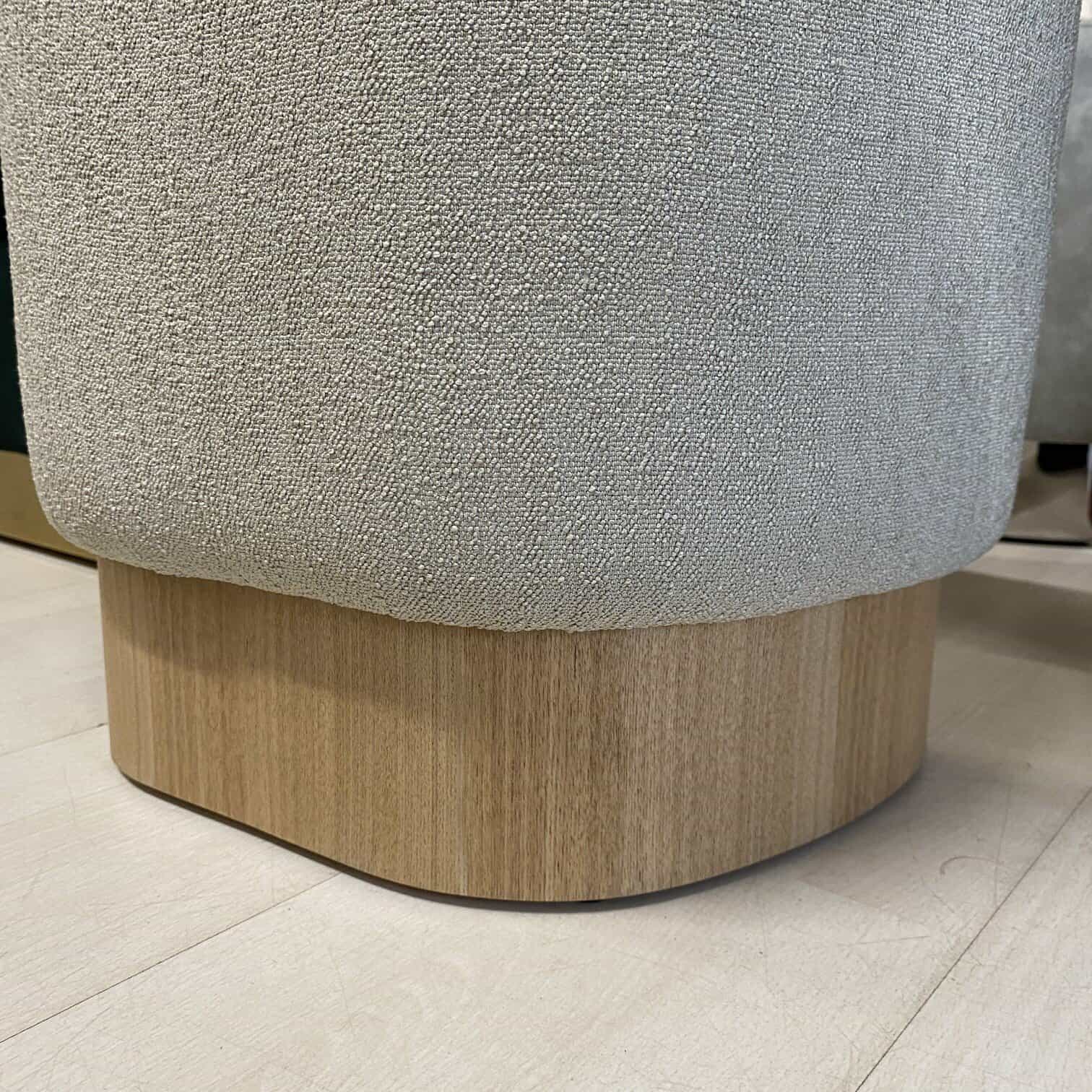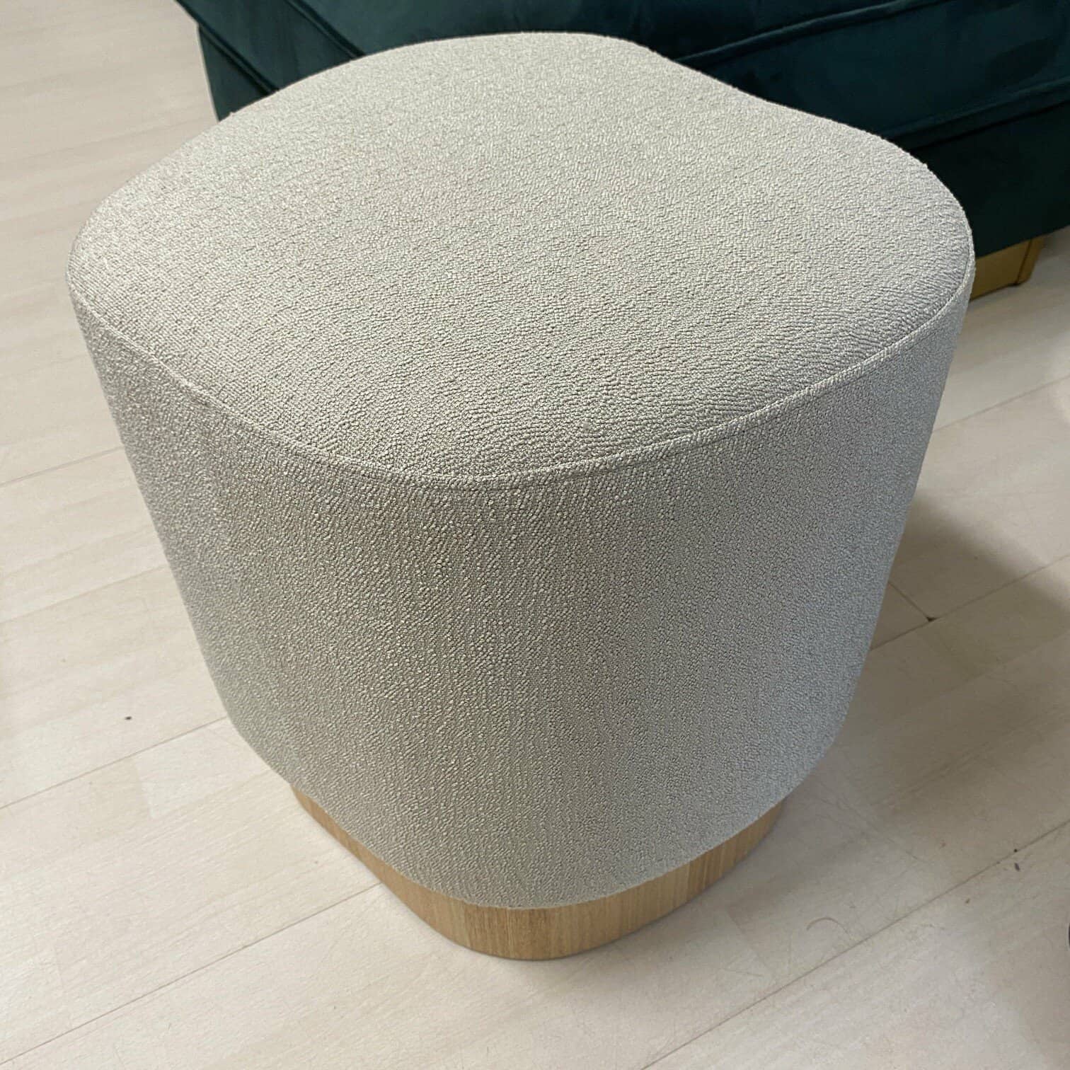 Neregulāras formas pufs ar koka pamatni, gaišā matcha zaļā krāsā. Atvēsinošs akcents tavā telpā.