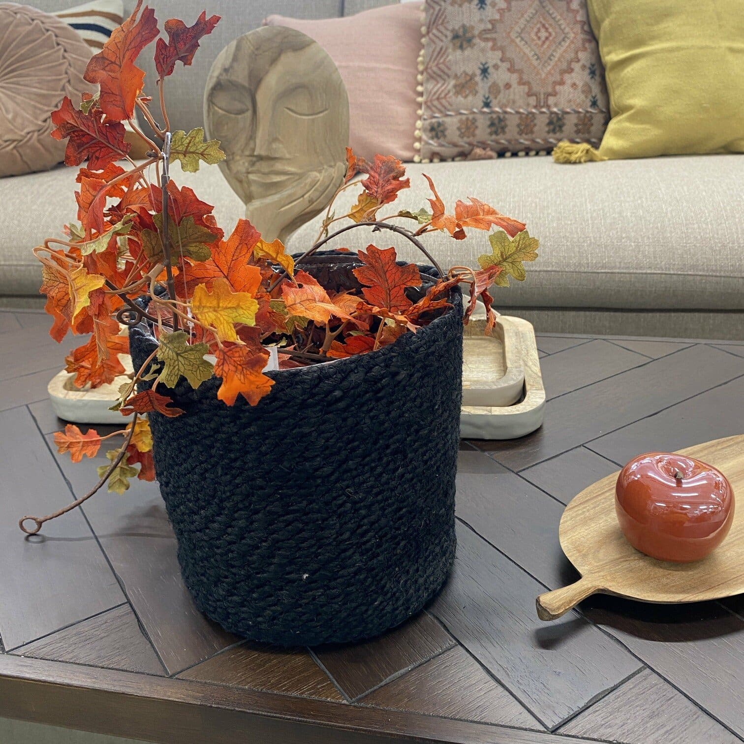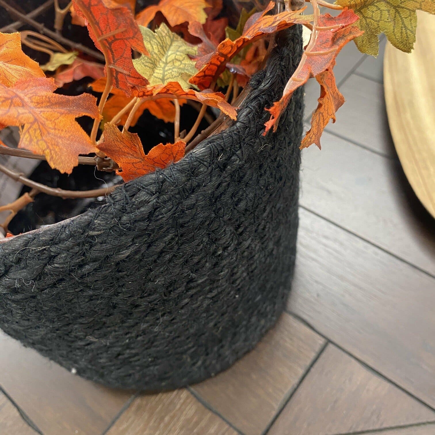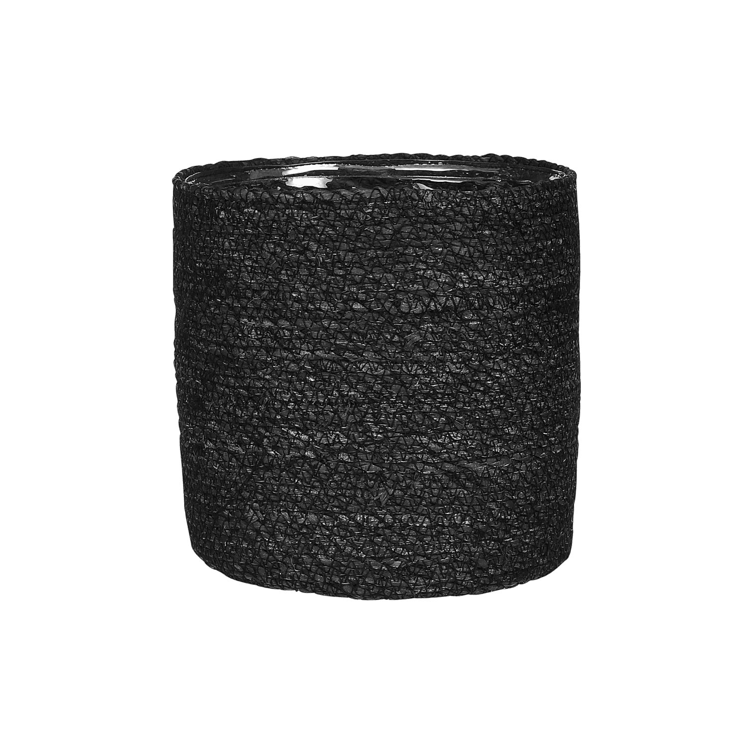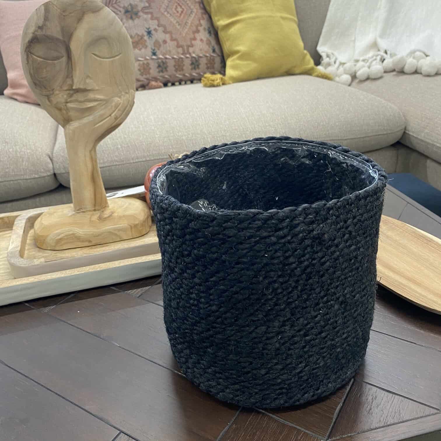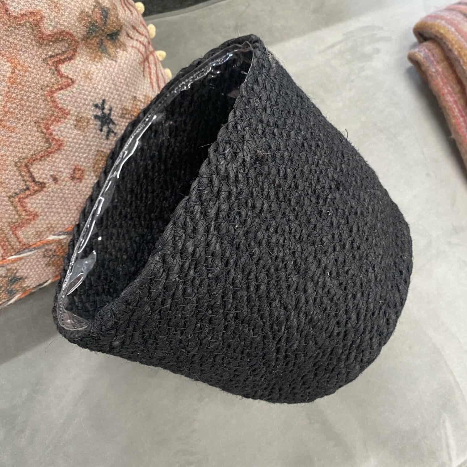 Melns džutas puķu pods ar plastmasas iekšējo apdari augsnei. Boho stila interjers būtu priecīgs par šādu papildinājumu.