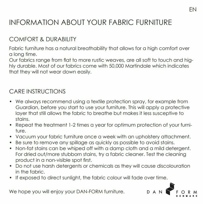 DAN-FORM izmantotais audums ir augstas kvalitātes materiāls, kas ir nodilumizturīgs gan pie lielas cilvēku plūsmas, gan arī mājas apstākļos