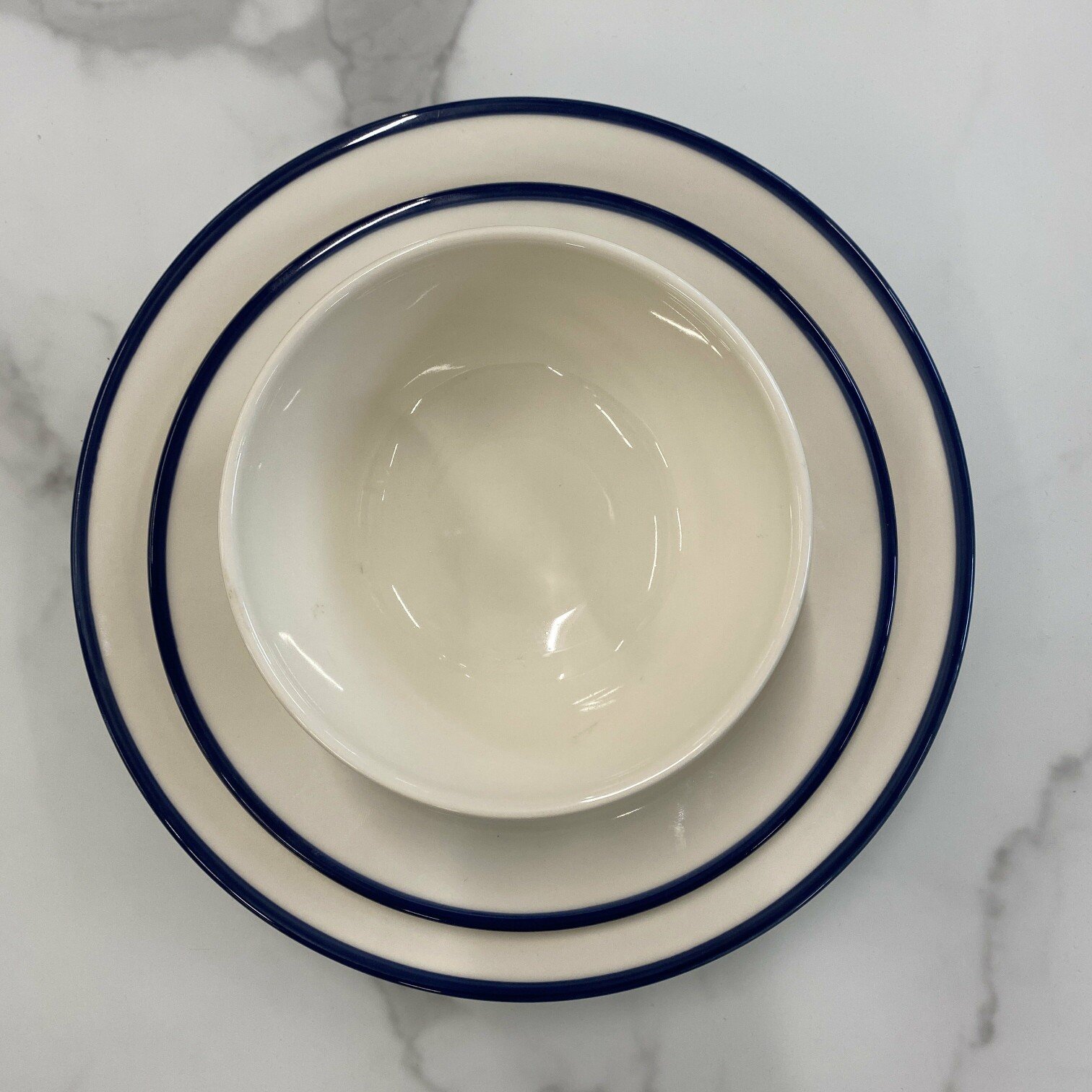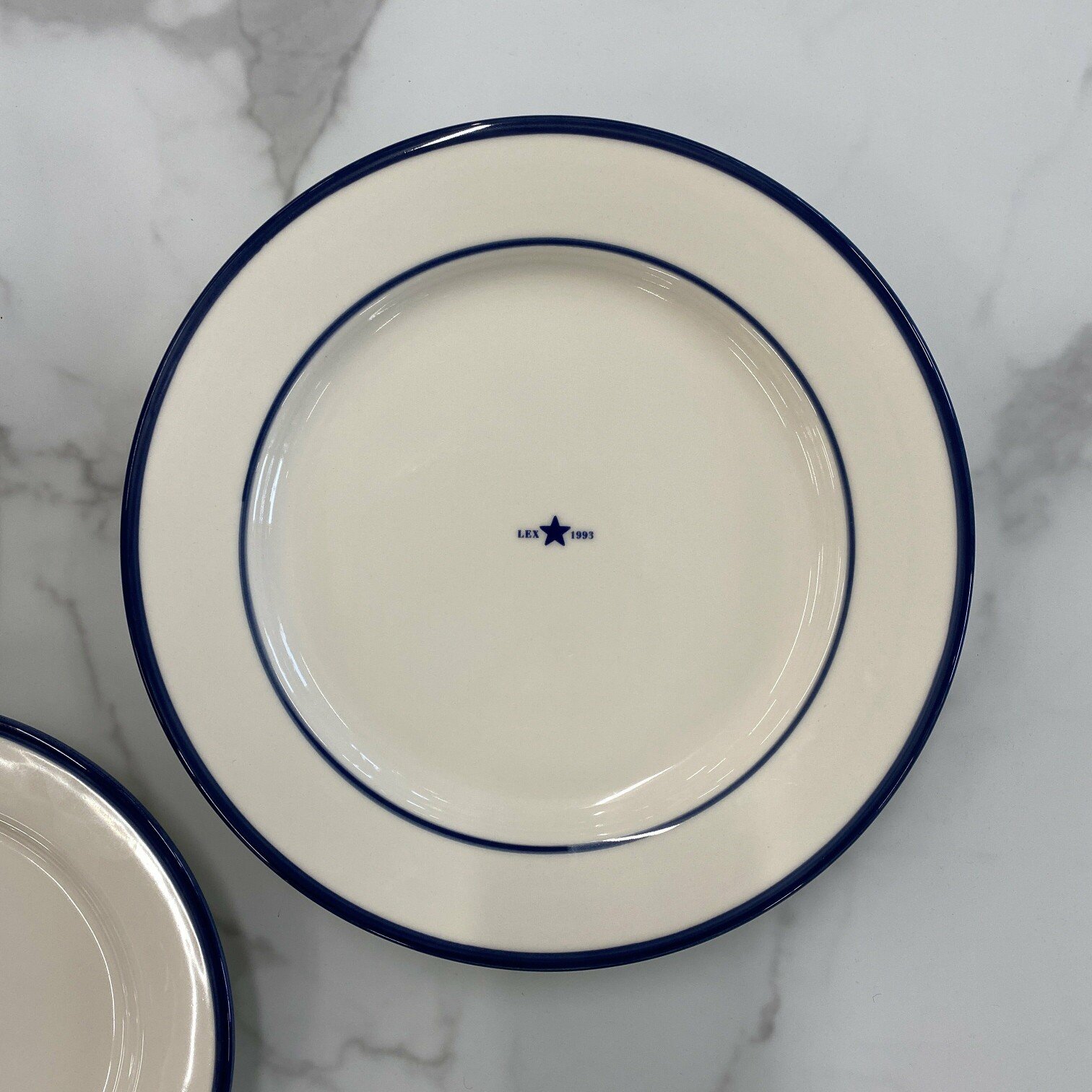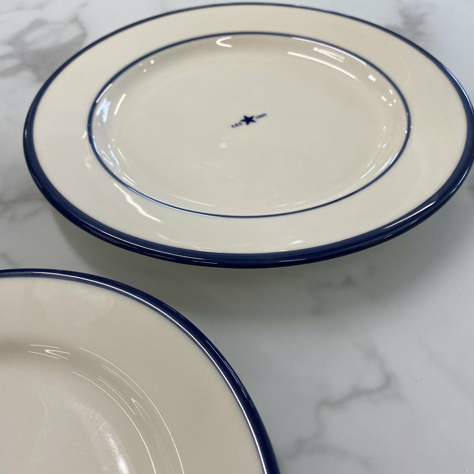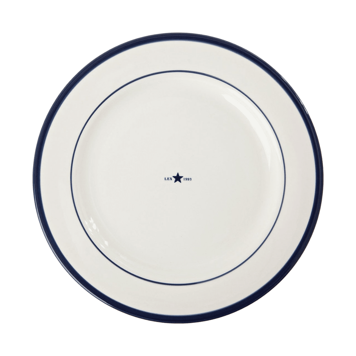 Šis keramikas šķīvis ir roku darbs, kas tam piešķir unikālu izskatu. Tam ir zila mala un vidū iestrādāts logo.