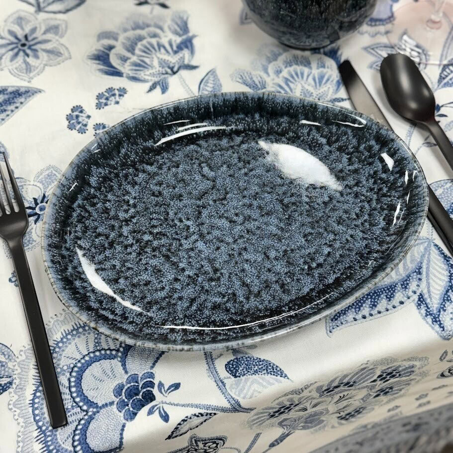 MACEY šķīvju komplekts apvieno glazētas keramikas augsto kvalitāti ar maigi plūstošām, organiskām formām, radot estētiski pievilcīgu un funkcionālu galda servējumu. Roku darbs piešķir katram šķīvim unikālu tekstūru un raksturu, kas pievērš uzmanību ikvienā maltītē. Spīdīgais melni-zilais tonis piešķir traukiem mierpilnu un izsmalcinātu noskaņu. Komplektā ietilpst 4 šķīvji – ideāli gan ikdienas lietošanai, gan īpašiem brīžiem. Izgatavoti Portugālē. Droši lietošanai mikroviļņu krāsnī un trauku mazgājamajā mašīnā.