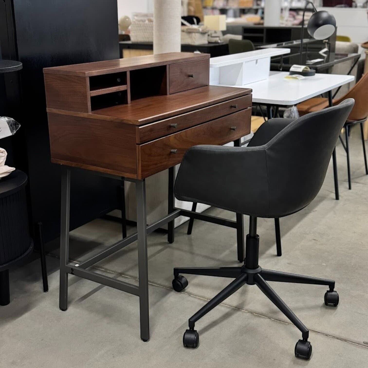 Lias rakstāmgalds apvieno mūsdienīgu dizainu ar praktisku funkcionalitāti, padarot to par ideālu izvēli gan mājas birojam, gan stilīgam darba stūrītim. Galds izceļas ar savu tumši brūno koka apdari un antracīta krāsas metāla detaļām, kas piešķir interjeram industriālu, bet siltu noskaņu.