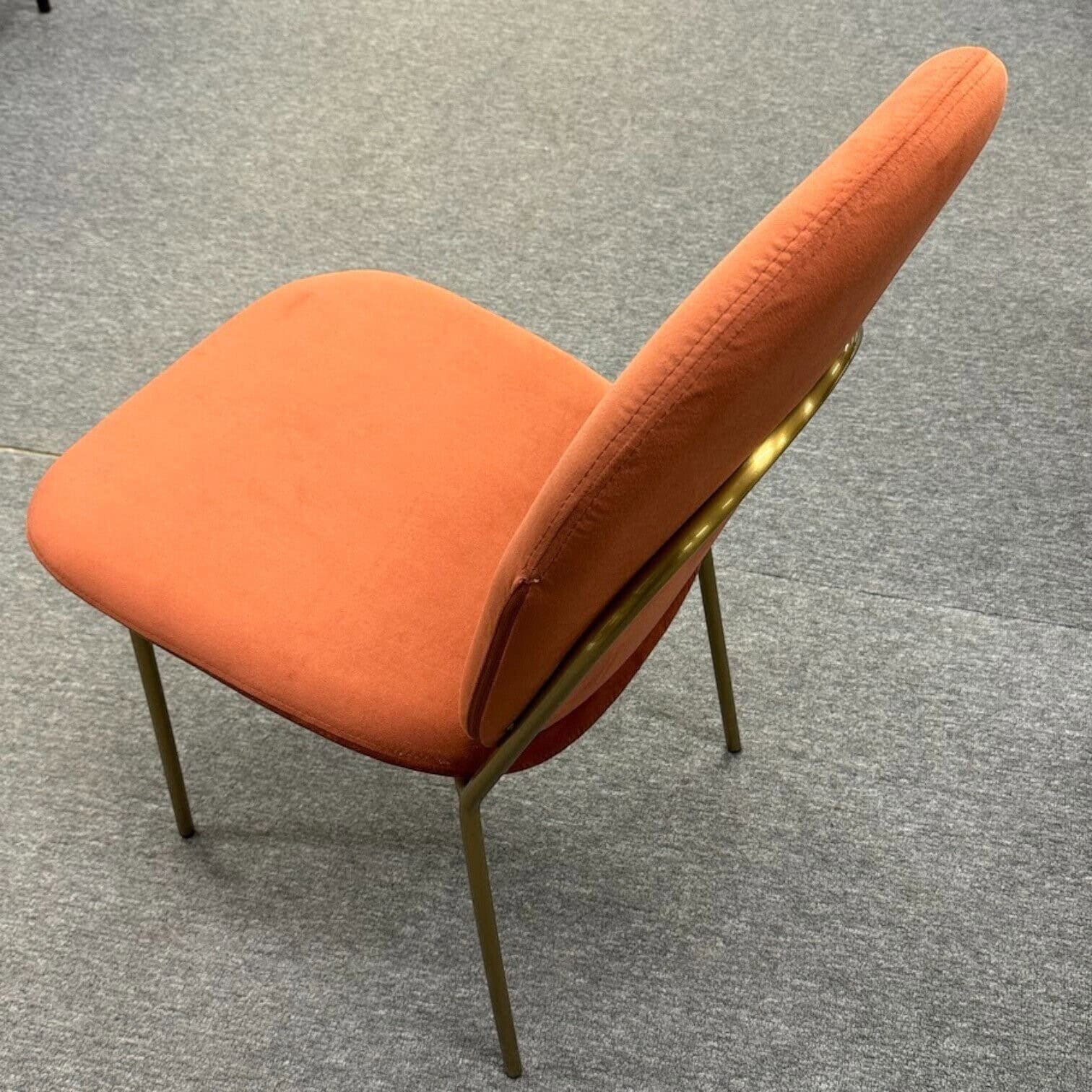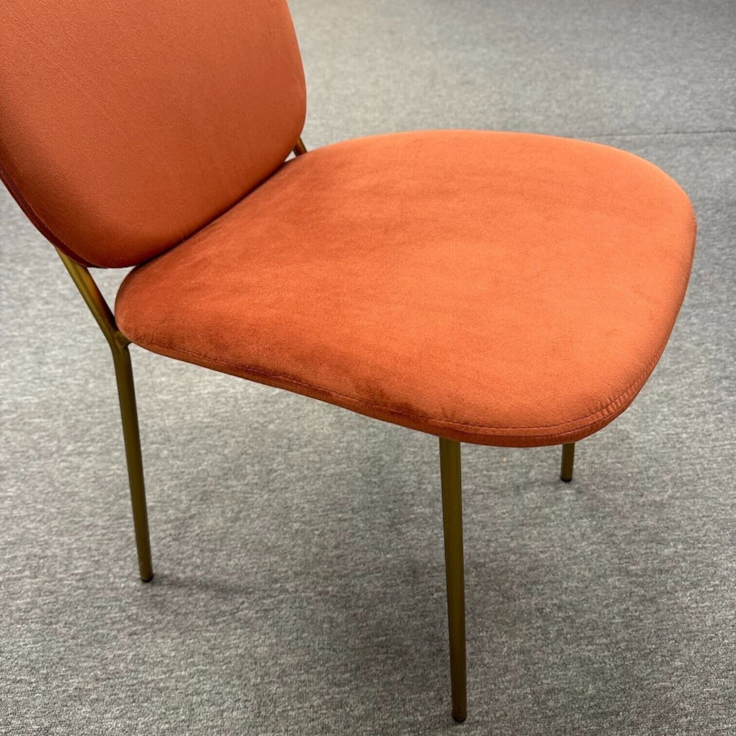 Greznais samta krēsls ar gludām zelta metāla kājām piešķir stilīgu un ērtu izskatu jebkuras mājas, restorāna vai darba vietas interjerā. Krēsla dizainā ir izmantots pievilcīgs oranžs samta audums, tas ir izturīgs un lieliski piemērots arī ikdienai.