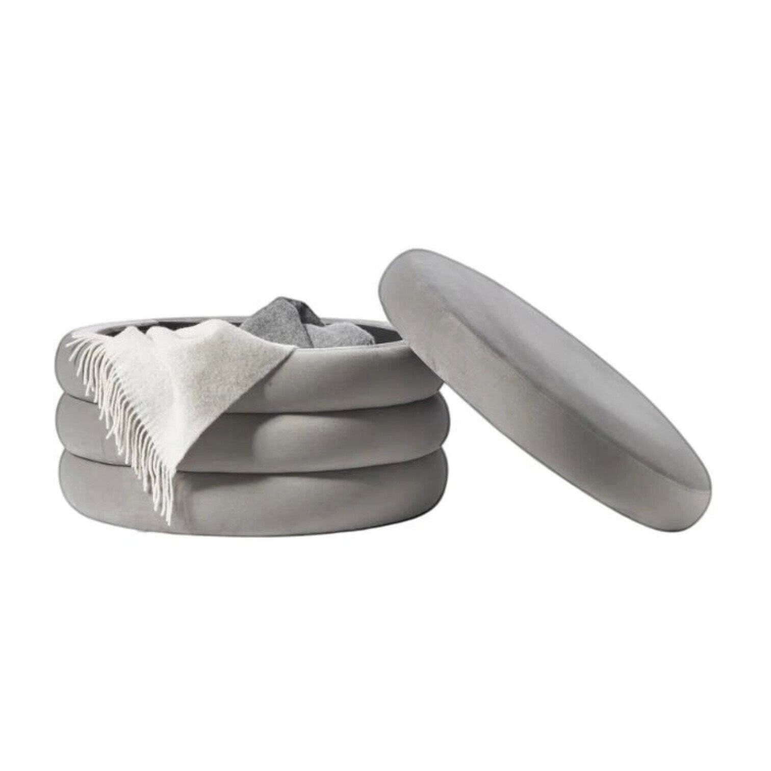 Pufs ir apvilkts ar patīkamu, samtainu audumu gaiši pelēkā tonī, kas viegli kombinējams ar dažādu krāsu mēbelēm un dekoriem. Mīkstais, kvalitatīvais polsterējums nodrošina komfortu gan sēdēšanai, gan kāju atbalstam. Stabilā konstrukcija un nelielas, diskrētas kājiņas nodrošina drošu novietojumu uz grīdas.