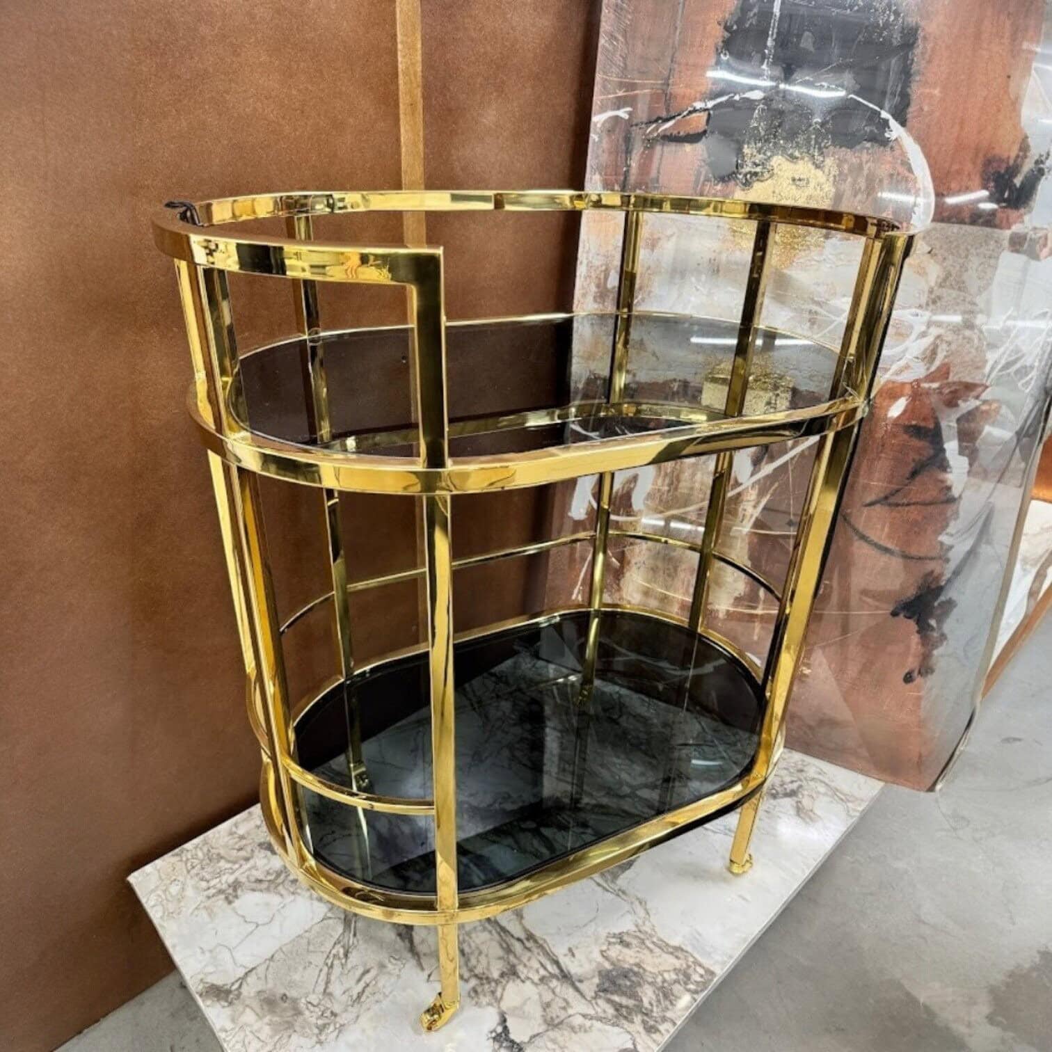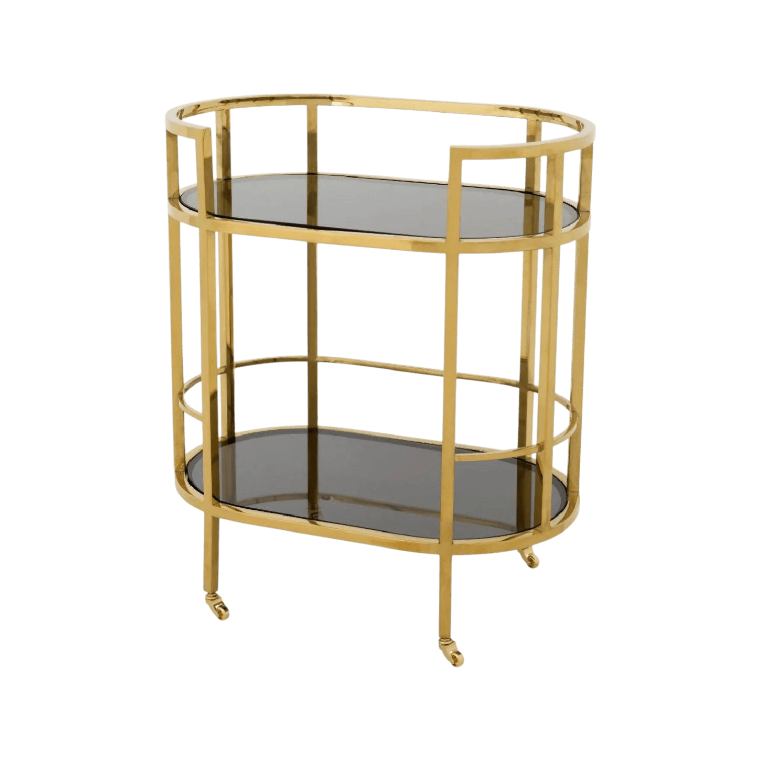 Townhouse servēšanas ratiņi ir elegants un funkcionāls dizaina akcents, kas iemieso Eichholtz zīmola raksturīgo greznību un klasisko šarmu. Ar liekti veidotu zeltainu nerūsējošā tērauda rāmi un diviem dūmakaina stikla plauktiem, šie ratiņi piedāvā nevainojamu fonu dzērienu servēšanai vai kā grezns sāngalds jūsu interjerā. Četri dekoratīvie ritentiņi piešķir vintage noskaņu un nodrošina ērtu pārvietošanu.