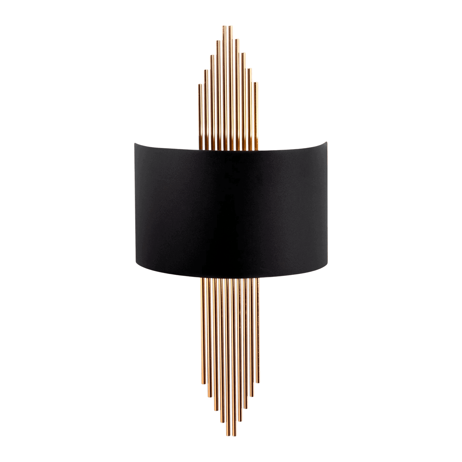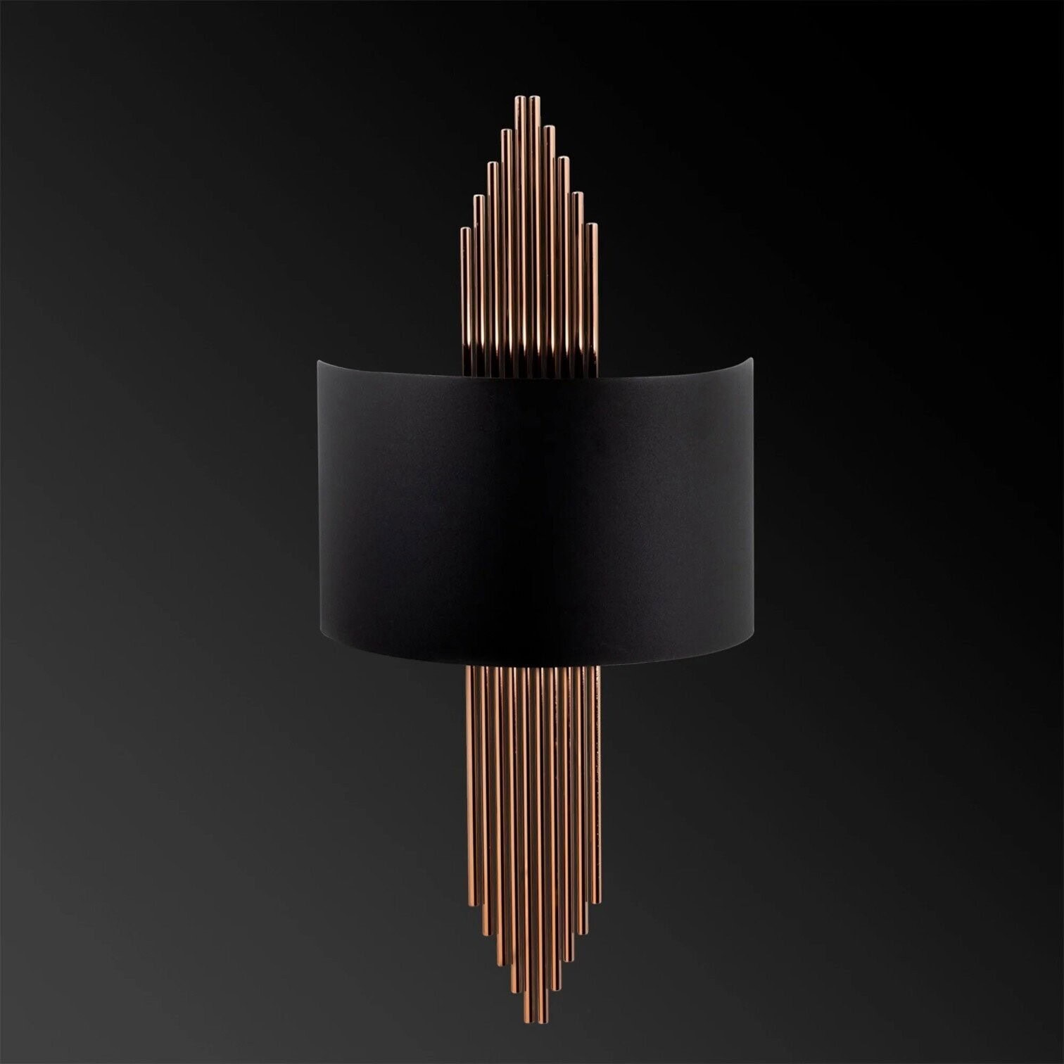 Sienas lampa 617 A ir elegants un moderns interjera akcents, kas apvieno minimālismu ar luksusa pieskaņu. Lampas centrālais elements ir dziļi melns abažūrs, kas piešķir dizainam stingru raksturu un izceļ telpas noskaņu. No augšas un apakšas to rotā vertikāli, smalki misiņa krāsas stieņi, kas atgādina organu caurules un rada dinamisku, arhitektonisku vizuālo efektu.