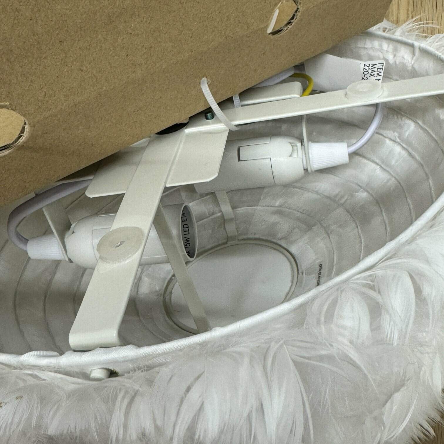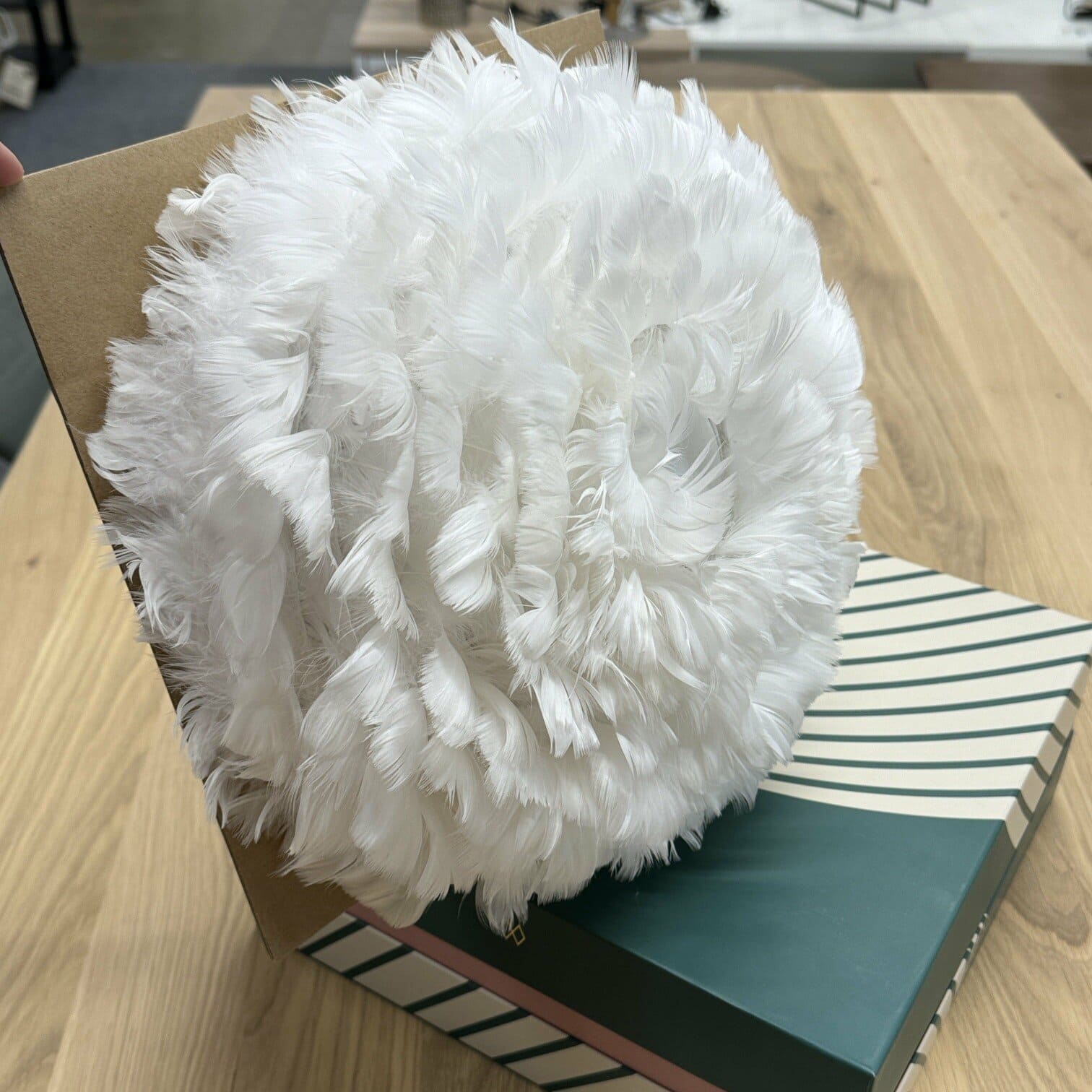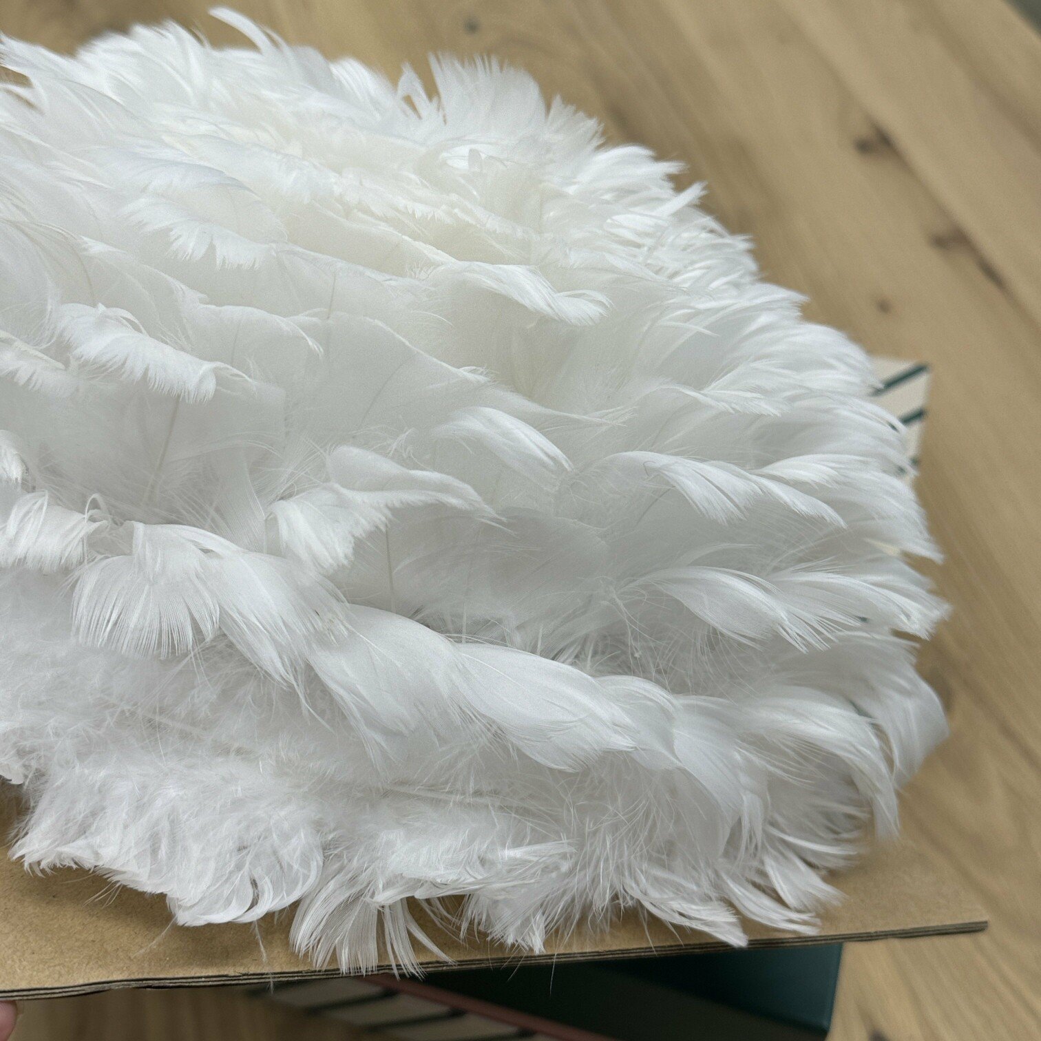Roku darbs no plāna papīra un skaistās, baltās, autentiskās zosu spalvas piešķir abažūram ļoti elegantu izskatu. Iedegoties, Eos Up izstaro ļoti maigu, izkliedētu un siltu gaismu. Ar maigo gaismu un apaļo, pūkaino spalvu formu Eos piešķir telpai mīkstinošu un nomierinošu atmosfēru.