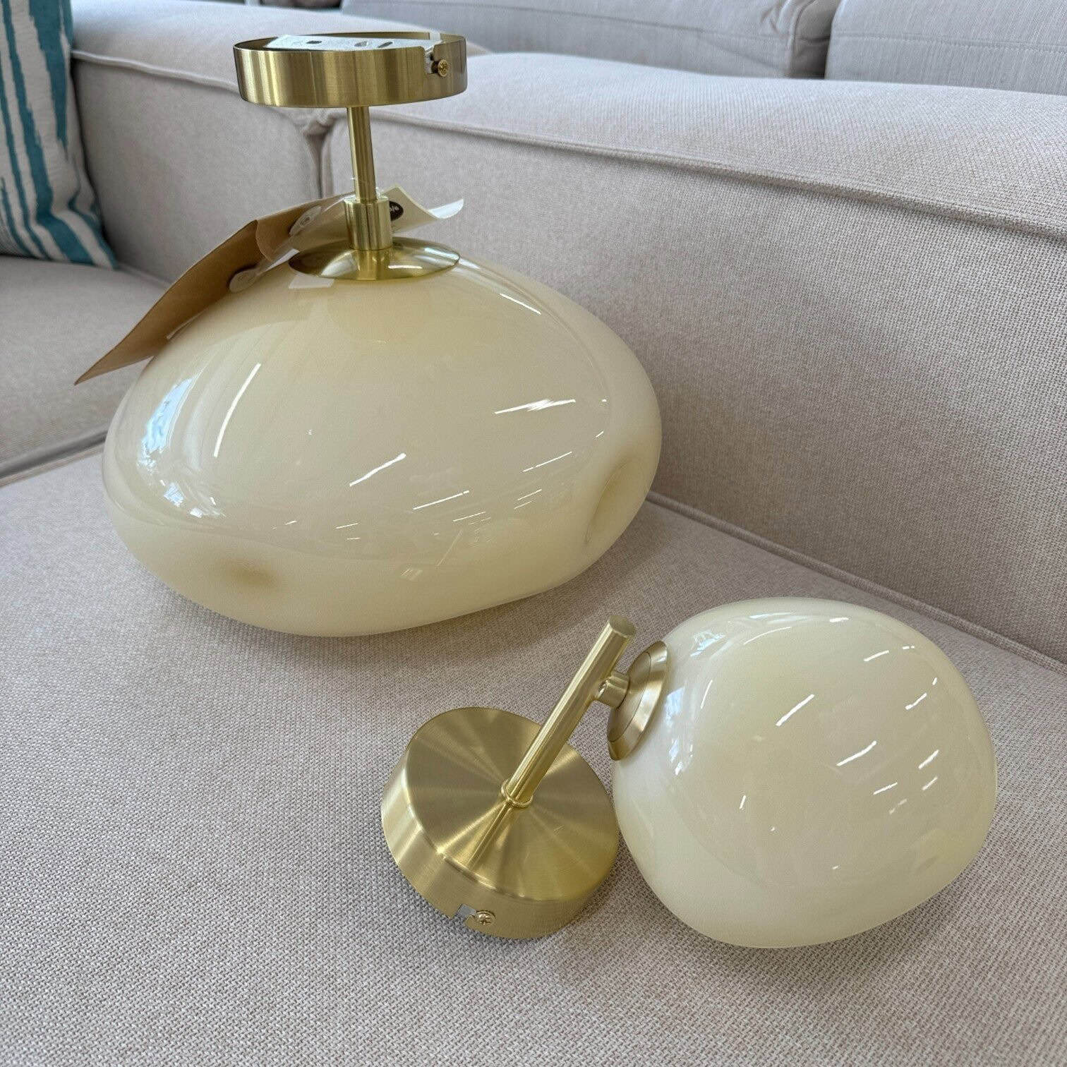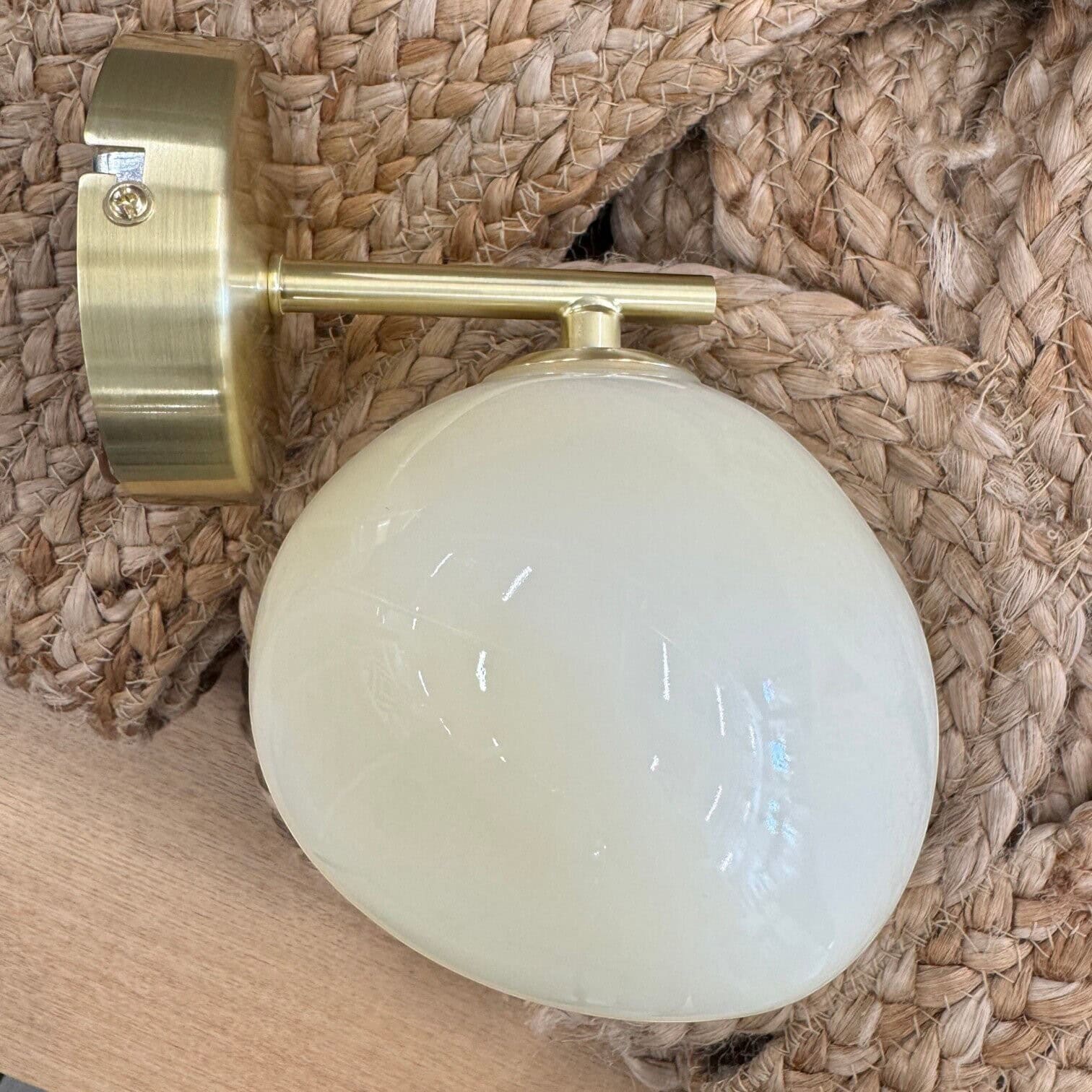 Neregulāras formas kupols, izgatavots no gluda, glancēta stikla gaišā krēmkrāsas tonī. Šāds gaismeklis būtu piemērots izmantošanai modernā interjerā – vannasistabās, koridoros vai kā gultas lampas pie sienas. Tas apvieno minimālismu ar luksusa elementiem.