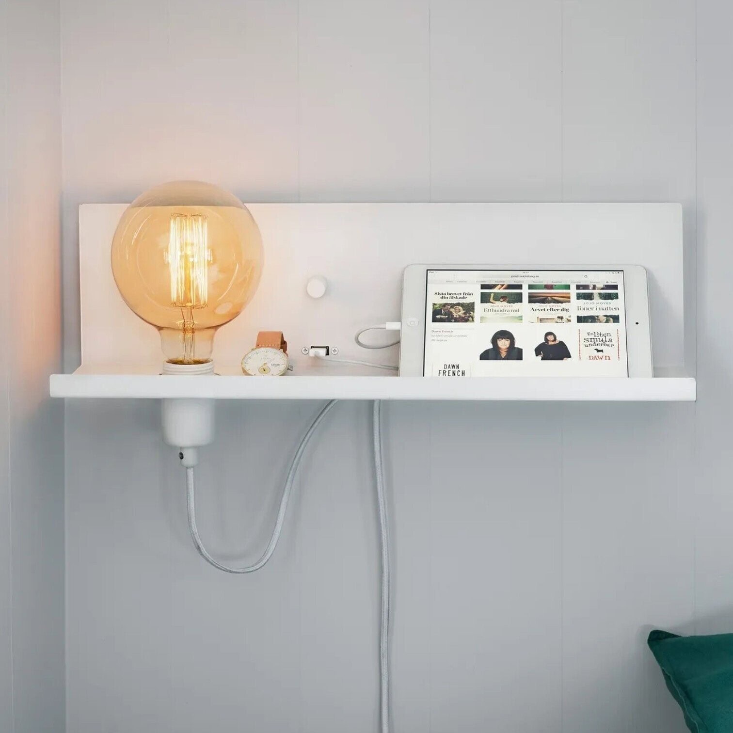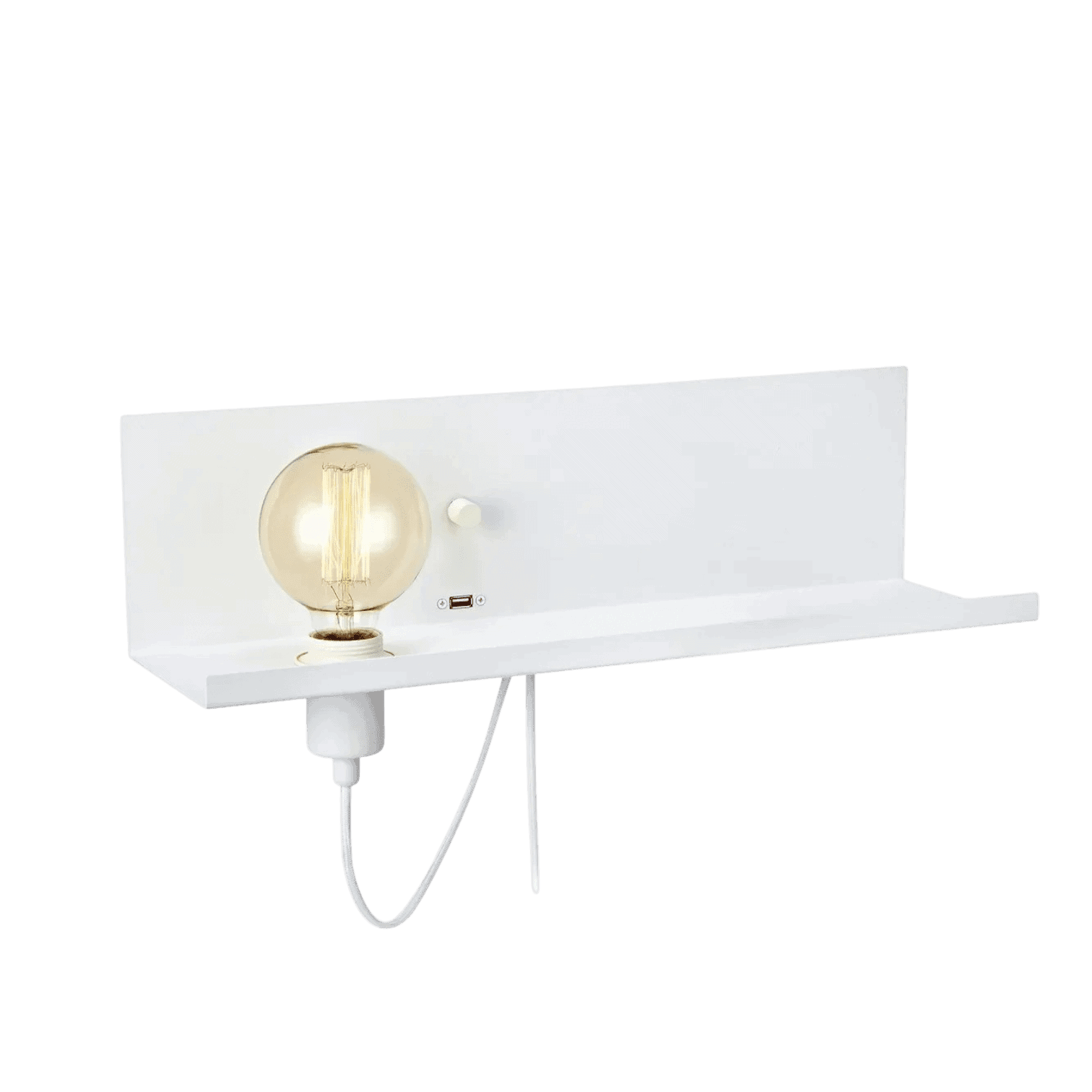 Gudra sienas lampa no balta metāla ar plauktiņu un USB pieslēgvietu ērtai mobilo ierīču uzlādei. Iebūvēts regulators ērtai gaismas intensitātes pielāgošanai.