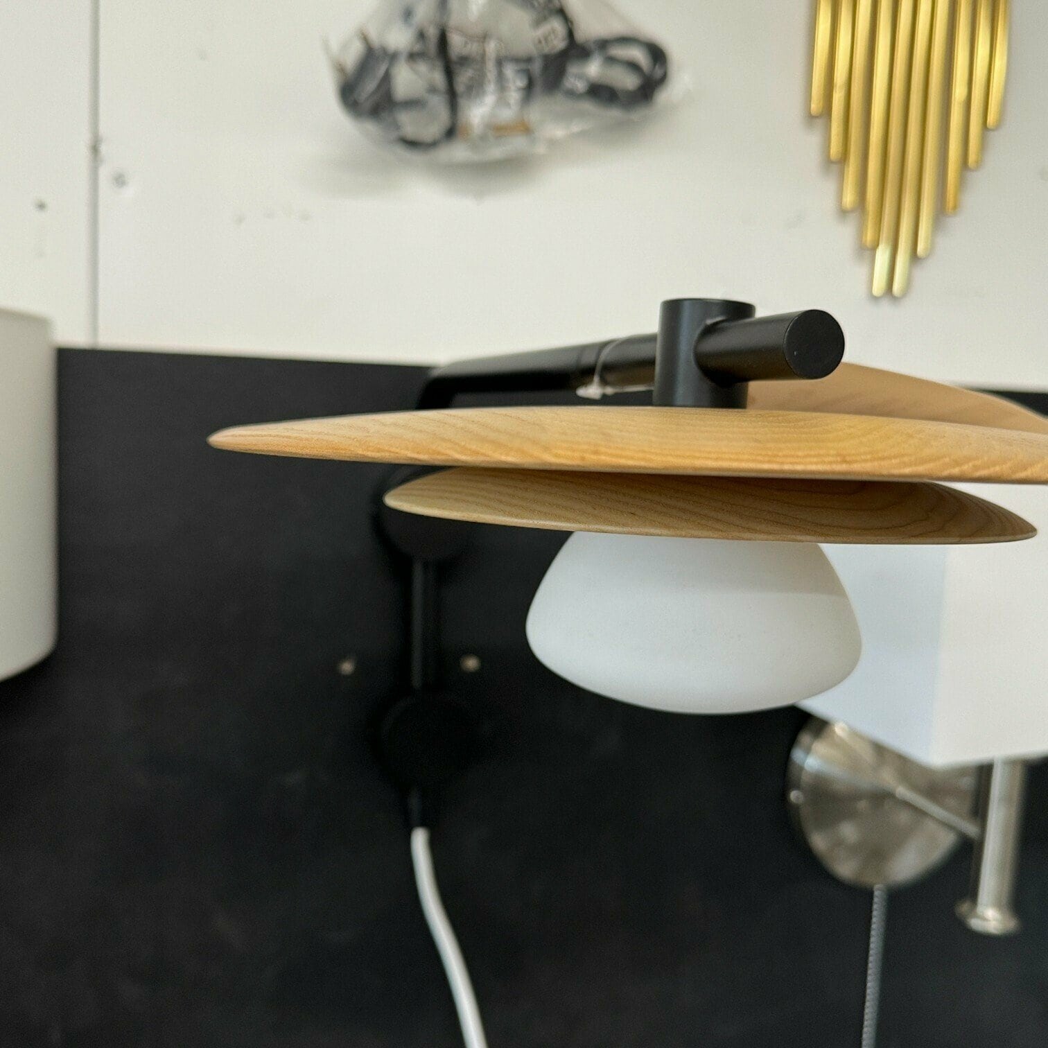 Moderna dizaina sienas lampa ar koka detaļām.