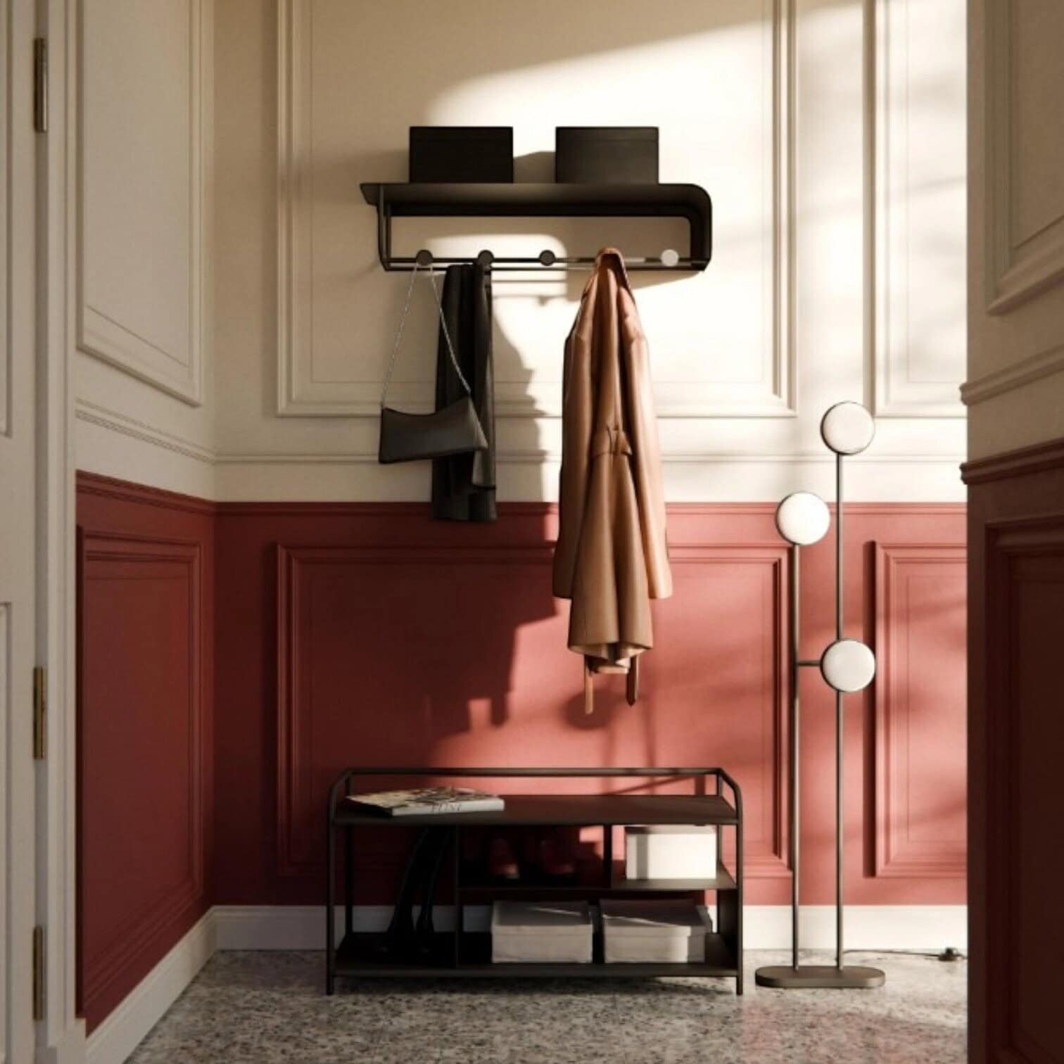 Funkcionāls metāla sienas plaukts ar pakaramajiem — ideāls risinājums kārtības uzturēšanai jūsu priekšnamā, vannasistabā vai virtuvē. Minimālistisks dizains un matēts krāsojums piešķir modernu un elegantu izskatu, kas viegli iekļaujas dažādos interjera stilos.