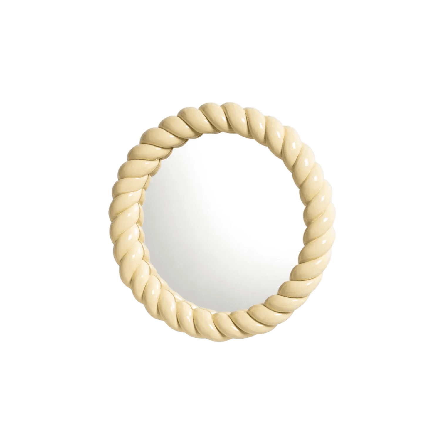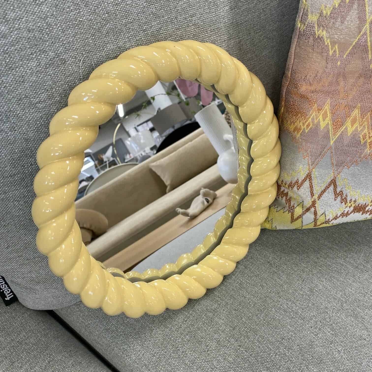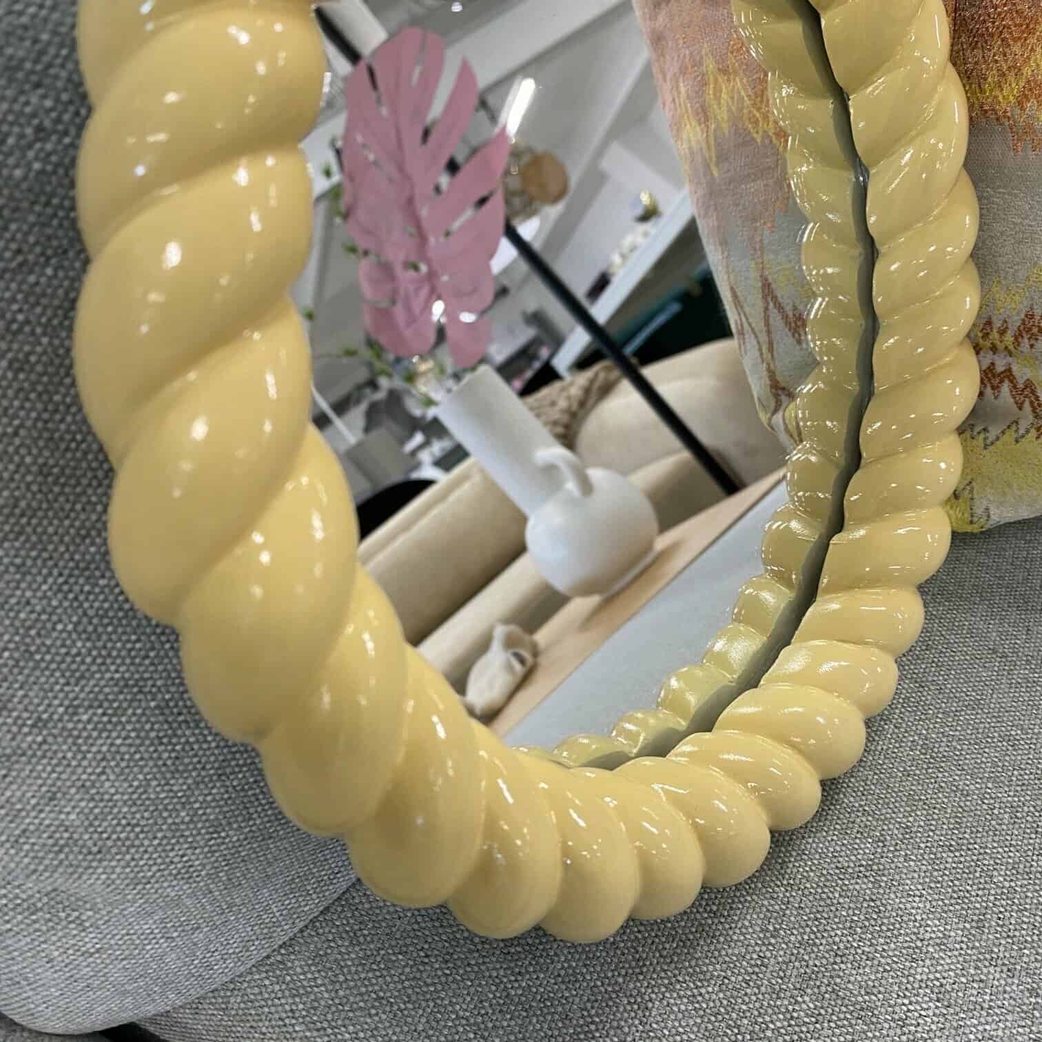 Spogulis ar spirālveida pīnes dizainu būs elegants aksesuārs jūsu mājām. Tā maigi dzeltenā, spīdīgā krāsa un pīne, kas apvij spoguļa rāmi, piešķirs interjeram rotaļīgumu un reizē arī eleganci.
