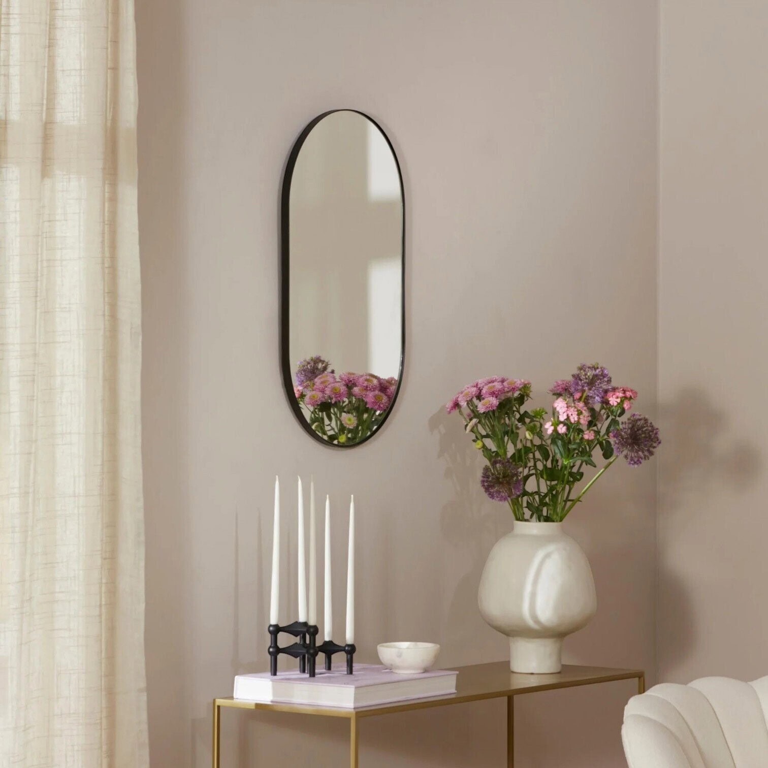 Šis stilīgais ovālais sienas spogulis ir lieliska izvēle modernam un gaumīgam interjeram. Tā slaidā, vertikālā forma vizuāli pagarina telpu, savukārt plānais melnais rāmis piešķir izsmalcinātu kontrastu un mūsdienīgu raksturu.