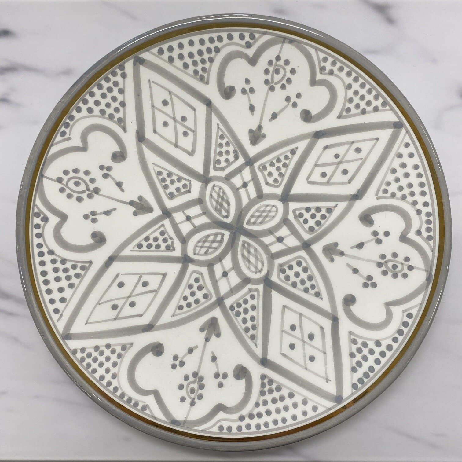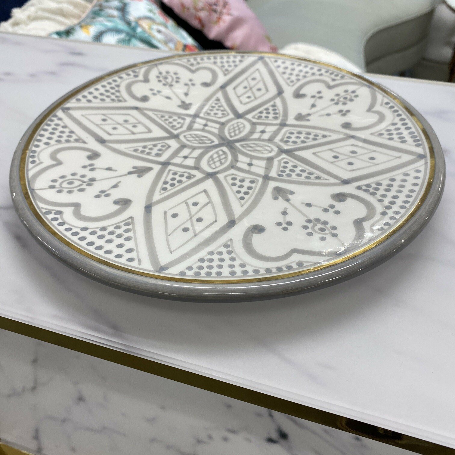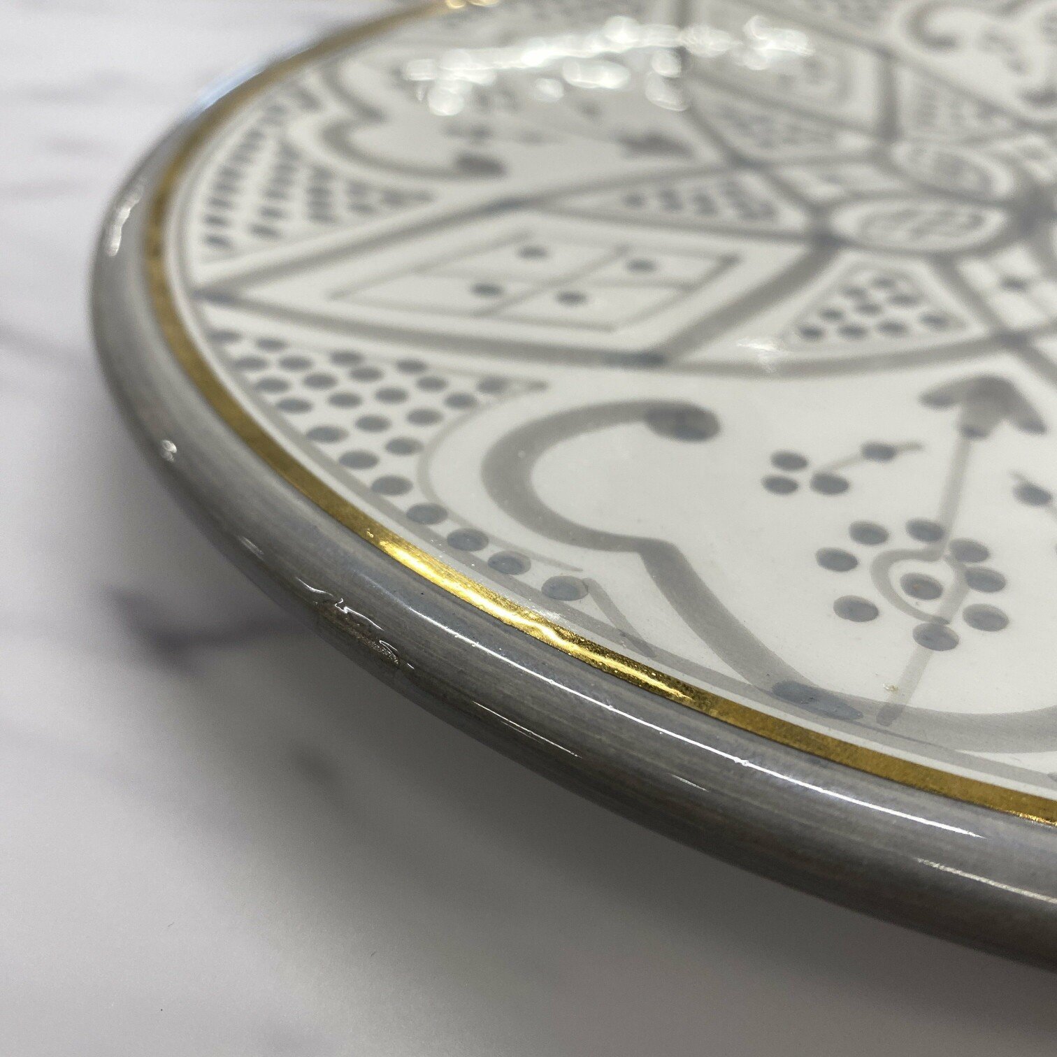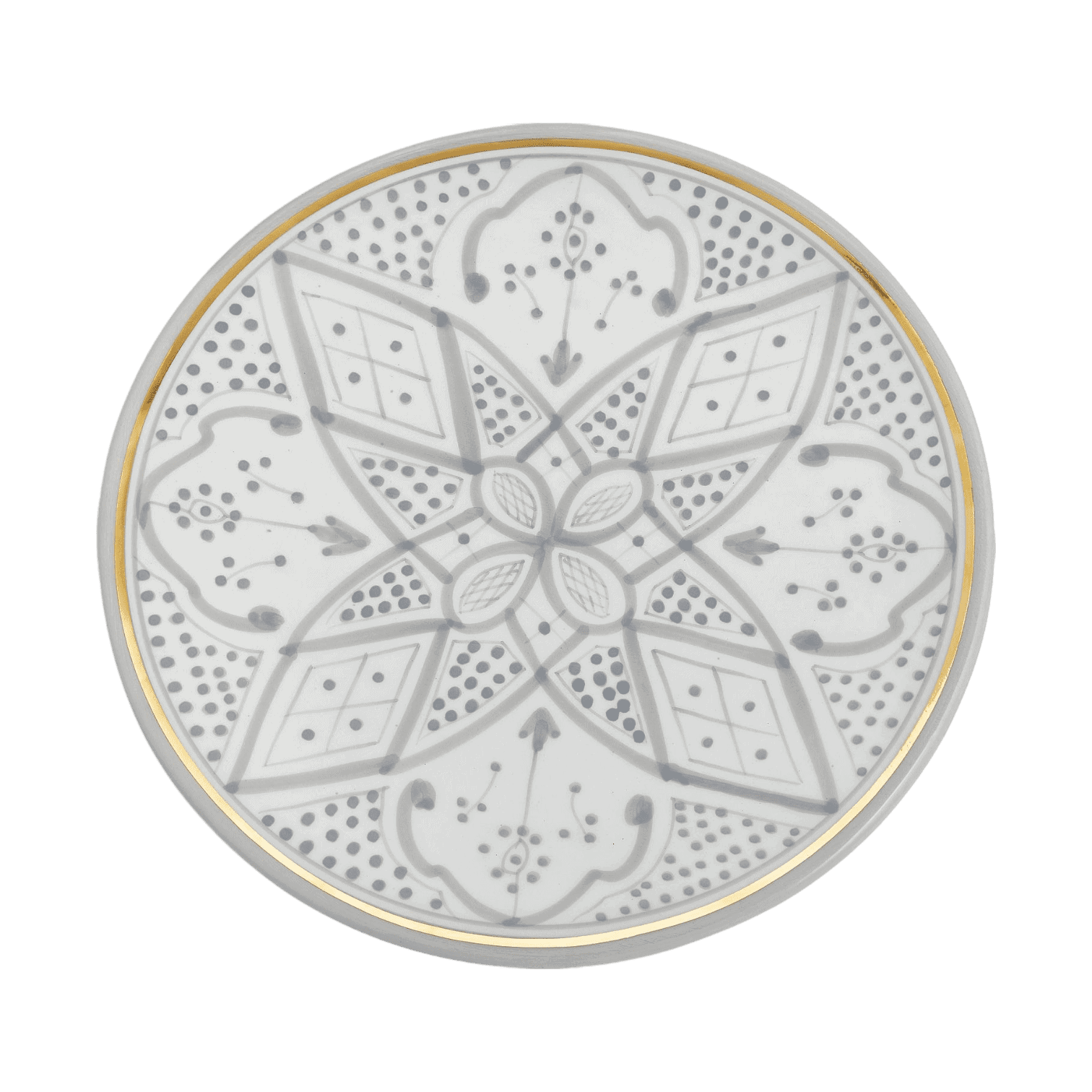 Šis šķīvis ir apgleznots ar rokām un krāsu, kas nesatur svinu un īstu 12 karātu zeltu. Izgatavots Marokā, Marakešā. Var atšķirties no bildē redzamā.