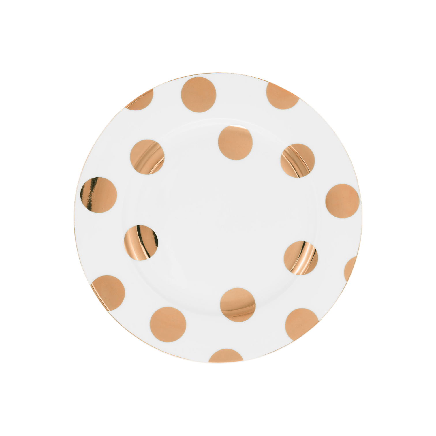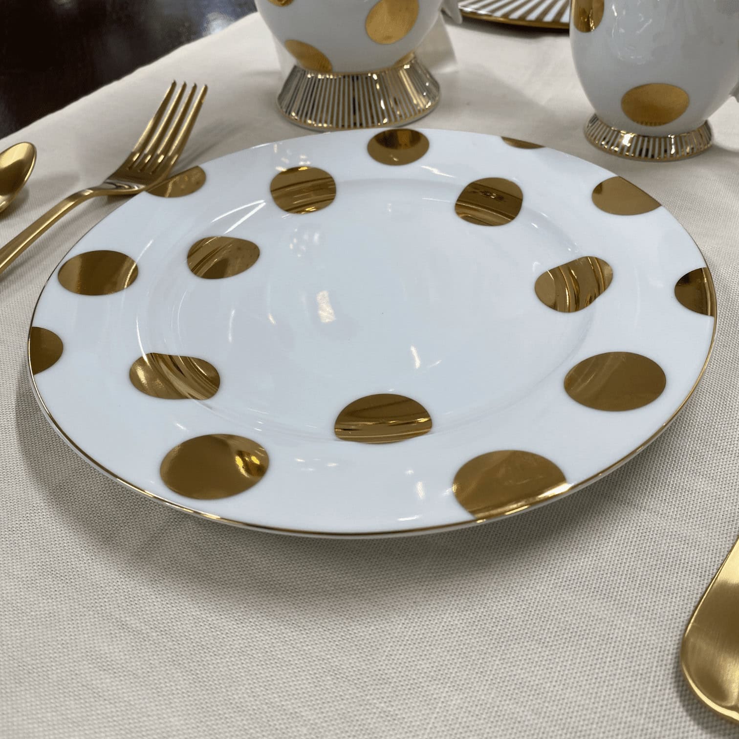 Šķīvis ir izstrādāts ar zelta maliņu. Dot Delight galda priekšmeti piešķir elegances un svētku pieskārienu jebkurai maltītei, padarot to par perfektu izvēli īpašiem notikumiem.