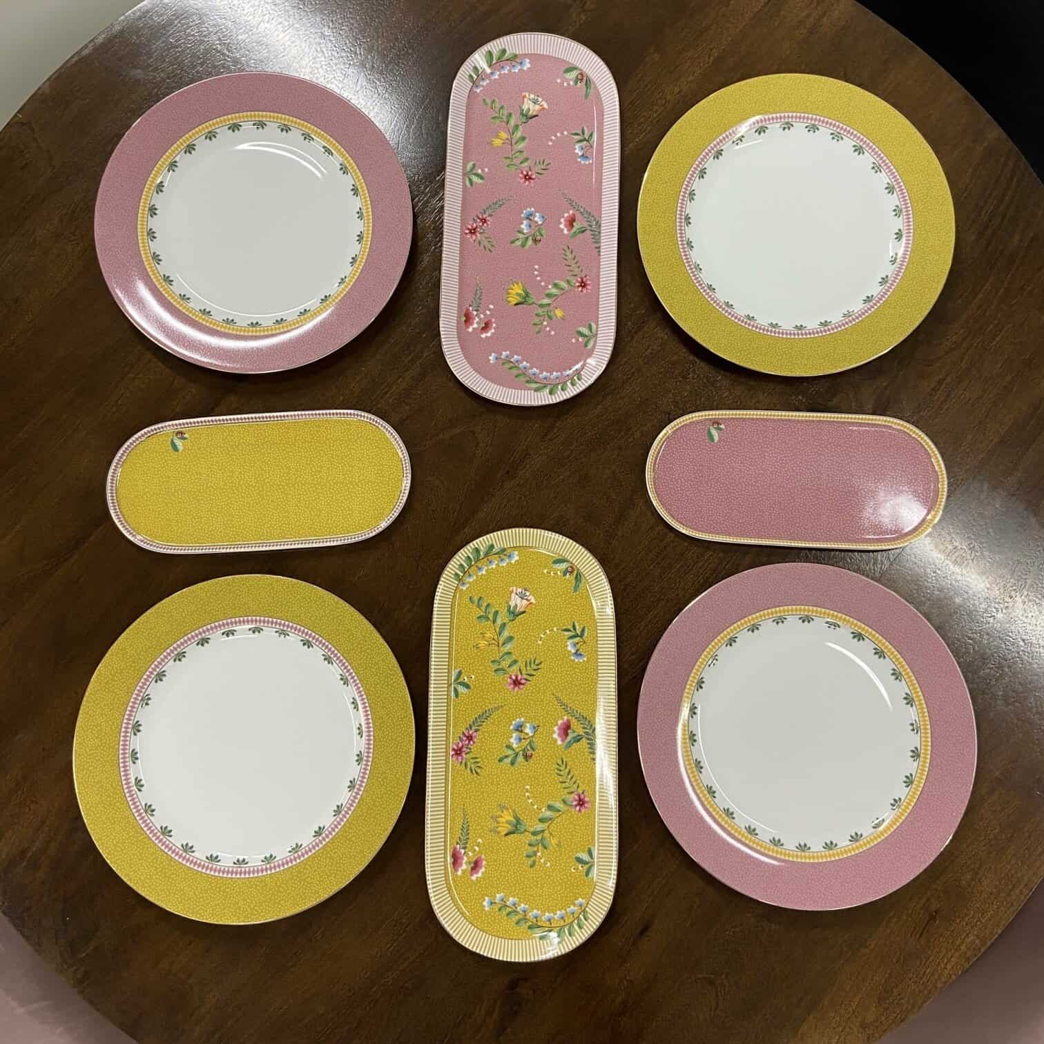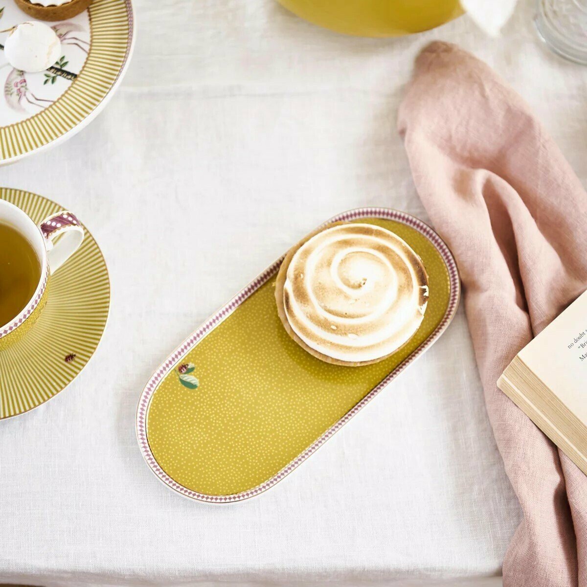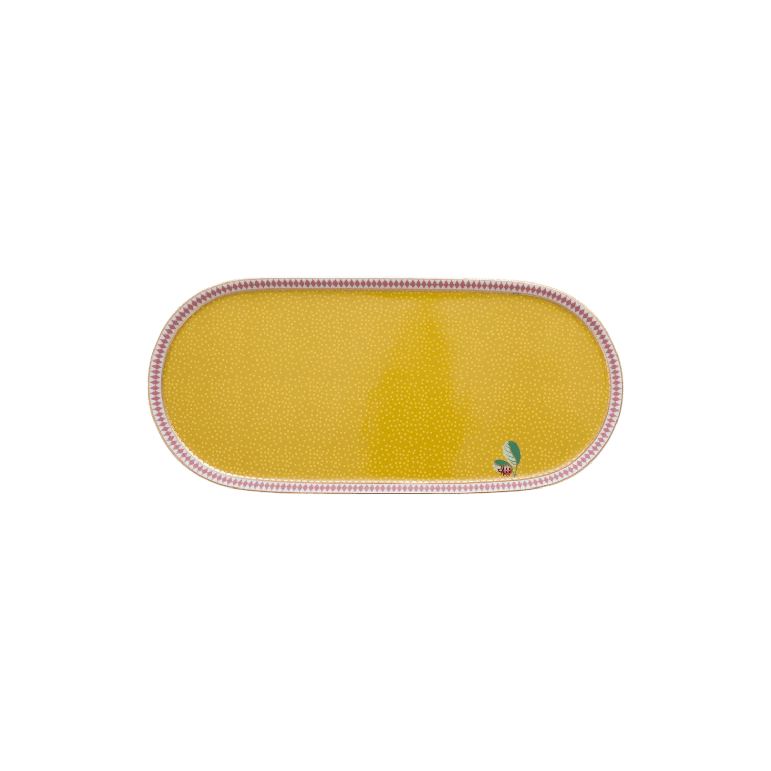 La Majorelle kūku šķīvīti spilgti dzeltenā krāsā sānos rotā viena mārīte, kas izplūst no divām lapām. Raksturīgās svītras uz apmales un zelta detaļas piešķir šim skaistajam dizainam smalku apdari.