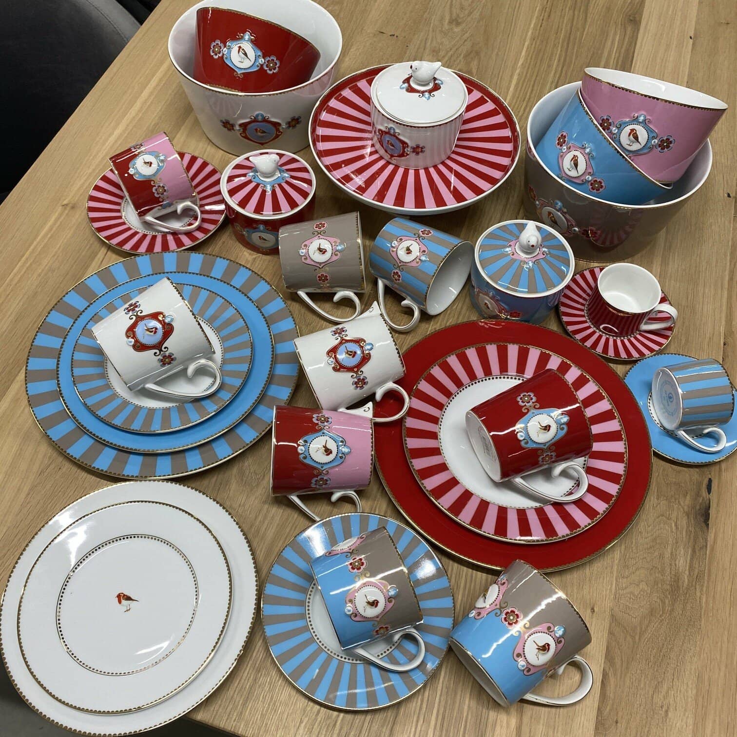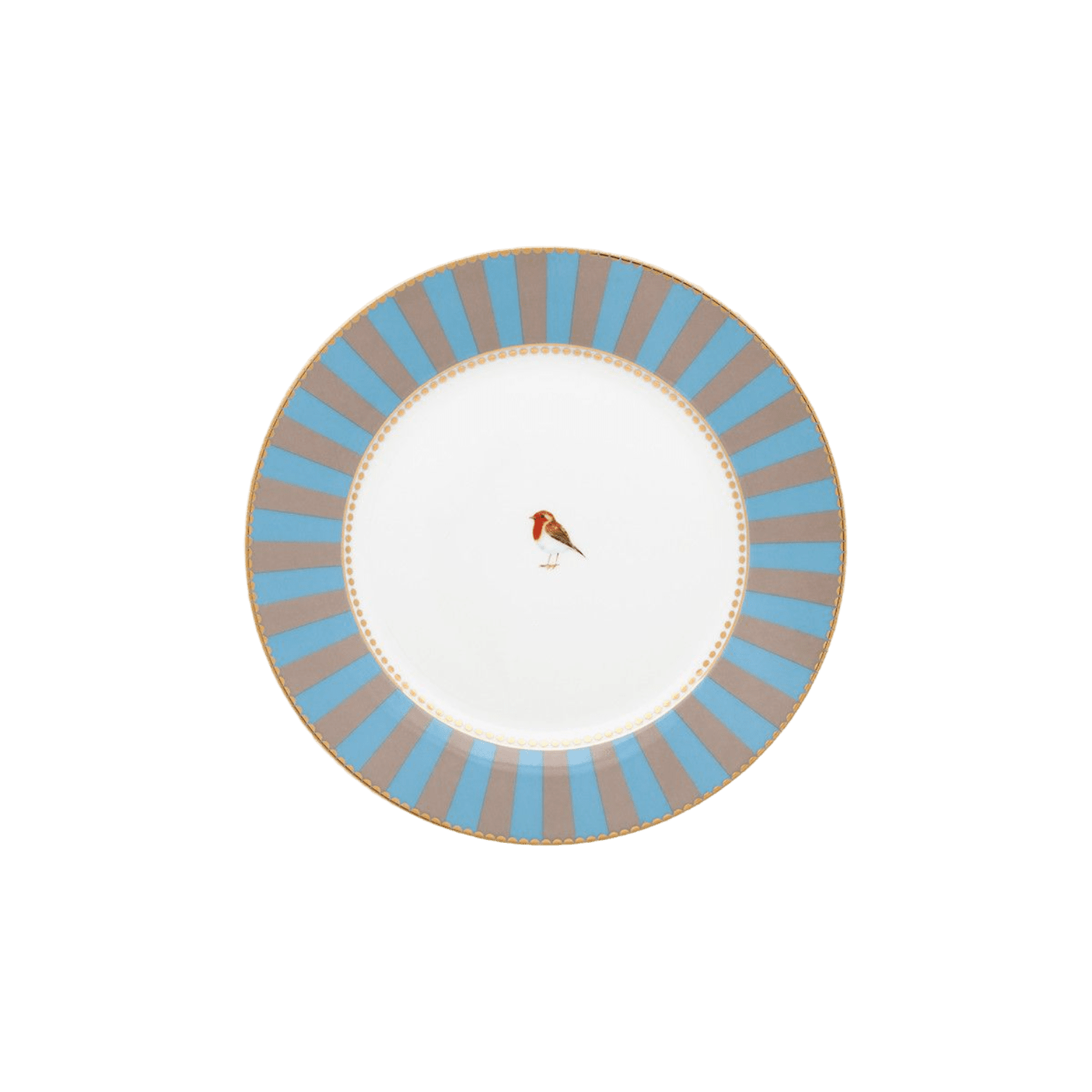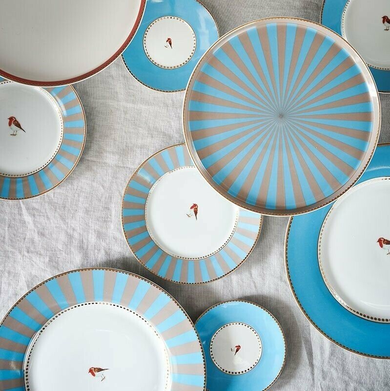 Brokastu šķīvis no Pip visu laiku iecienītākā Love Birds dizaina. Dekorēts ar zeltītu apmali un zilu un haki svītrainu apmali. Uzmanību piesaistošais centrālais elements ir spilgtas krāsas Sarkankrūtītis.