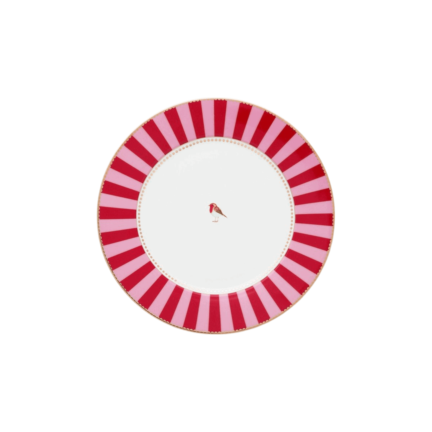 Pusdienu šķīvis no visu laiku iecienītākās Love Birds kolekcijas. Dekorēts ar zelta maliņu un sarkanām un rozā svītrām. Uzmanību piesaistošs centrālais elements ir koši krāsots putniņš. Skaisti sader ar citiem porcelāna izstrādājumiem no šīs kolekcijas.
