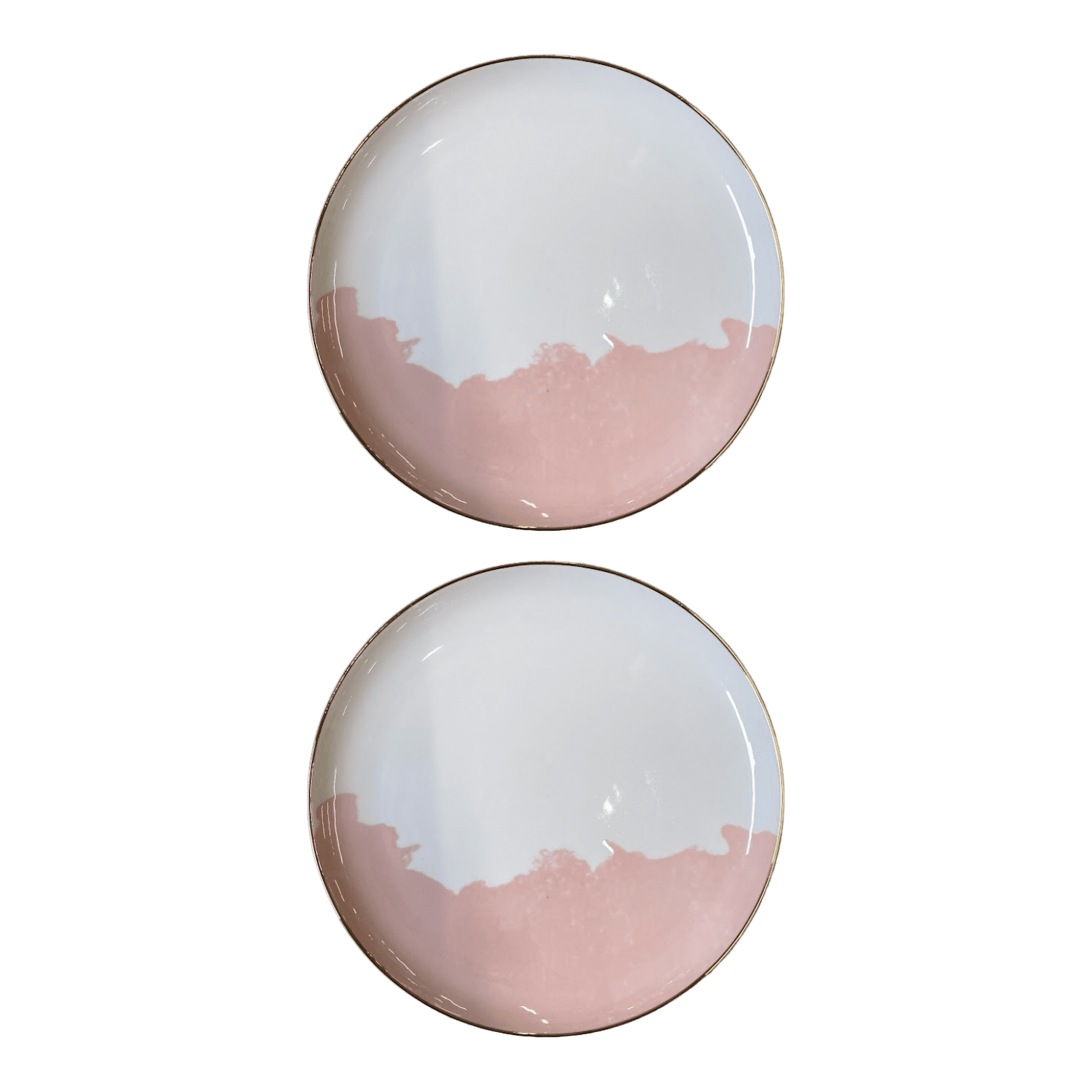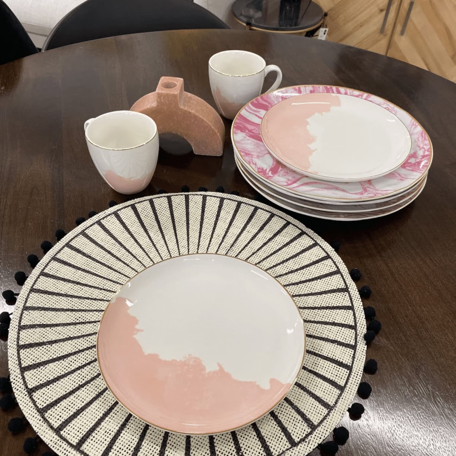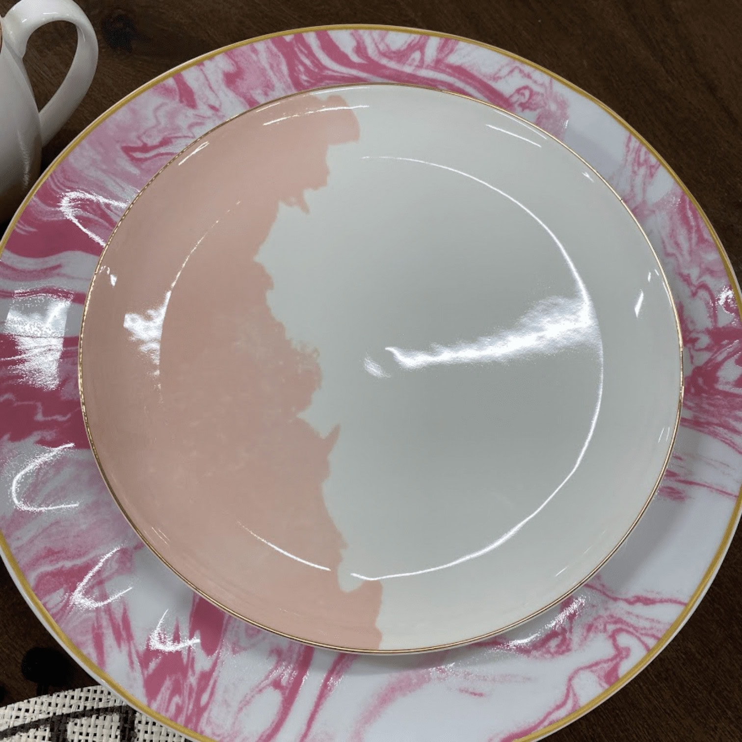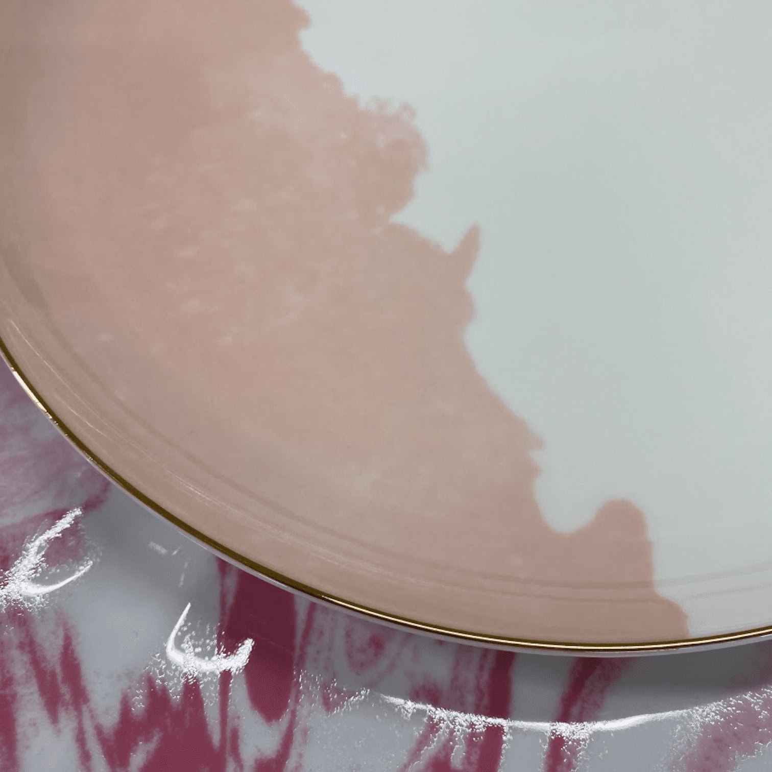 Porcelāna šķīvju komplekts ar abstraktu rakstu un zeltītu malu.