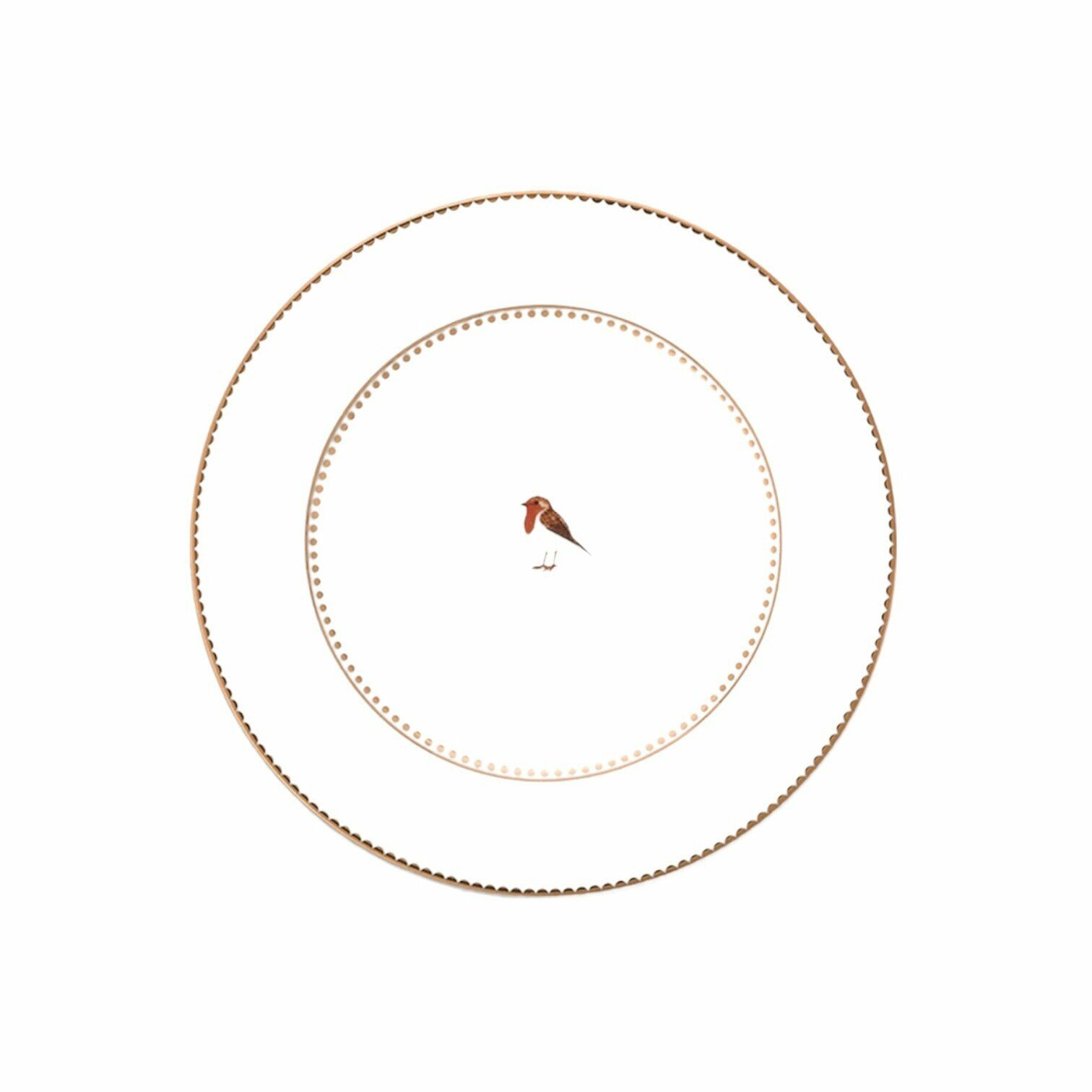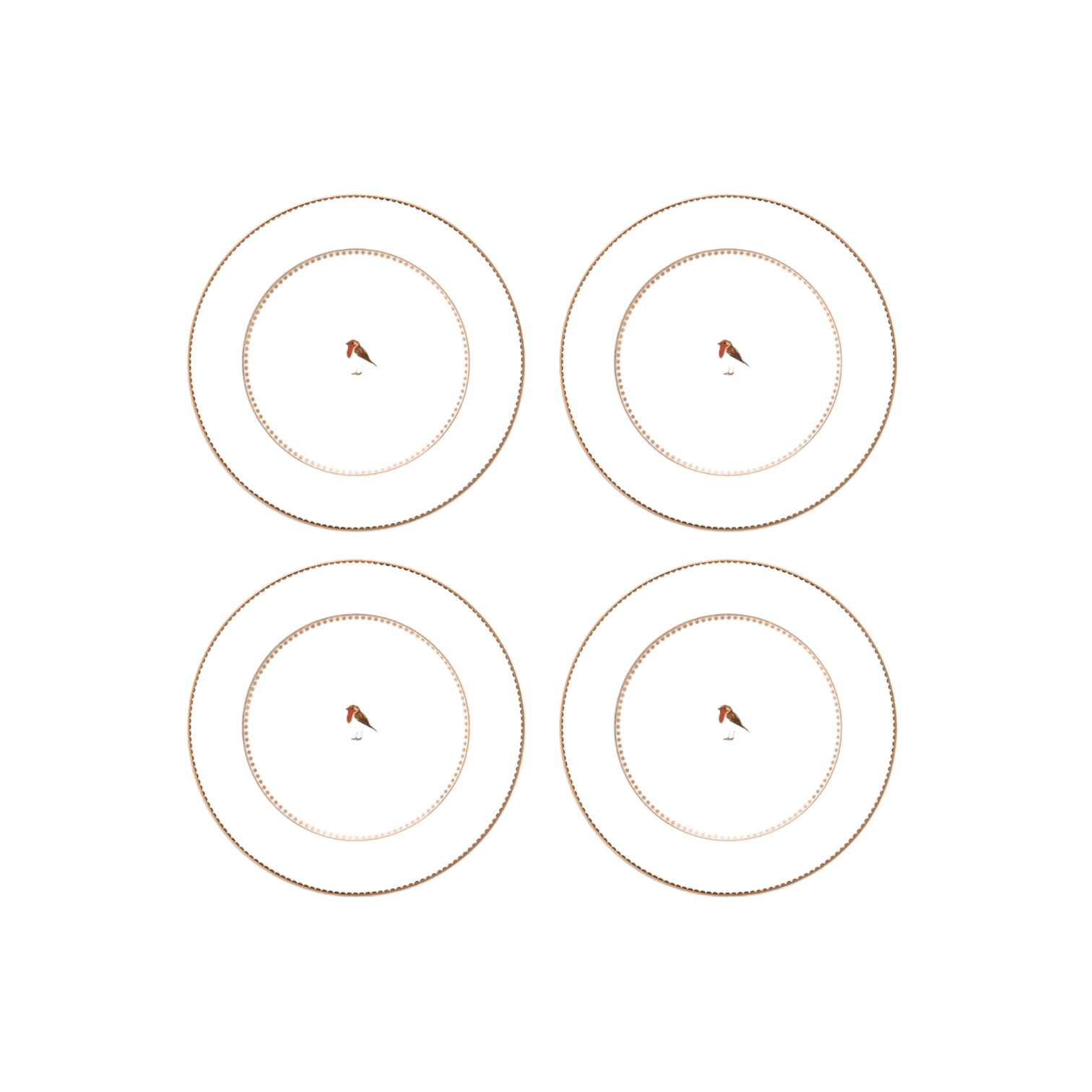 Jums paredzētas vakariņas ar draugiem un ģimeni? Ar šo 4 šķīvju komplektu jūs parūpēsieties, lai jūsu galds būtu ideāli noformēts. Šķīvji ir balti ar zelta detaļām malā un ar krāsotu putniņu vidū. Šie šķīvji ir lieliski piemēroti, lai kombinētu un saskaņotu ar citiem šīs kolekcijas traukiem. Šķīvji ir izgatavoti no smalka porcelāna