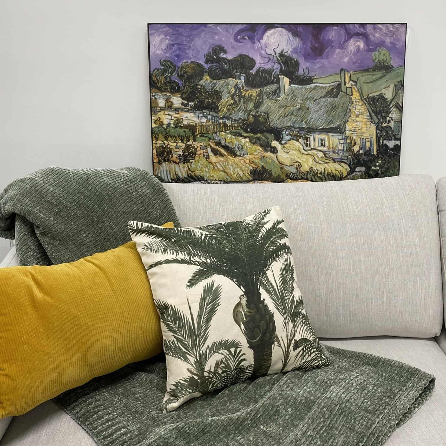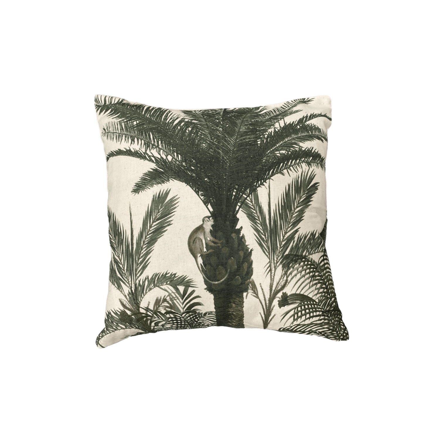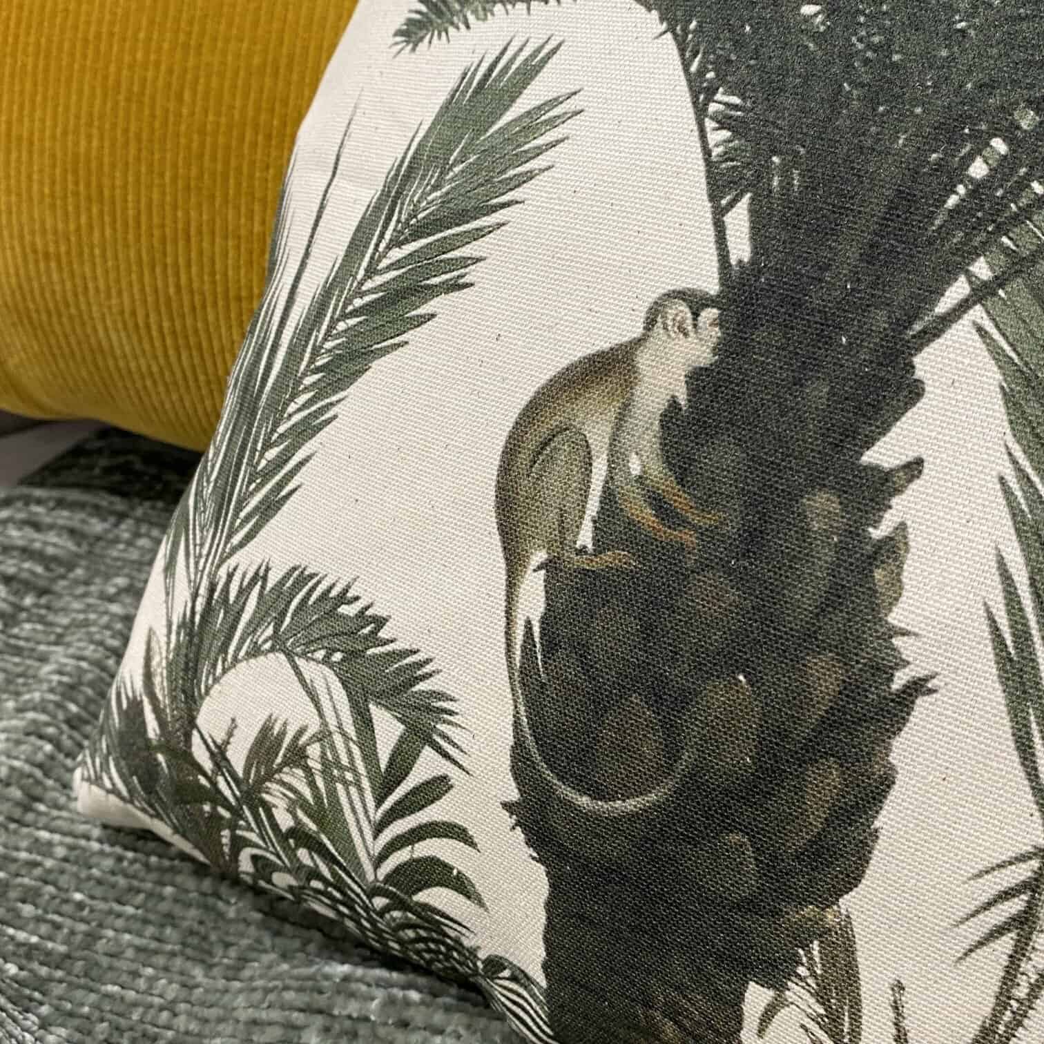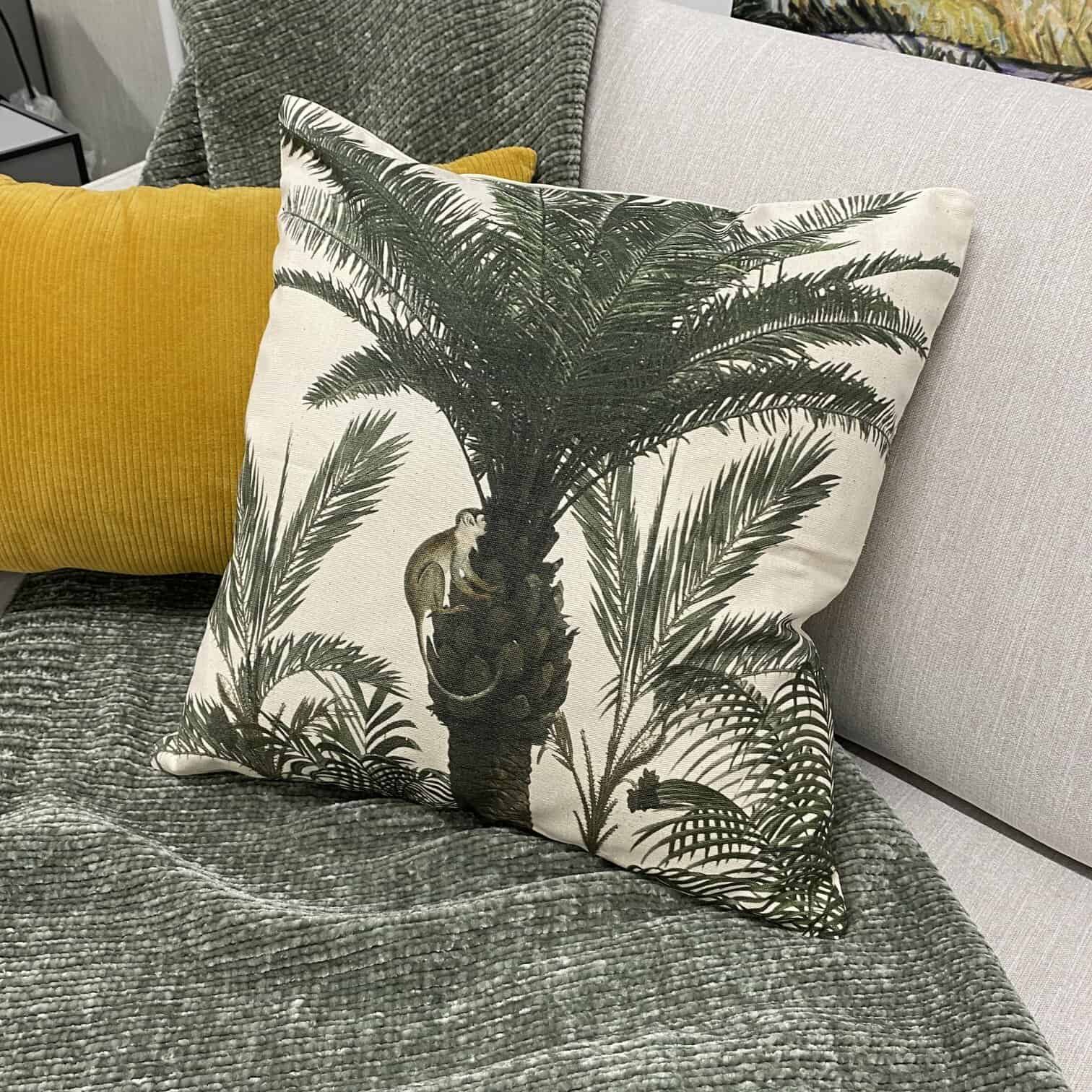 Spilvendrāna tropiskās noskaņās ar palmām un kapucīnu. Iederēsies safari, boho stila interjeros.