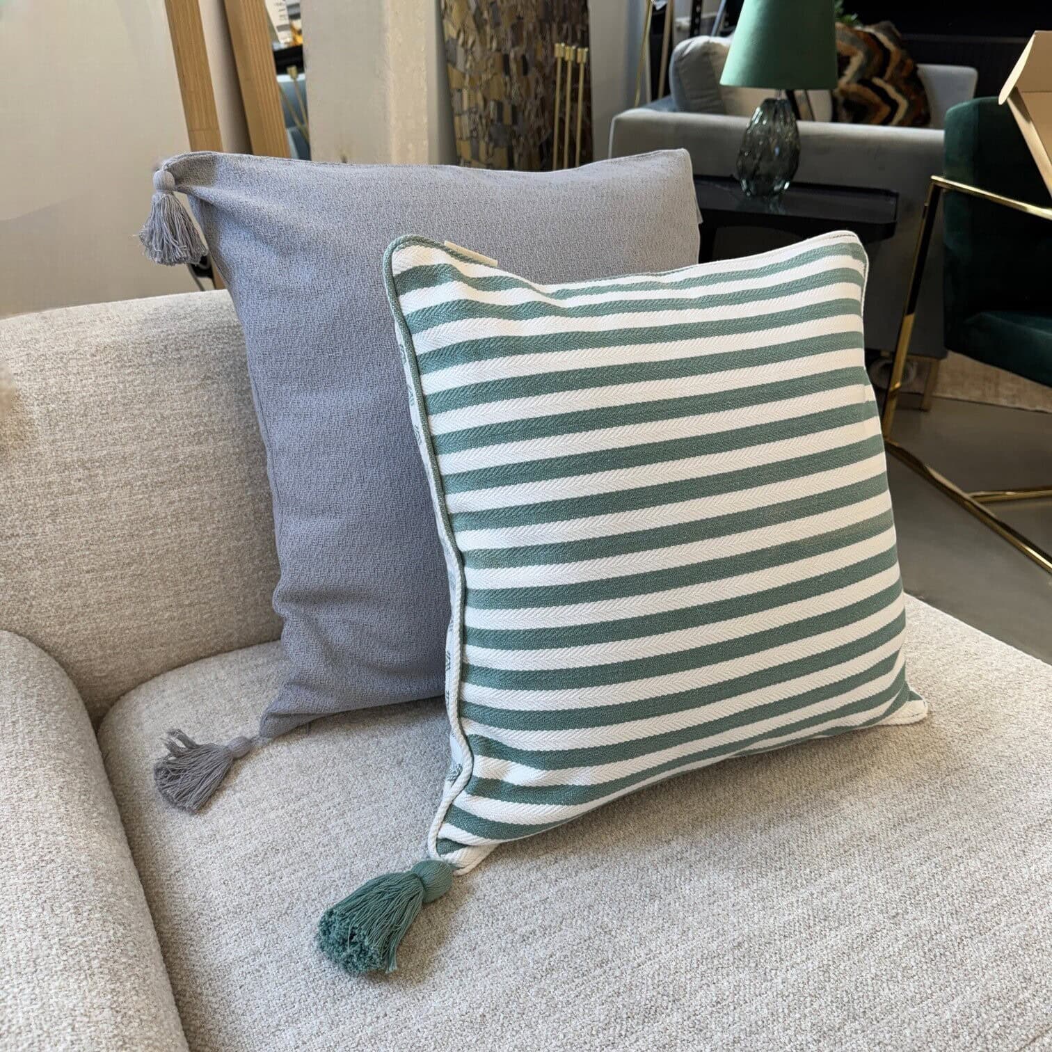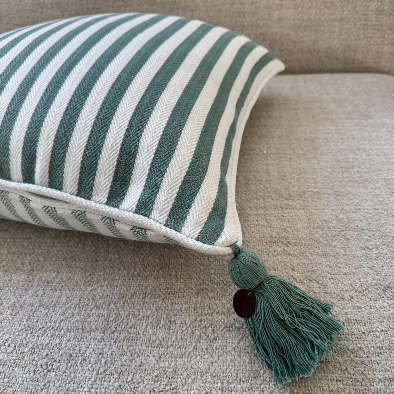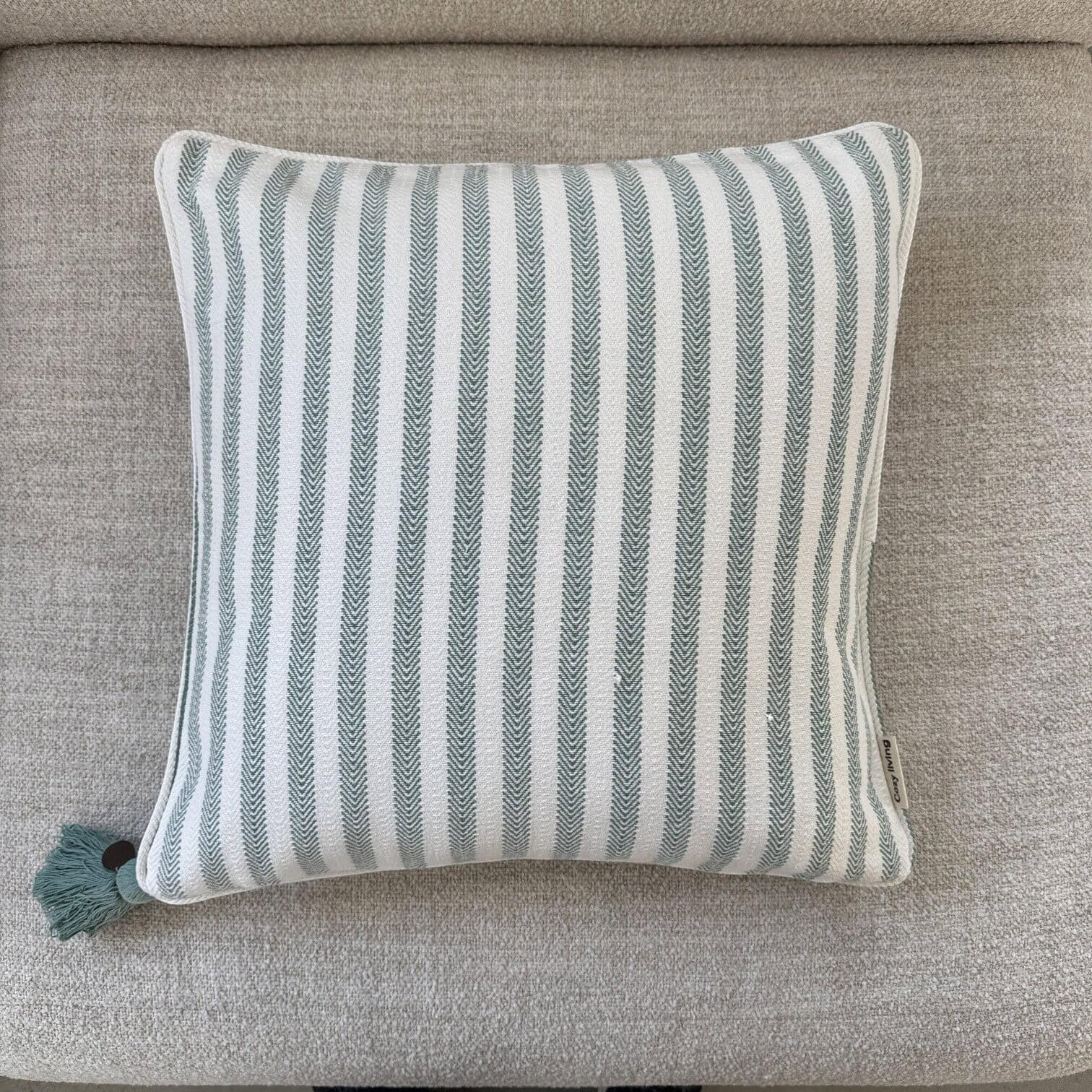 Šī stilīgā dekoratīvā spilvendrāna piešķirs jūsu mājoklim svaigu un harmonisku noskaņu. Smalki austais svītrainais raksts zaļganos un baltos toņos lieliski iederas gan skandināvu, gan klasiskā interjerā, radot mājīgu un gaumīgu atmosfēru.
