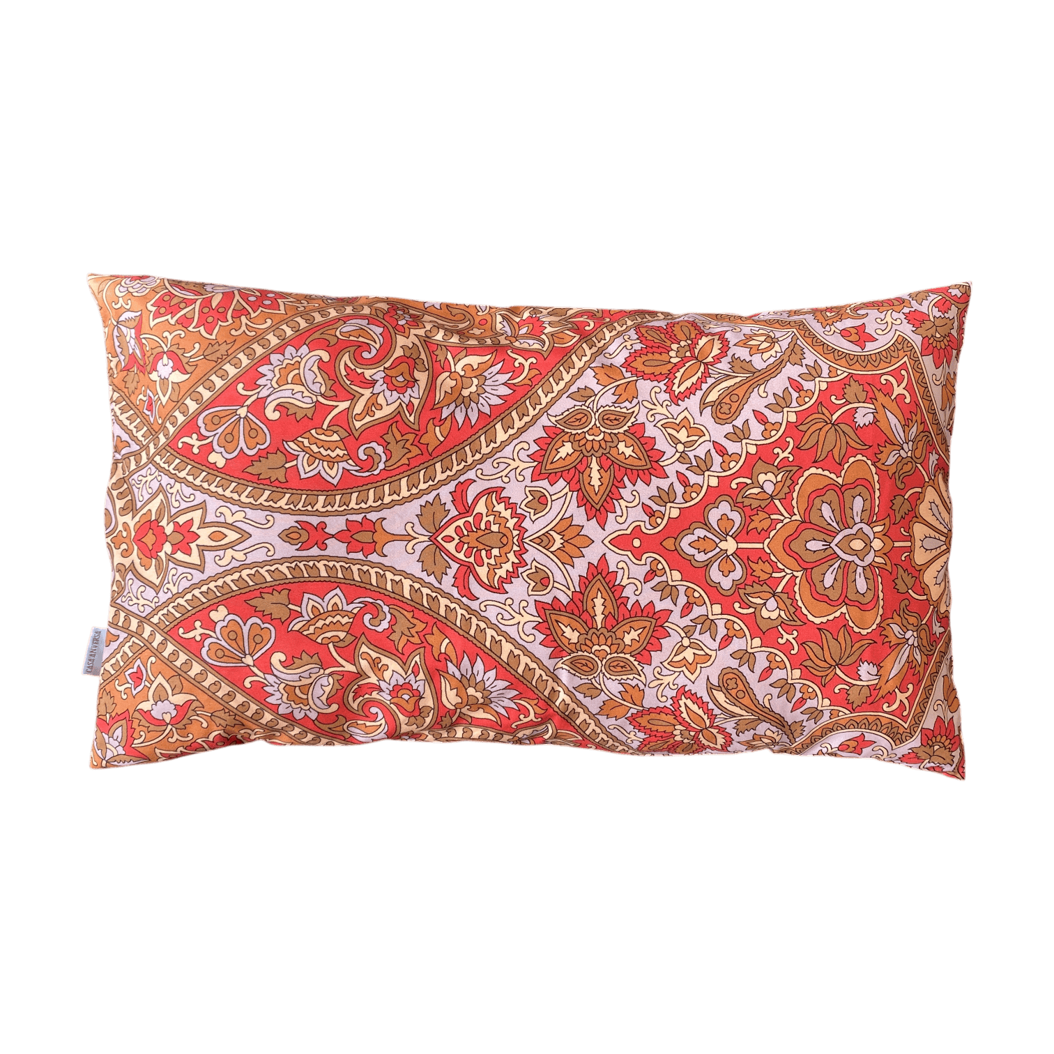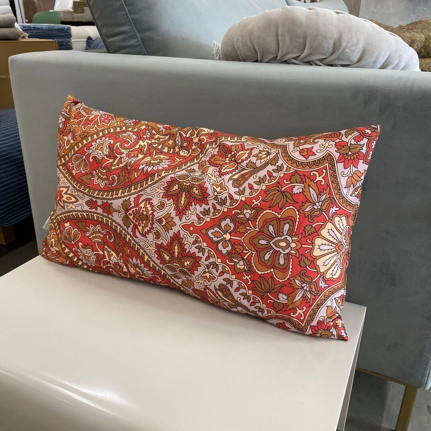 Košs un izteiksmīgs dekoratīvais spilvens ar bagātīgu paisley un ziedu ornamentu apdruku siltos sarkanīgos, oranžos un bēšos toņos. Smalki izstrādātais raksts piešķir interjeram dinamiku un elegantu akcentu, lieliski papildinot gan klasisku, gan bohēmisku vai modernu iekārtojumu.