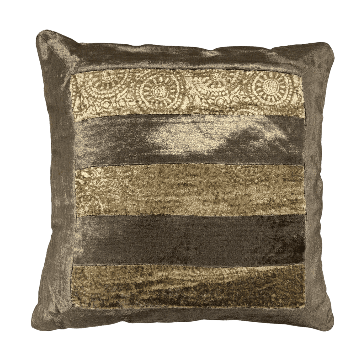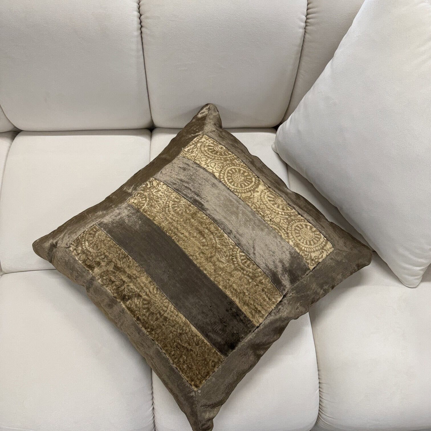 Izsmalcināts dekoratīvais spilvens elegantos gaišos toņos ar bagātīgu tekstūru un smalku rakstu kombināciju. Dažādu audumu joslas ar reljefiem ornamentiem piešķir spilvenam dziļumu un greznu raksturu, savukārt samtainā apdare nodrošina patīkamu pieskārienu. Ideāli piemērots viesistabai vai guļamistabai, lai interjeram piešķirtu siltumu un izsmalcinātību.