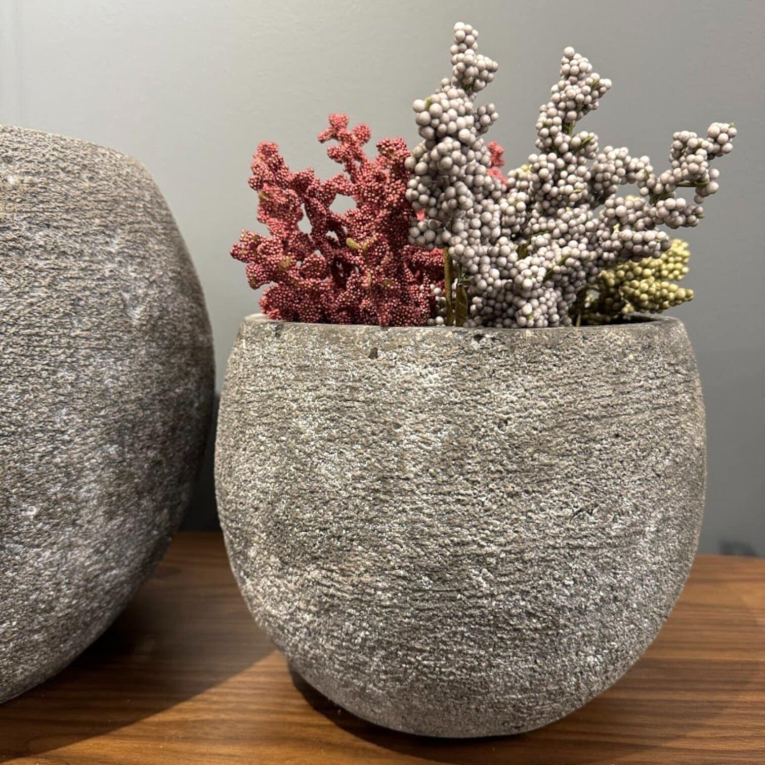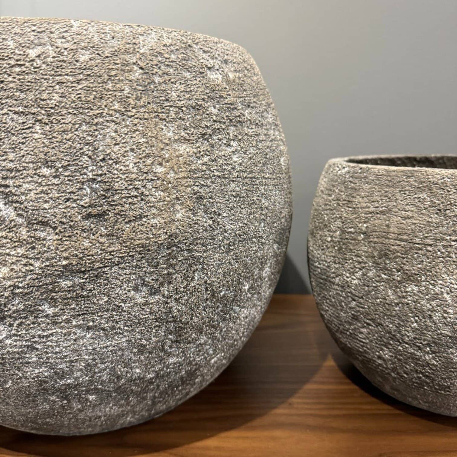 Divu lielu puķu podu komplekts, kas veidots no cementa dabīgos, pelēkos un bēšos toņos. Puķu podi ir veidoti minimālistiskā formā, lieliski izceļot augus un radot estētisku akcentu istabā, dārzā vai uz balkona. Šis podu komplekts derēs arī ne tikai kā pods puķēm vai lieliem zaļiem augiem, bet arī garšaugiem.