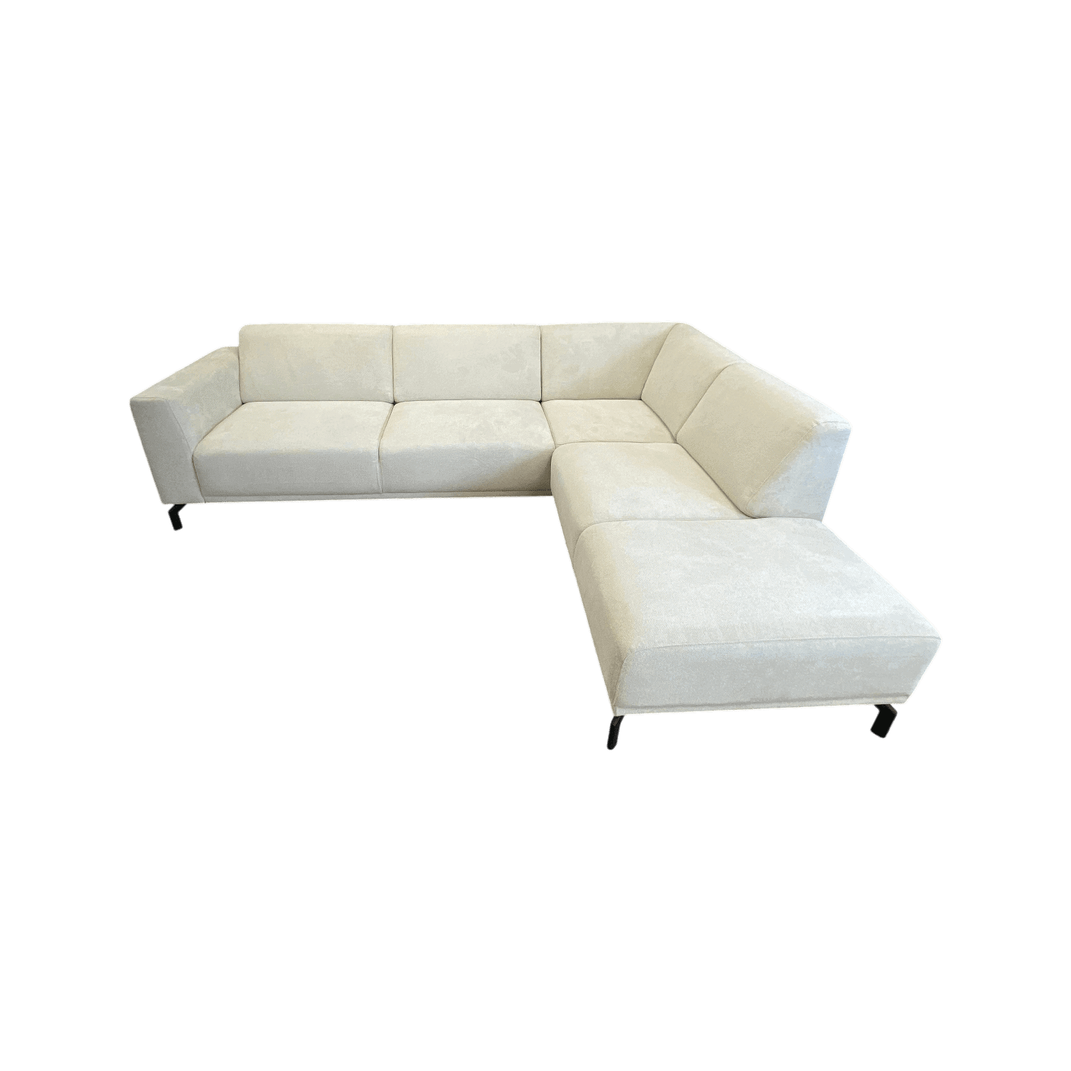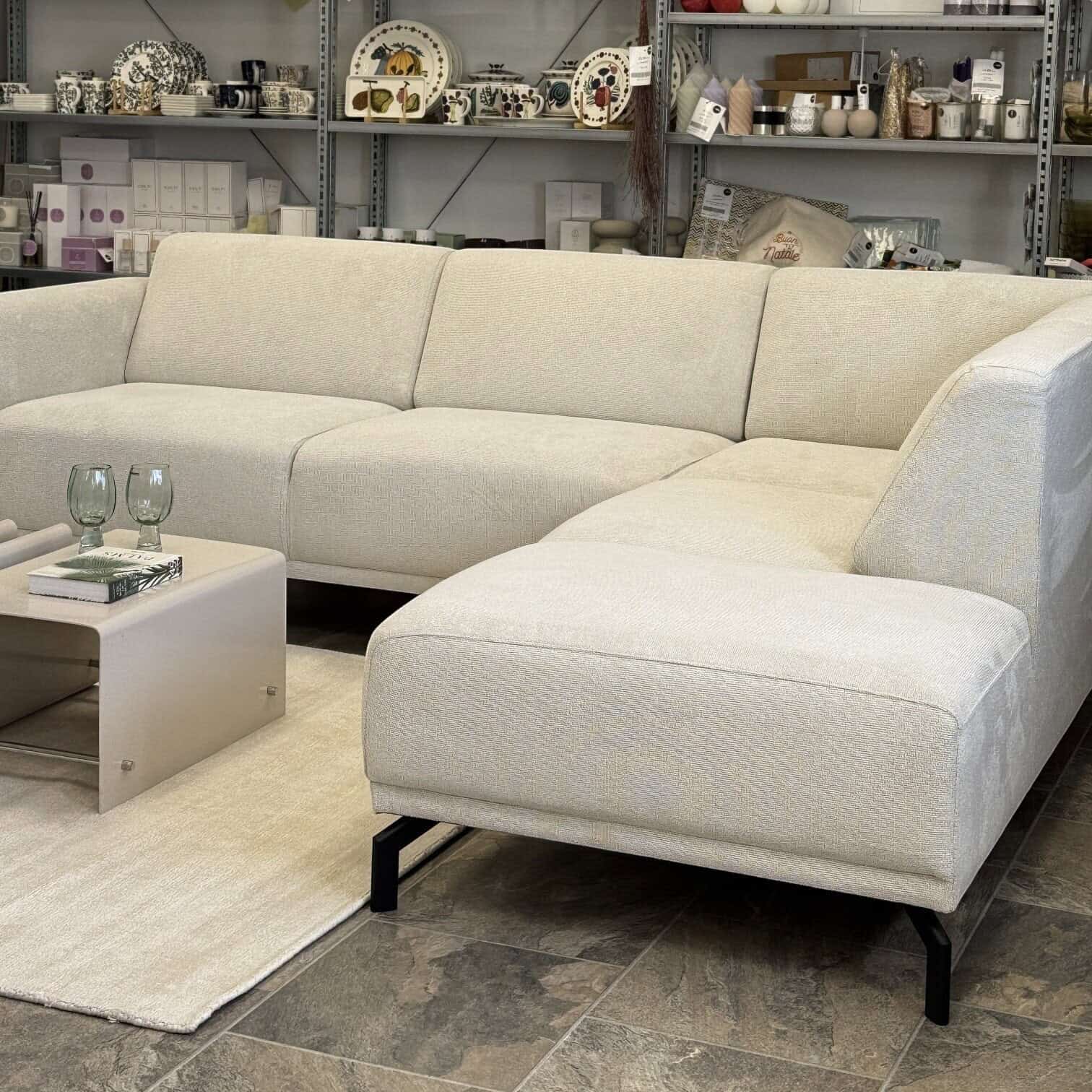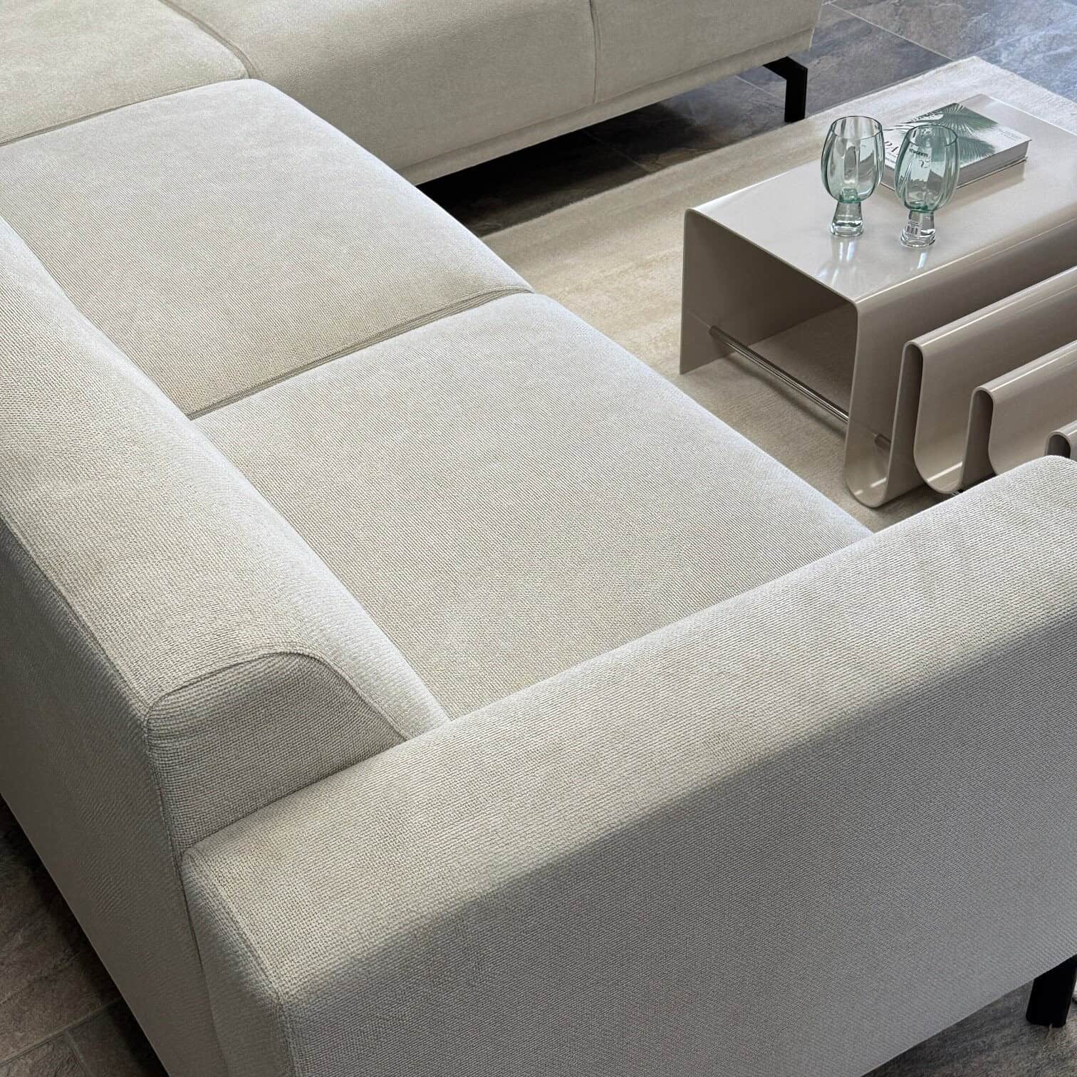 Dīvāns ir apvilkts ar patīkamu, teksturētu audumu neitrālā tonī, kas viegli saskaņojams ar dažādiem interjera stiliem – no skandināviska minimālisma līdz modernai klasikai. Mīkstie, dziļie sēdekļi un ergonomiska atzveltne nodrošina izcilu komfortu, savukārt plašais pagarinājums ļauj ērti izstiept kājas un pilnībā relaksēties.