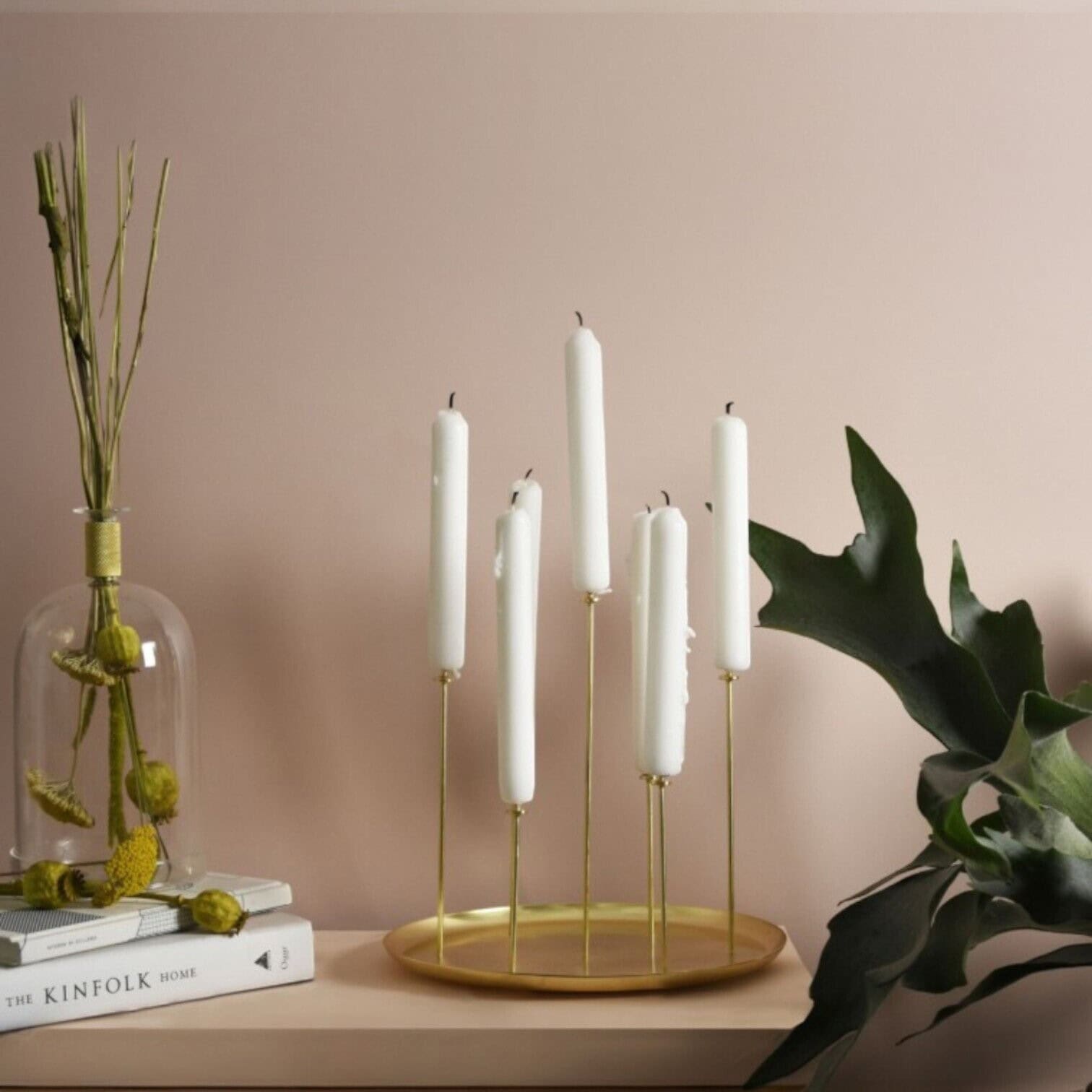 Šis elegantais svečturis apvieno modernu minimālismu ar smalku luksusa pieskārienu. Uz zeltainā metāla paliktņa izvietotās garenās kājiņas rada viegluma un gaisīguma sajūtu un papildinot ar svecēm iegūstiet nepieciešamo noskaņu. Dizains ir gan estētisks, gan funkcionāls — dažāda augstuma sveces veido dinamisku siluetu, kas izceļas jebkurā interjerā.