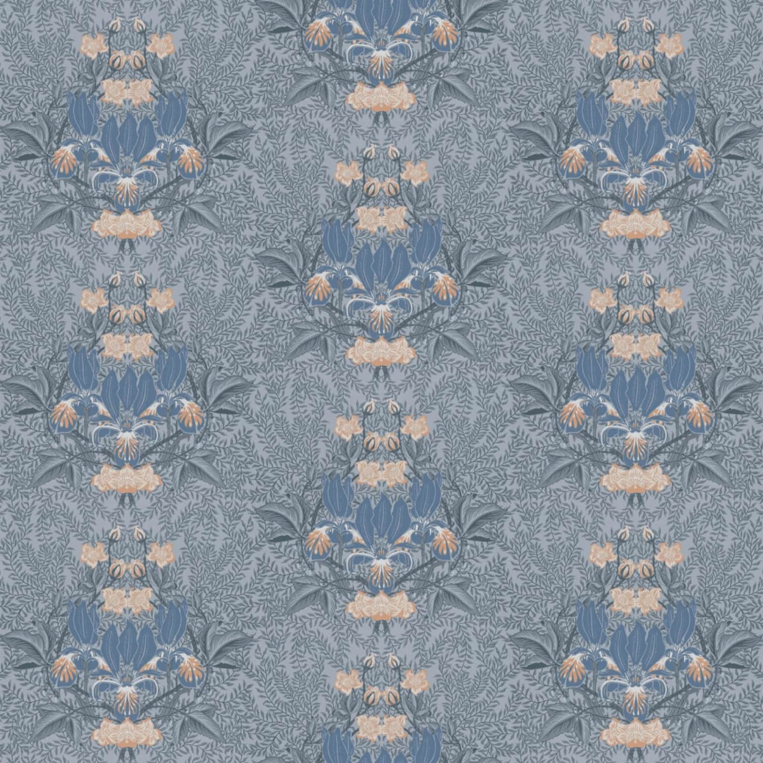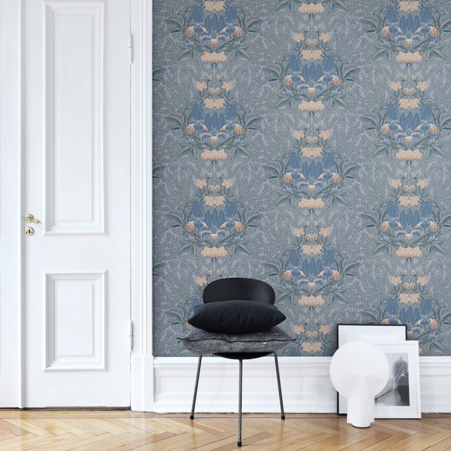 Skaista īrisa zieda un lapu fona kompozīcija veido tradicionālu medaljona rakstu ar mūsdienīgu akcentu. Šeit attēlots zilajā tonī, kas piešķirs jebkurai telpai izteiktu raksturu.