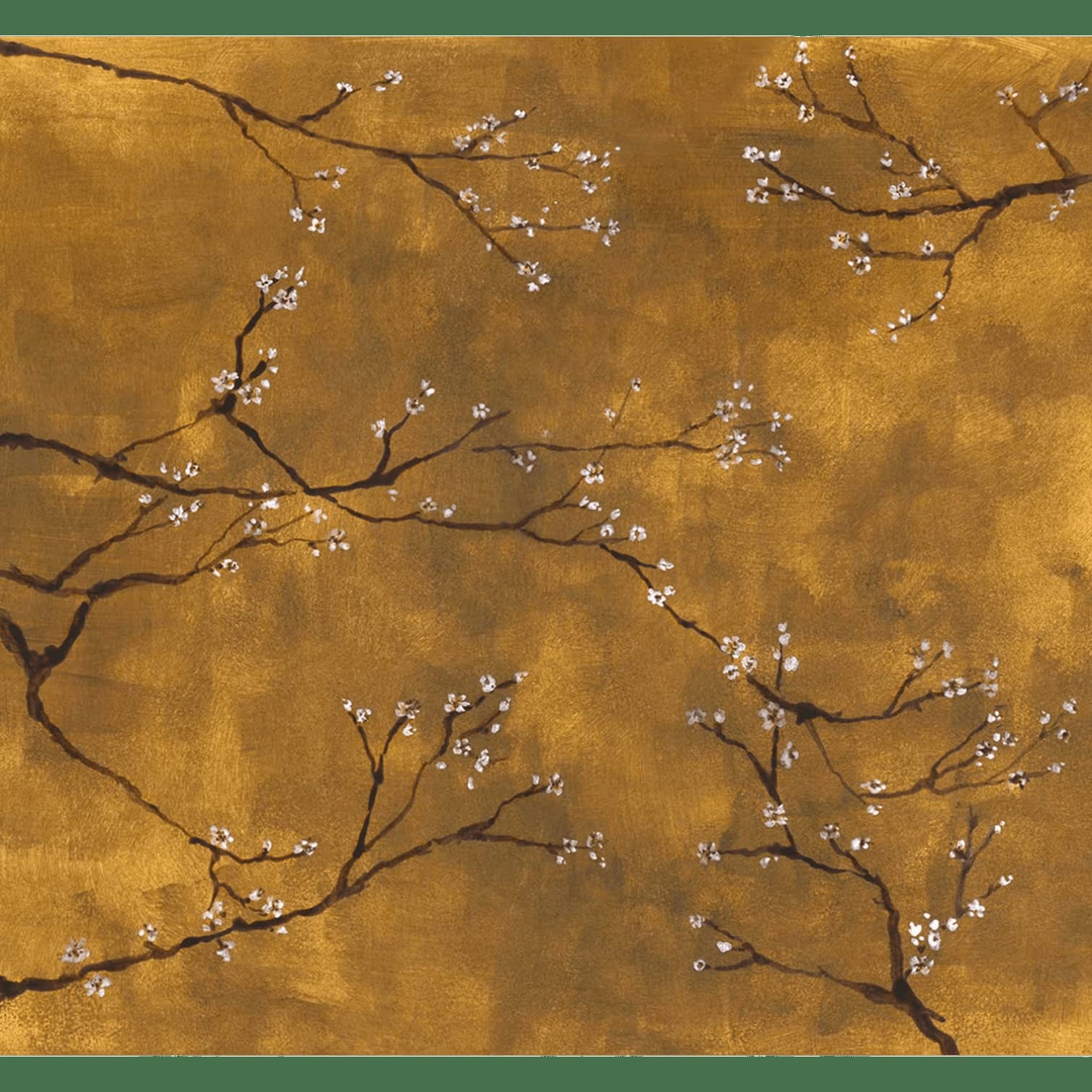 Art For The Home „Chinese Bloesem” tapete ir eleganta un izteiksmīga fona fototapete, kas interjerā ienes Austrumu dārza maģiju. Uz maigi silta, zeltaini dzeltenīga fona plaukst bagātīgs ziedu motīvs — smalki ziedi, zari un lapas, kas kopā veido harmonisku un līdzsvarotu kompozīciju.
