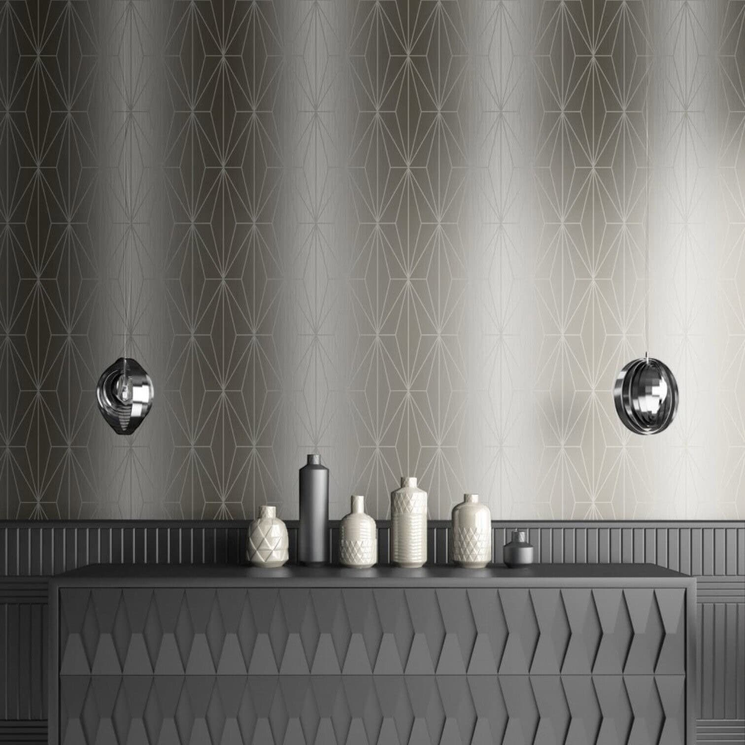 Tapetes ir īsti piemērotas modernam interjeram — tās var izmantot gan kā galveno sienas segumu, gan ievilkt kā dekoratīvu akcentu. Sudraba metāliskie elementi rada elegantu un nedaudz greznu noskaņu, turklāt ģeometriskais raksts piešķir telpai arhitektonisku harmoniju.