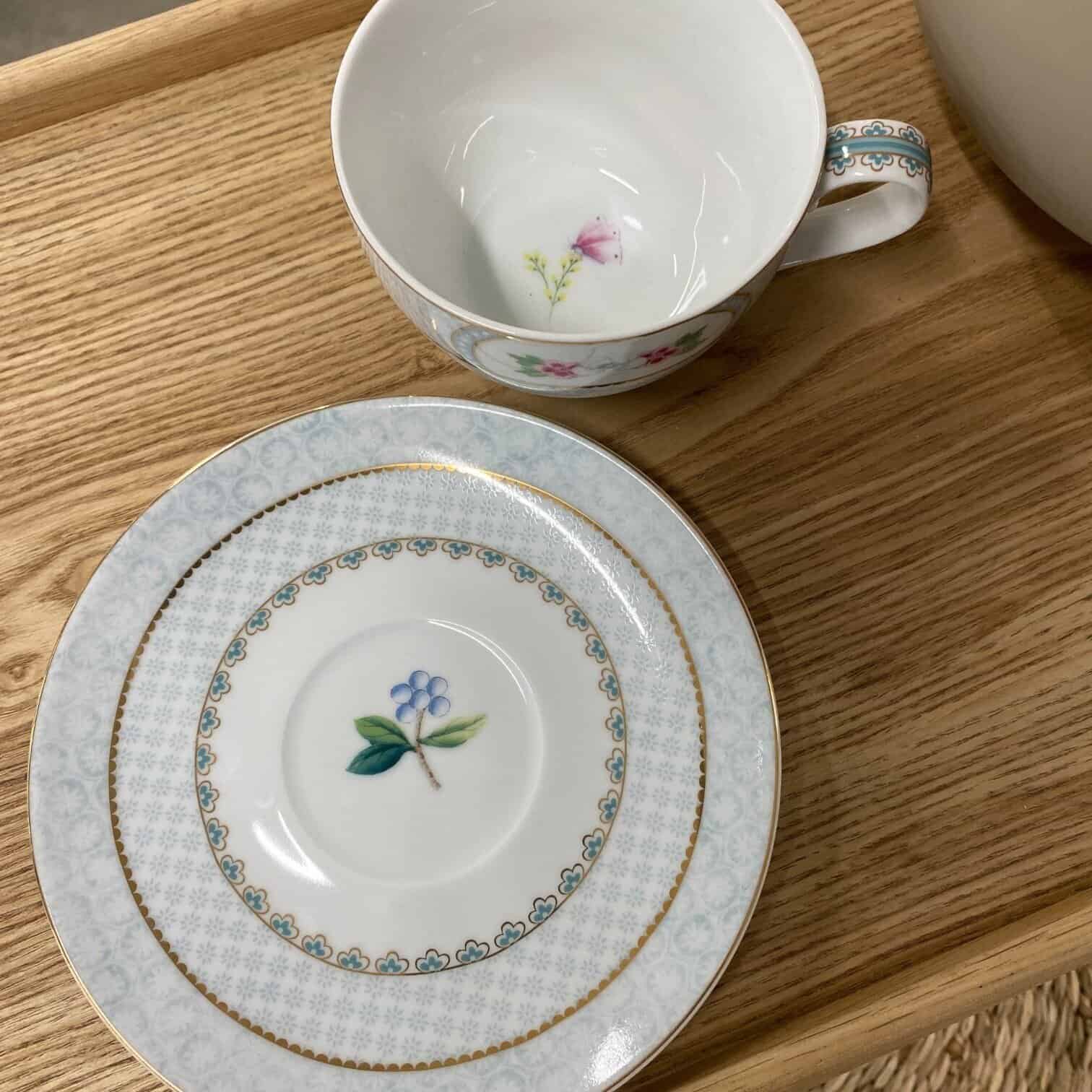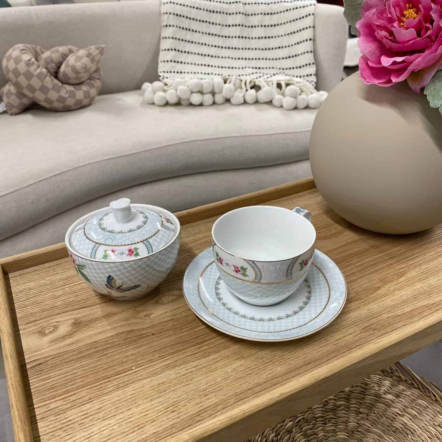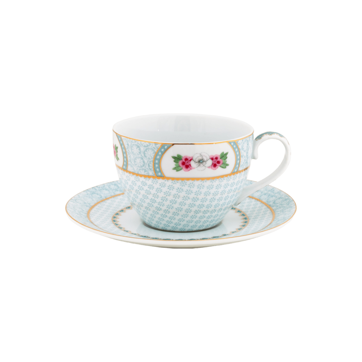 Šī kafijas tase un apakštase ir dekorētas ar zilu dizainu, eksotiskiem ziediem un zelta detaļām. Lieliski apvienojas ar citiem kafijas vai tējas trauku komplektiem no Blushing Birds kolekcijas.