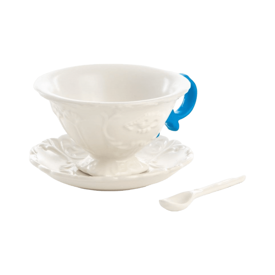 Smalks, necaurspīdīgs porcelāns ar matēti baltu apdari un fluorescējošas krāsas rokturiem.